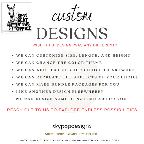 Looking for a custom design, or do you love a particular design but need it in a different size or orientation? Perhaps you've found a design elsewhere and wish for us to create something similar for you? Drop us a message! We're dedicated to meeting your needs and will work closely with you to ensure your vision comes to life.