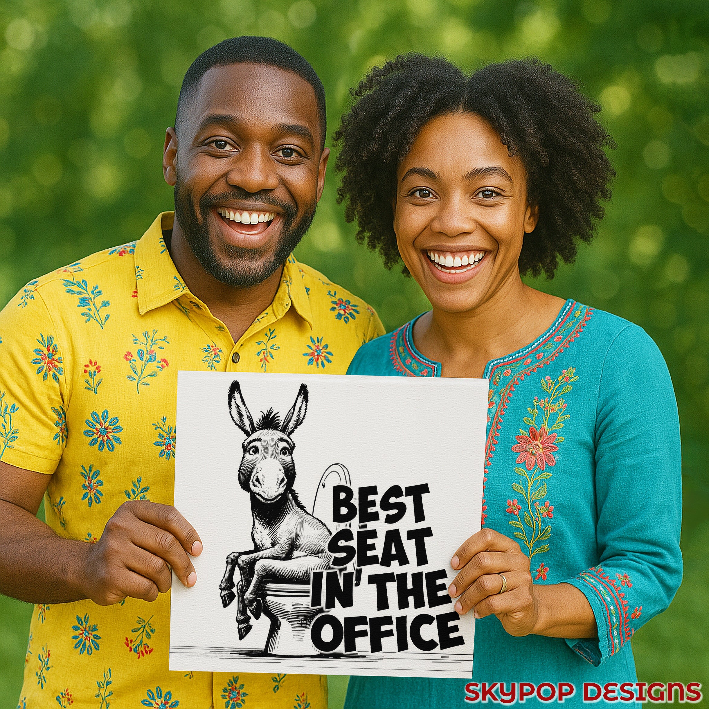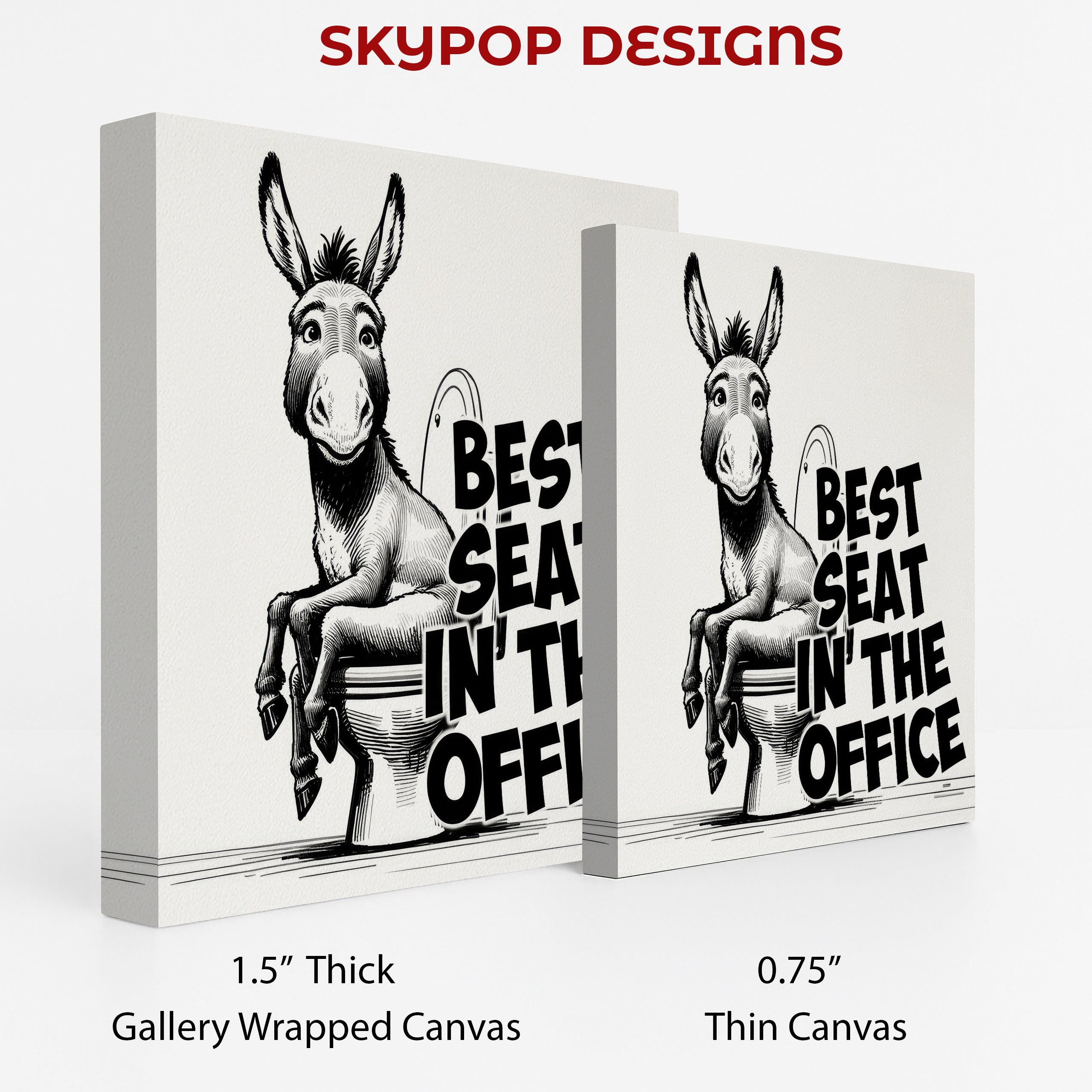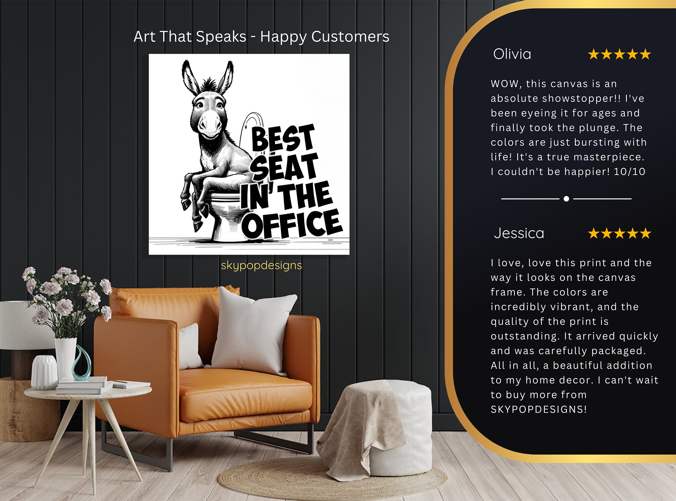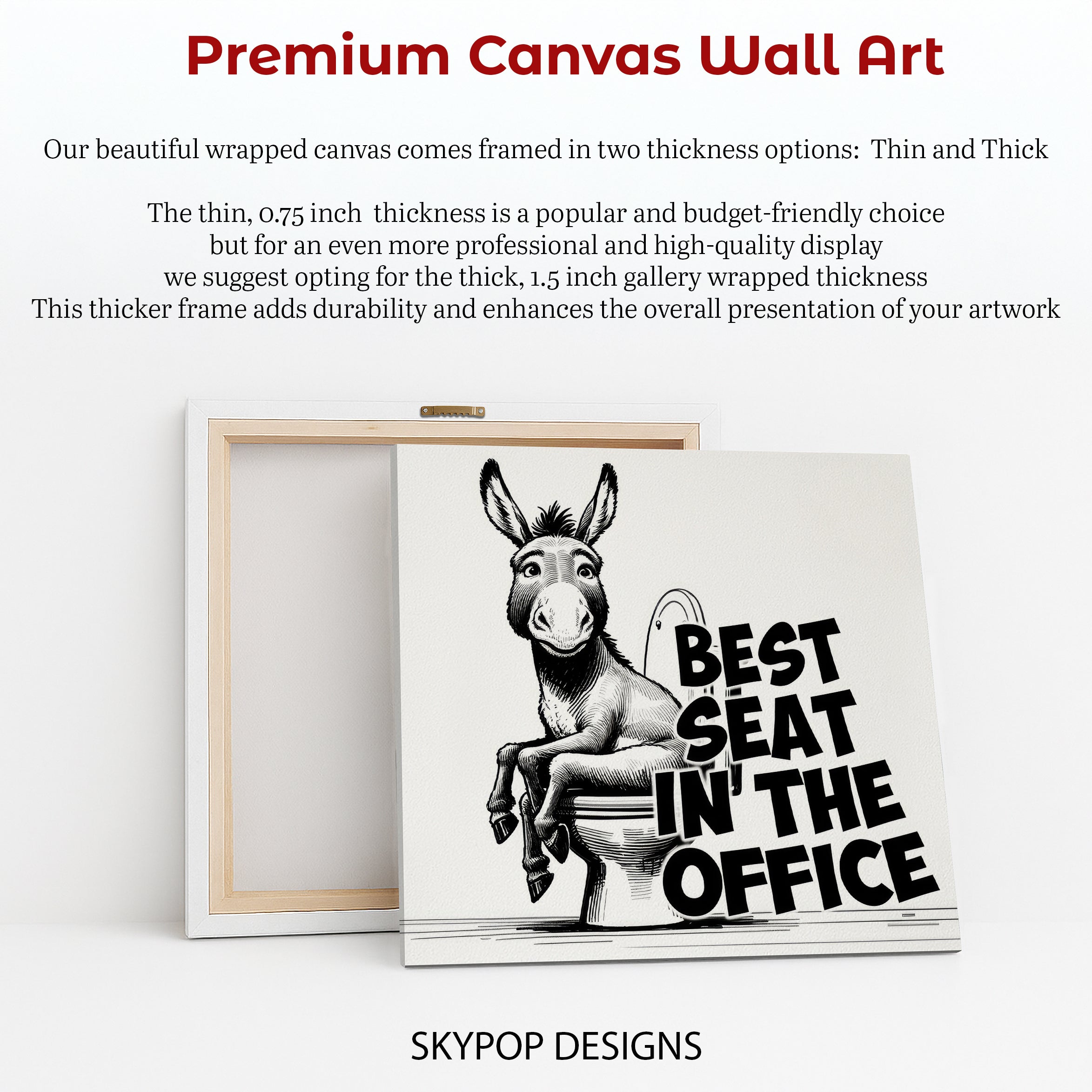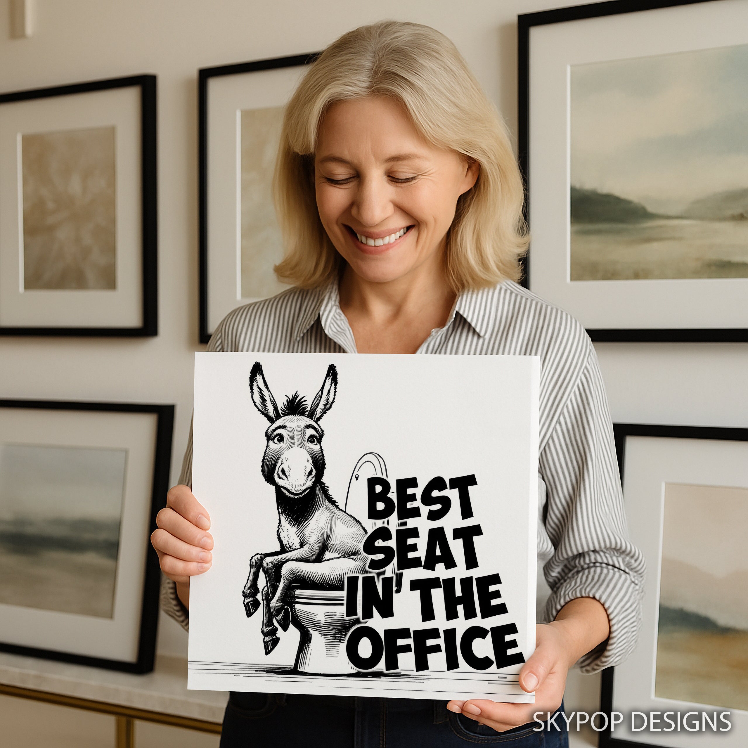 Add a touch of humor to your space with this eye-catching donkey canvas wall art featuring a donkey sitting on a toilet with the bold text Best Seat In The Office. This striking pop art piece transforms any room into a conversation starter. The high-contrast black and white design with playful multicolor elements makes this poster a versatile addition to modern decor. Perfect for an office, bathroom, or even a game room, this canvas wall art brings personality and a lighthearted vibe. It's an ideal gift for a birthday or housewarming, bringing a smile to anyone's face. This unique artwork celebrates humor and adds a quirky charm to your wall decor. The dynamic composition on this poster ensures it will be a focal point, enhancing the atmosphere of your chosen space. Elevate your home or office with this fun and memorable piece of wall art. The quality printing ensures crisp details, making this canvas print a standout choice for your collection. Bring a sense of playful sophistication to your home decor today.