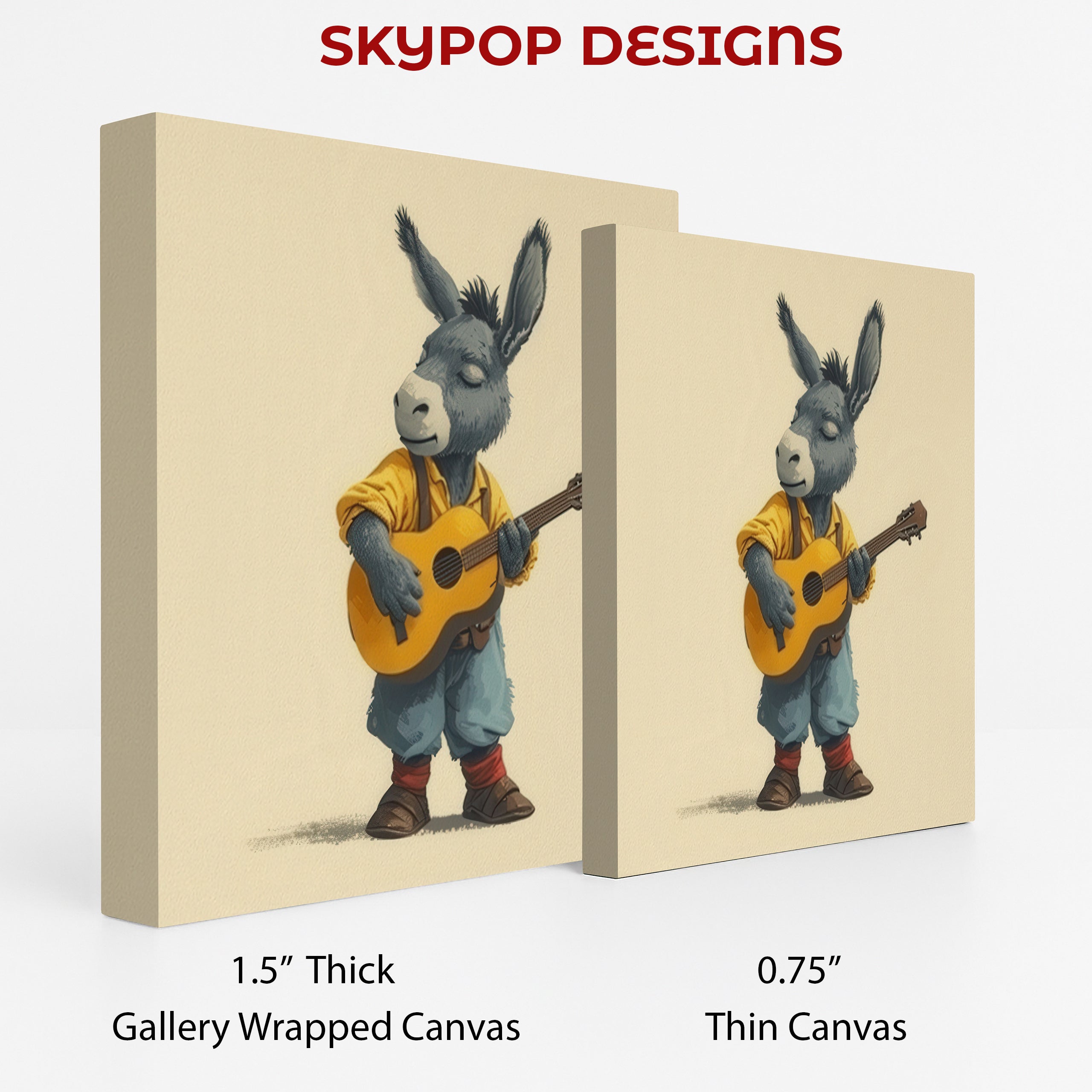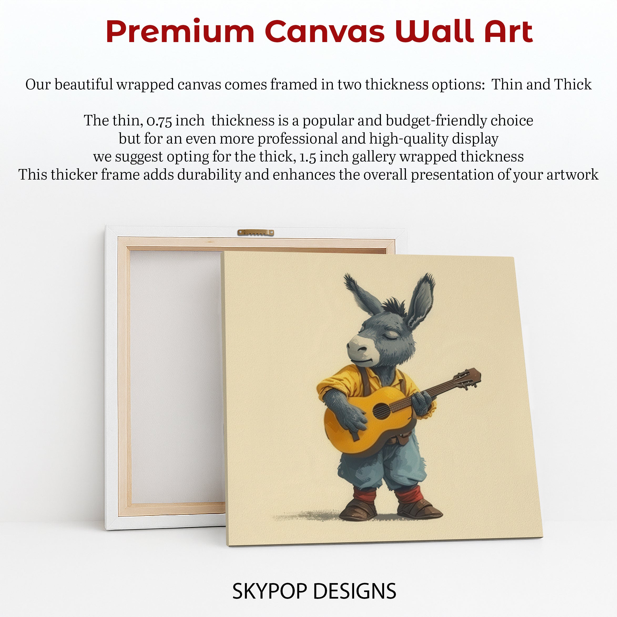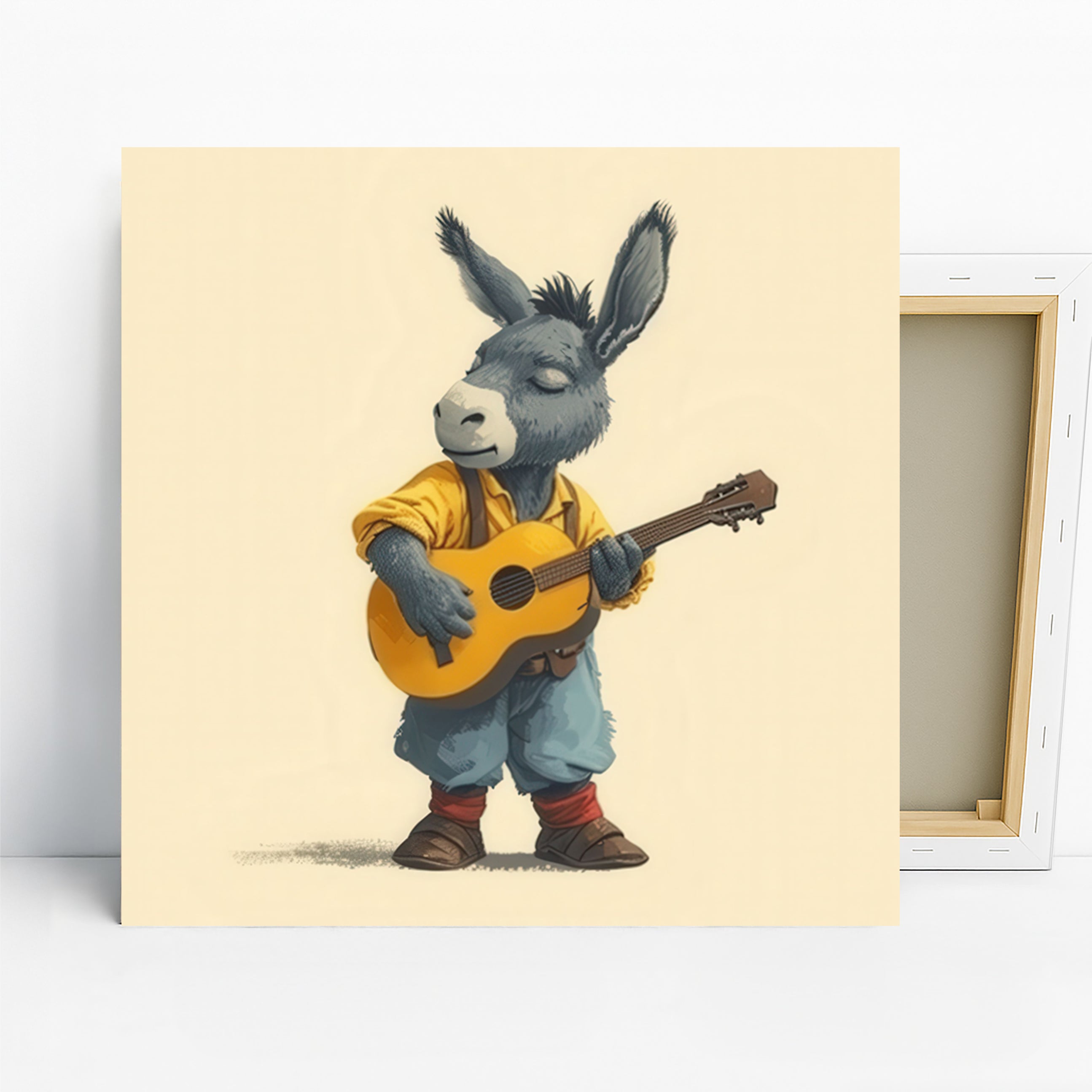 Bring a smile to your face with this charming Donkey playing Guitar canvas wall art, a delightful piece perfect for any music lover. This unique poster captures the joyful spirit of a donkey strumming a guitar, adding a playful and whimsical touch to your home decor. The vibrant yellow shirt and blue overalls stand out against the muted background, creating a striking visual that will transform any room into a cheerful space. This canvas wall art is ideal for bohemian or farmhouse themed living rooms, adding personality and warmth to your decor. It also makes a fantastic addition to a children's room or game room, sparking imagination and conversation. The detailed artwork showcases the donkey's expressive eyes as it enjoys its music, making this poster a captivating focal point. Great as a housewarming gift or a birthday surprise, this versatile wall art celebrates the simple pleasures of life. High-quality printing ensures the rich colors and textures are preserved, making this canvas art a lasting addition to your collection. Let this endearing donkey artwork inspire happiness and creativity in your daily life. Elevate your space with this unique blend of animal art and playful storytelling. This poster is more than just wall art; it's a guaranteed mood booster, bringing a touch of fun and whimsy into your home. Add this eye-catching donkey canvas wall art to your decor and create an atmosphere of joy and harmony today.