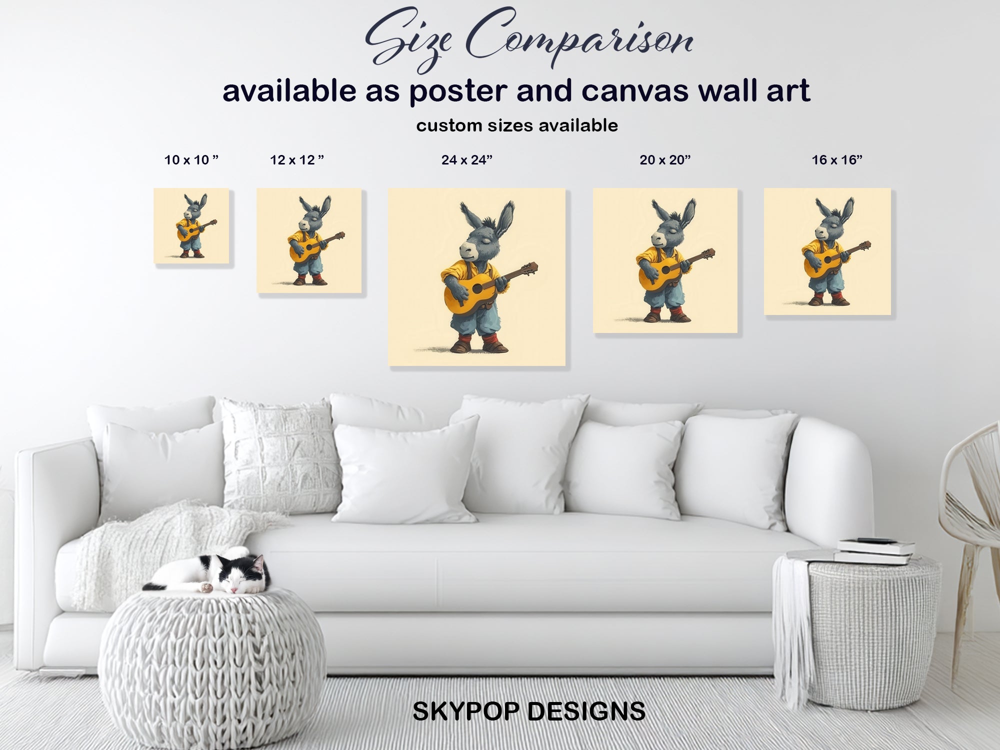 Donkey Playing Guitar Art, Canvas or Poster, Whimsical Animal Decor, Living Room Childrens Bedroom Game Room Wall Art, Yellow Blue Brown