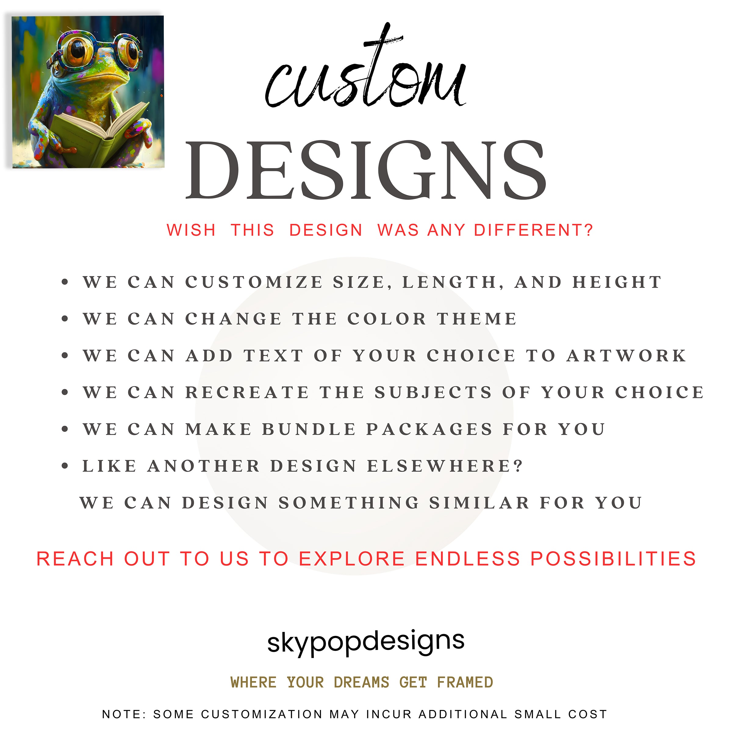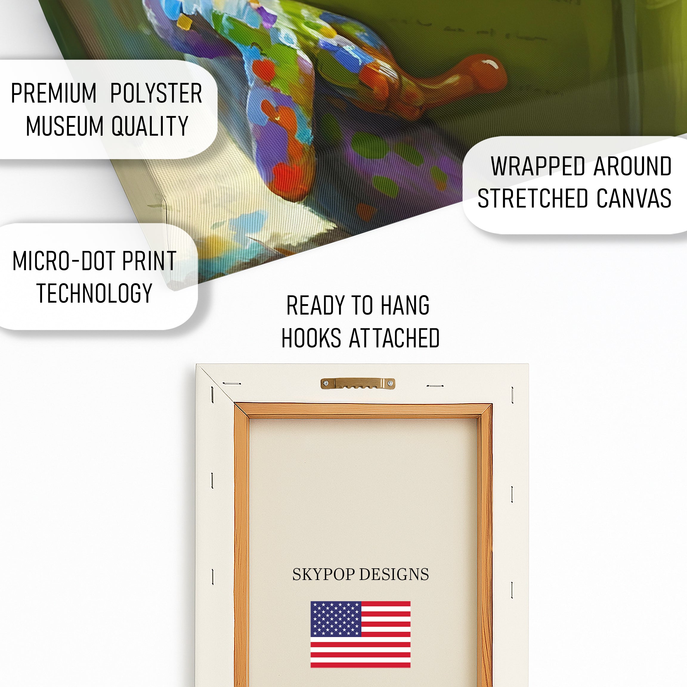 Keywords: Frog art, Whimsical decor, Pop art print, Canvas wall art, Multicolor art, Green artwork, Blue decor, Yellow accent, Living room art, Children's room decor, Office wall art, Game room art, Bohemian style, Modern decor, Animal art, Frog painting, Scholarly frog, Reading frog, Book lover gift, Housewarming gift, Unique wall art, Inspirational art, Creative space decor, Eclectic decor, Vibrant art, Painterly brushstrokes, Textured art, Kids room art, Educational decor, Fun wall art