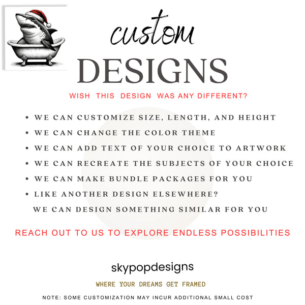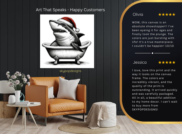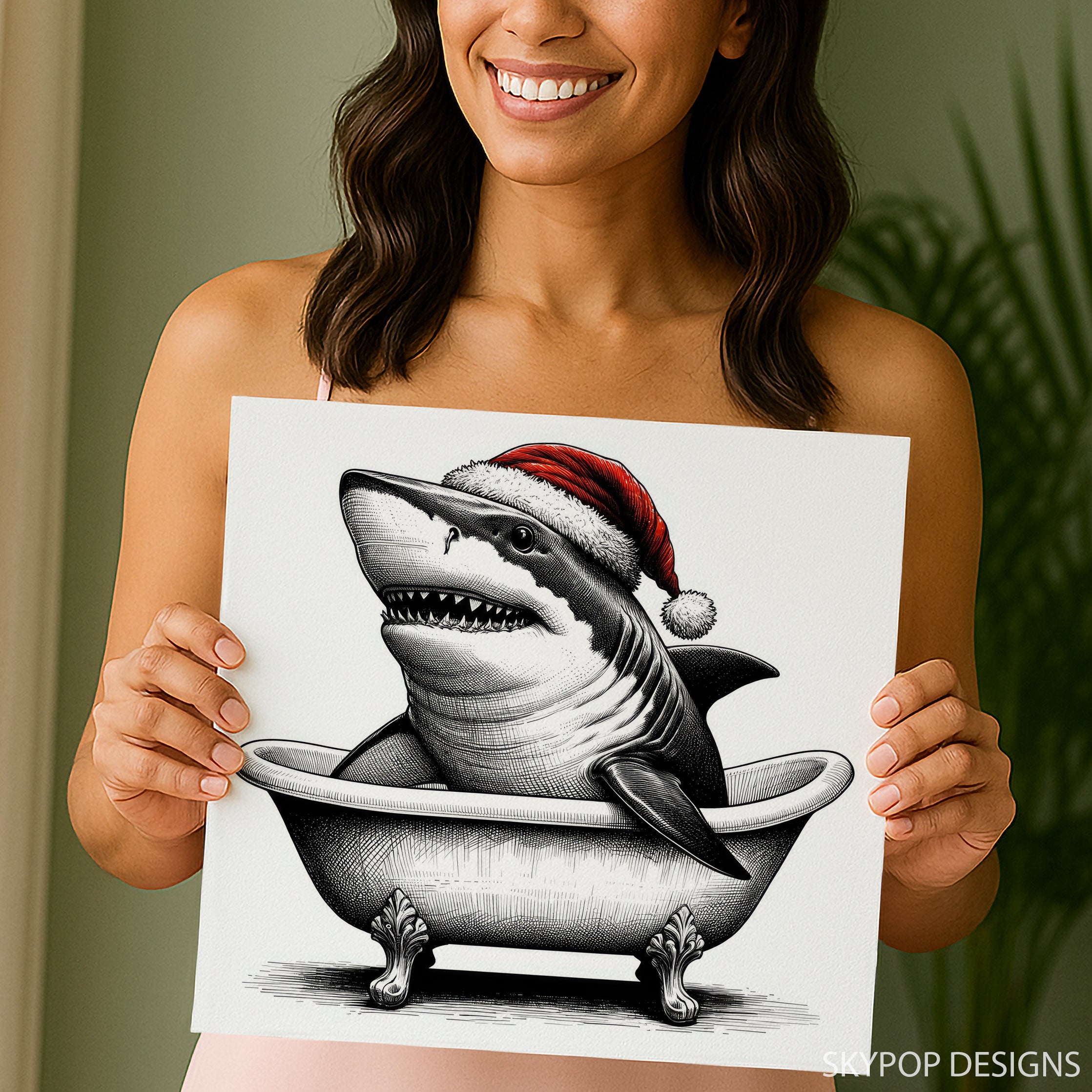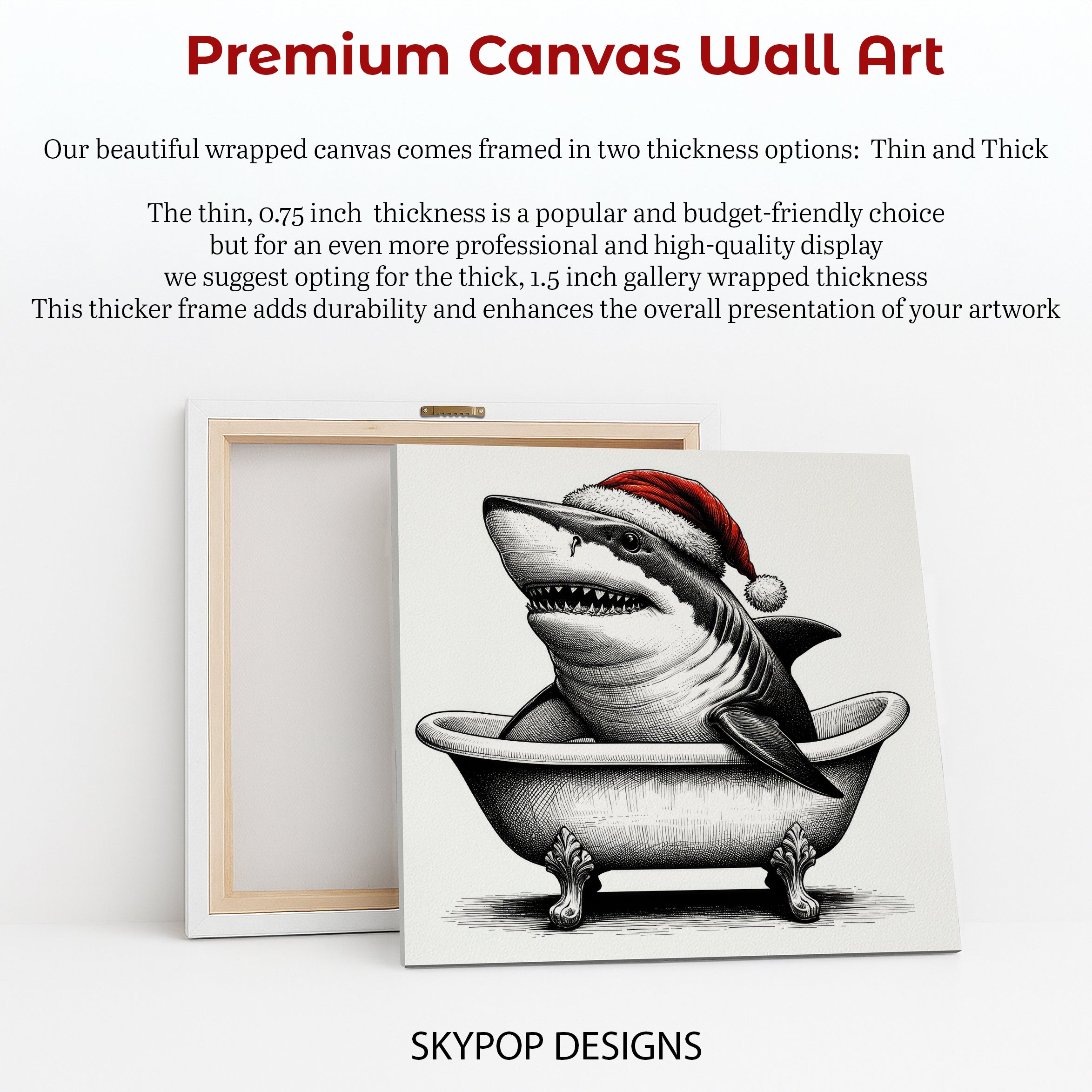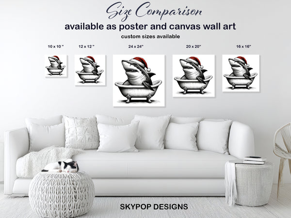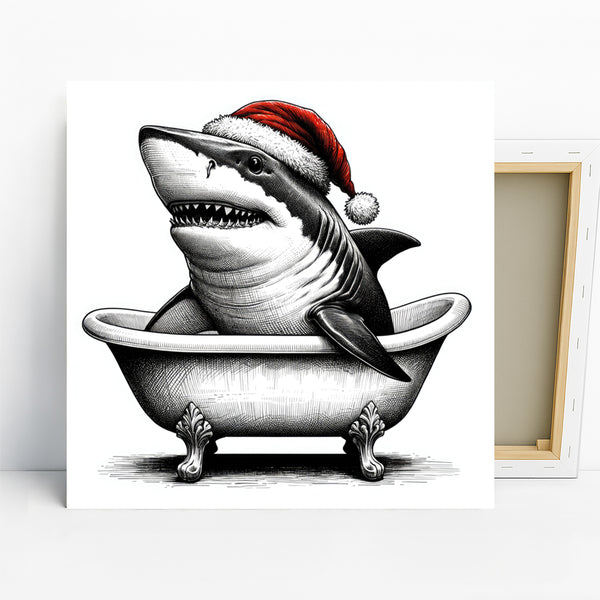 Bring a splash of humor to your walls with this unique canvas wall art featuring a festive shark in a bathtub wearing a Santa hat. This eye-catching poster is perfect for adding a touch of playful holiday spirit to any space. The striking black and white illustration with a vibrant red Santa hat makes this canvas print a conversation starter. It's ideal for modern bathrooms, quirky offices, or even a fun living room accent. This whimsical animal art piece will transform your entertainment areas and bedrooms. Showcase your personality with this fun and festive wall art addition, creating a lighthearted atmosphere. The detailed sketch style of the shark and claw-foot tub adds a classic yet contemporary feel to this popular art style. It’s a fantastic gift for shark lovers, holiday enthusiasts, or as housewarming present that really stands out. This striking poster enhances any room, adding a bold statement without overwhelming the decor. High-quality printing ensures vivid detail and longevity for your new favorite piece of wall art. Elevate your home's aesthetic with this fun and memorable artwork today.