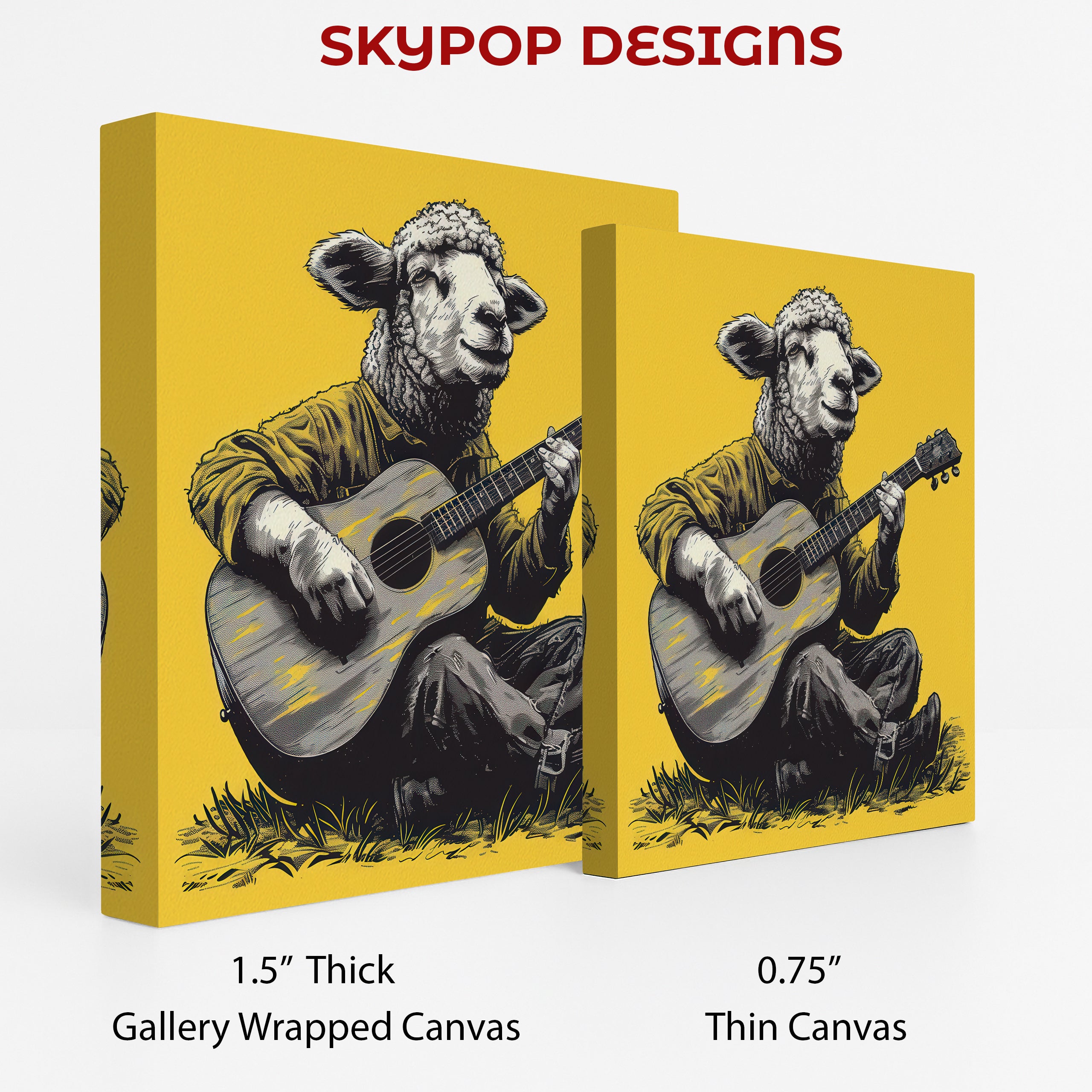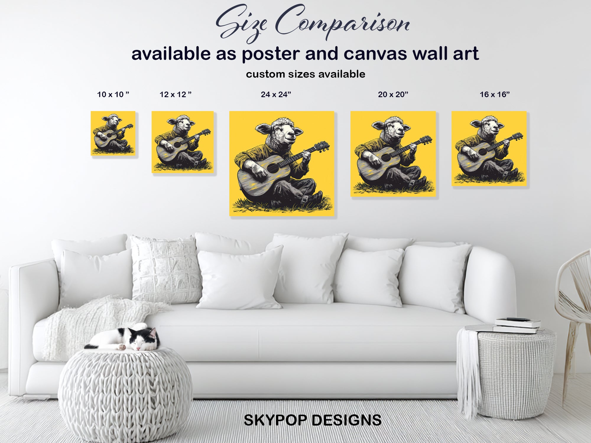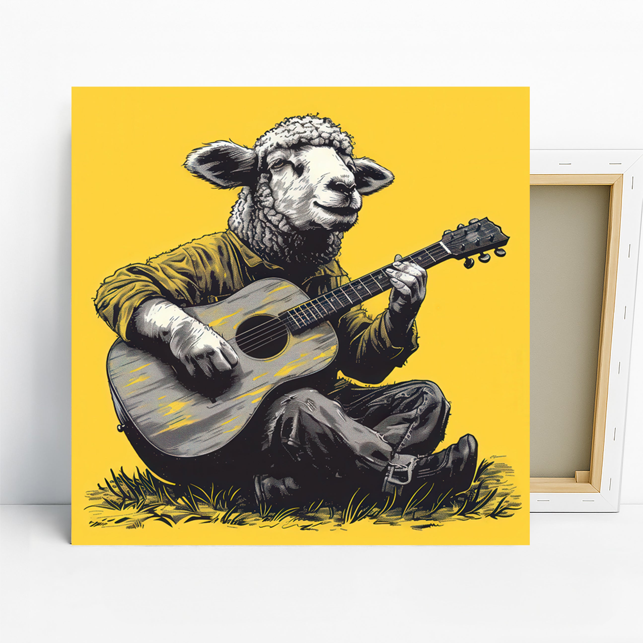 Keywords: Sheep wall art, Guitar playing sheep, Animal art print, Impressionism art, Contemporary art, Bohemian decor, Modern decor, Rustic decor, Living room art, Bedroom art, Game room decor, Sunroom art, Yellow wall art, Black and white art, Multicolor art, Music lover gift, Animal collector gift, Birthday gift, Holiday gift, Housewarming gift, Canvas wall art, Wall decor, Home decor, Statement art, Unique art, Graphic art, Whimsical art, Joyful art, Creative decor, Music and nature