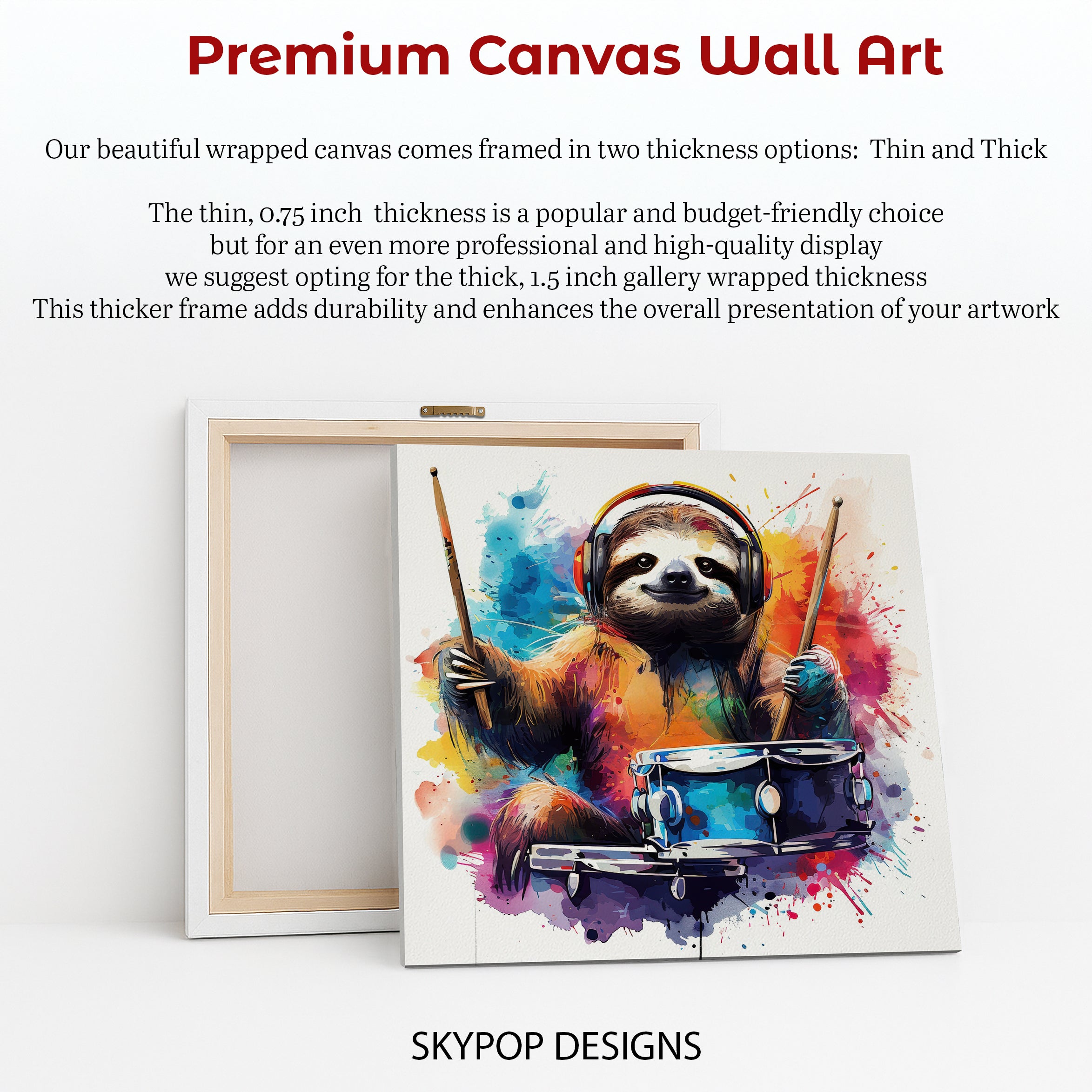 Transform your space with this vibrant and energetic sloth canvas wall art, featuring a cool sloth rocking out on a drum set. This captivating piece of contemporary animal art brings a playful and musical vibe to any room, perfect for music lovers and animal enthusiasts alike. The striking multicolor abstract background, with its dynamic splashes of blue, orange, and purple, makes this poster a real statement piece. Elevate your living room, bedroom, or office with this unique artwork that celebrates personality and creativity, making it an ideal addition for modern and bohemian decor styles. This canvas wall art is more than just decor; it’s a mood enhancer, bringing a sense of fun and rhythm into your home. It’s a fantastic gift for birthdays, housewarmings, or any occasion for someone who loves music or quirky art. The artistic style captures the lively spirit of drumming, transforming a simple scene into a visually stunning composition. This poster offers a modern take on animal art, adding a pop of color and character to your walls. Showcase your unique taste and add a joyful element to your home. This quality canvas wall art is designed to inspire and delight. Get this amazing piece to instantly upgrade your wall decor.
