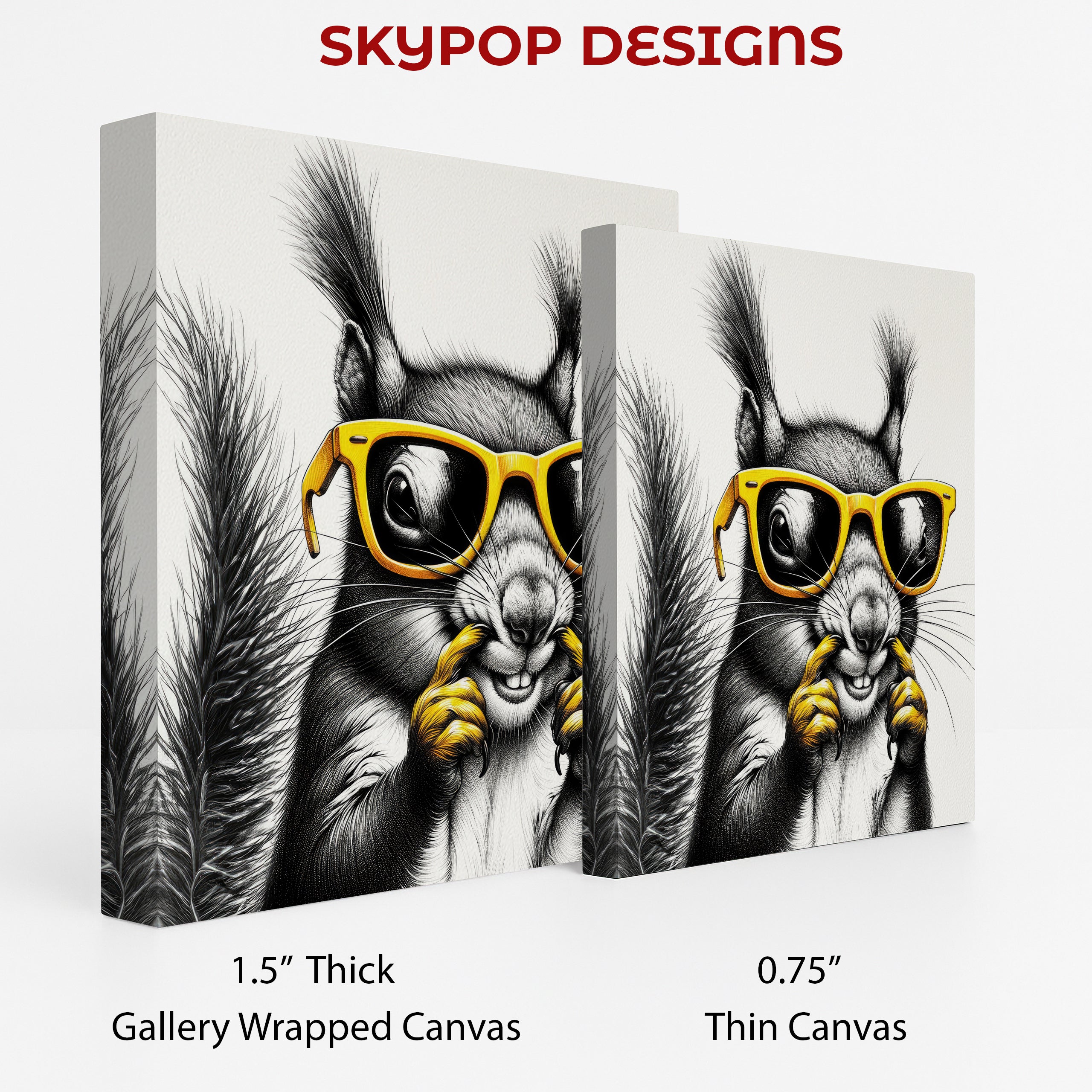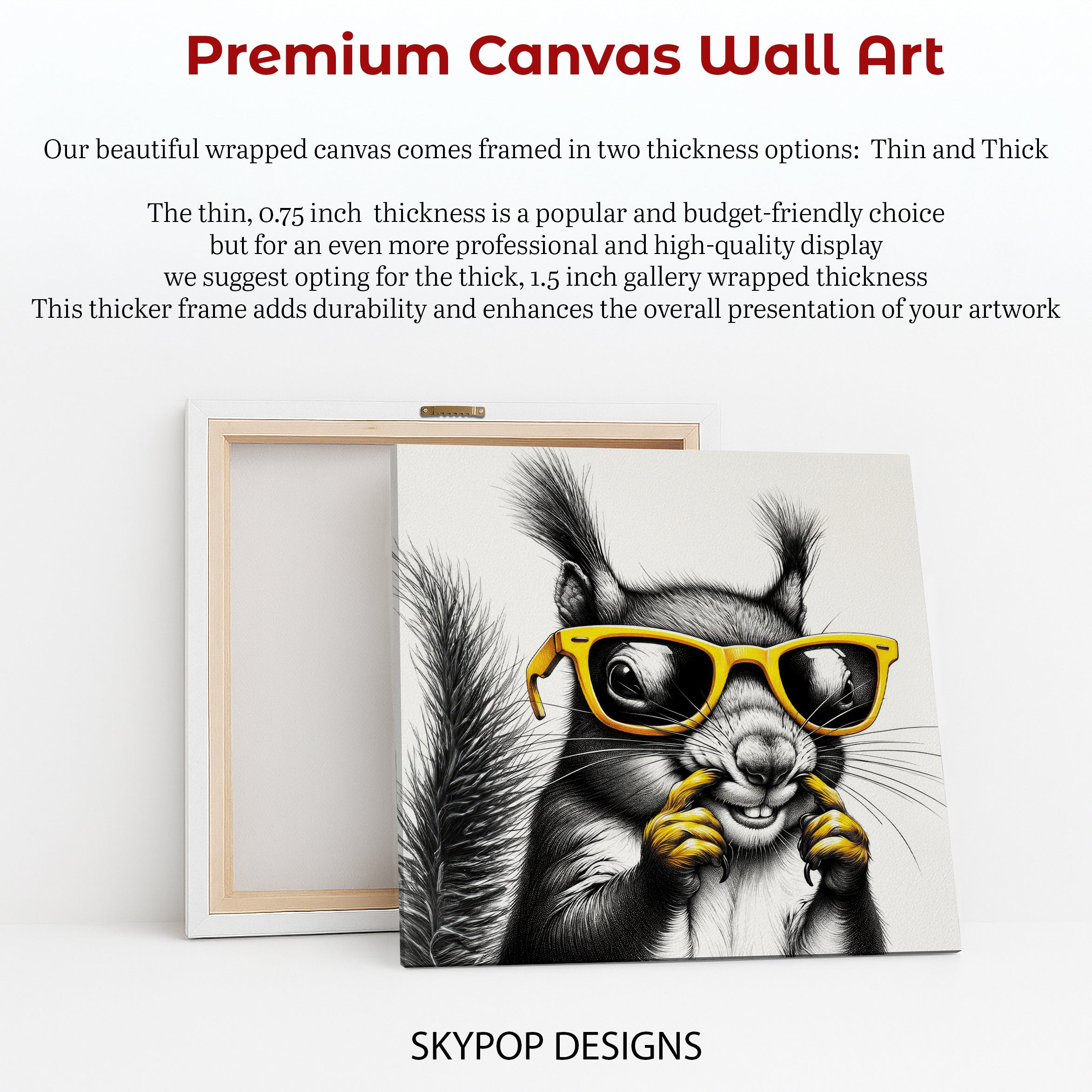Transform your space with this striking squirrel canvas wall art, featuring a cool squirrel sporting vibrant yellow sunglasses. This unique piece elevates any room with its playful and modern aesthetic. The art combines the detail of black and white drawing with a pop of bright yellow, creating a captivating focal point that sparks joy and personality. This vibrant poster or canvas wall art is perfect for contemporary living rooms, a creative office space, or a fun children's room. It's an ideal addition for those who love bohemian decor or simply want to add a touch of quirkiness to their home. The masterful depiction of the squirrel's fur and the bold sunglasses make this artwork a conversation starter. This high-quality canvas art is a fantastic gift for birthdays, housewarmings, or holidays, celebrating unique animal art. It’s sure to brighten your walls and bring a smile to your face, making it a wonderful choice for modern wall decor. Showcase your love for animals and bold design with this eye-catching squirrel poster. Enhance your home's atmosphere with this fun and fashionable squirrel artwork today.
