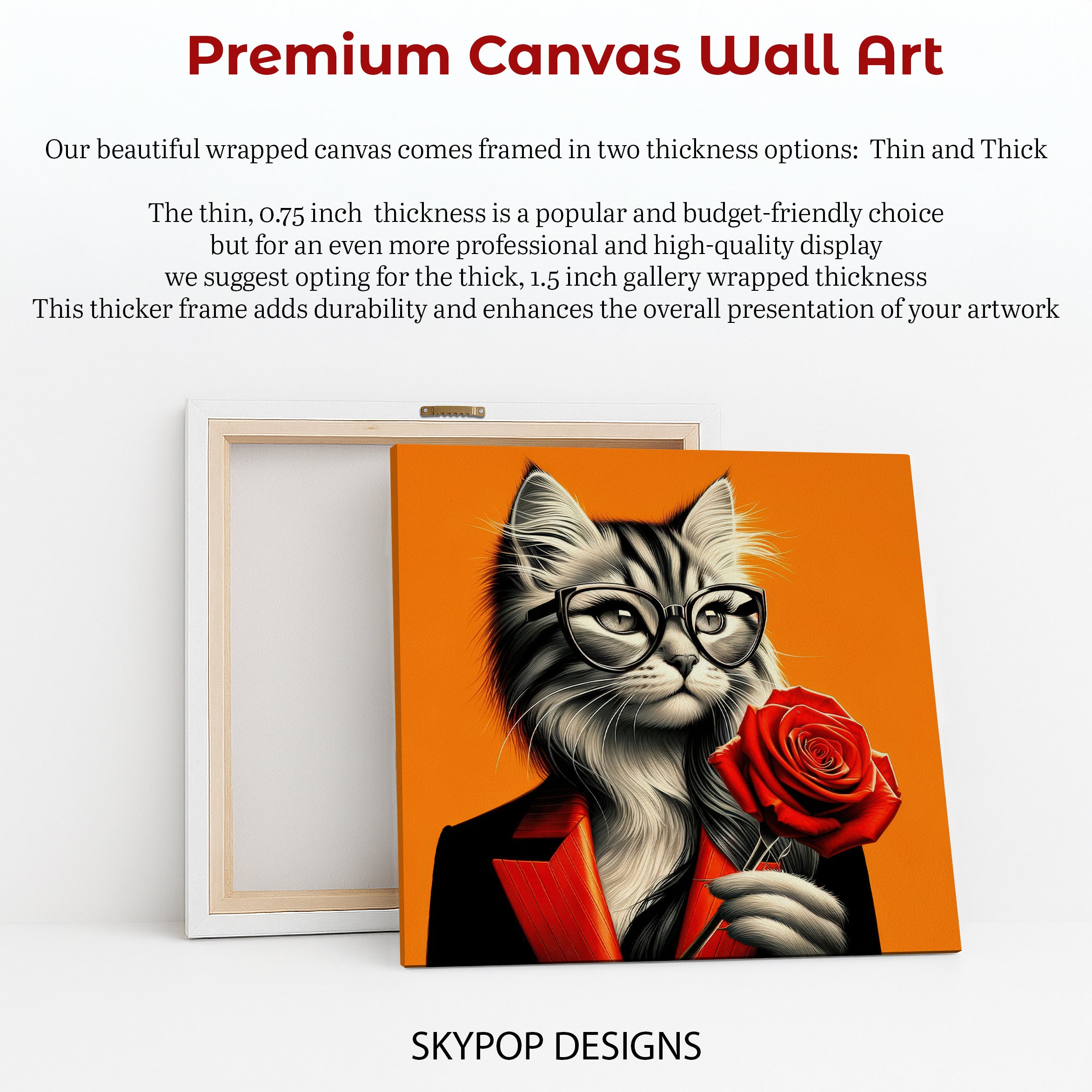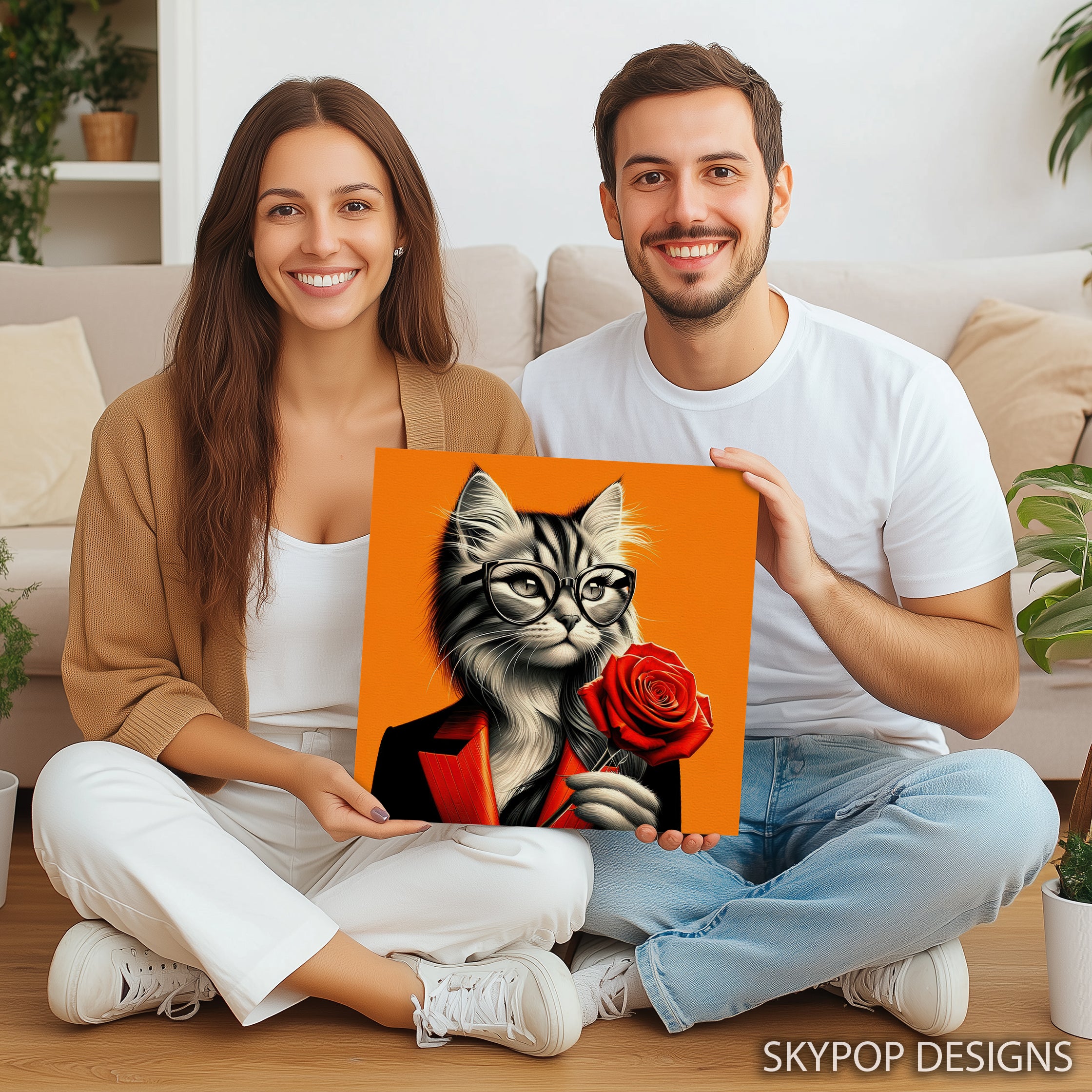 Elevate your living space with this striking cat canvas wall art, a vibrant piece that captures sophisticated style and playful charm. This eye-catching poster features a beautifully rendered cat sporting chic glasses and holding a single red rose, set against a bold orange background. The contemporary art style and pop art influence create a visually dynamic focal point, perfect for modern homes. This stunning canvas wall art will transform your living room, bedroom, or office, adding a splash of personality and color. The striking contrast of black, white, and vibrant red against the bright orange background evokes a sense of modern elegance and warmth. Ideal for cat lovers and admirers of unique wall decor, this poster is a conversation starter for any room. Its versatility makes it a perfect addition to contemporary or glam decor styles, effortlessly enhancing your interior design. Gift this captivating artwork for housewarmings, birthdays, or any occasion to inspire joy and sophistication. The high-quality printing ensures the detailed brushwork and rich colors pop, making this canvas art a treasured piece. Showcasing a love for animals and a sophisticated aesthetic, this artwork is a statement for any art enthusiast. Make your walls come alive with this unique blend of modern art and animal portraiture, a true testament to contemporary interior design. Transform your home today with this memorable and inspiring piece of wall art.