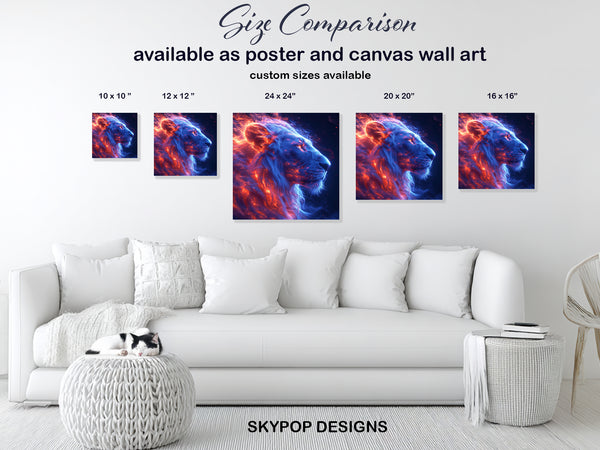 Transform your space with this stunning lion canvas wall art, a captivating piece that blends abstract and animal art with a modern flair. This striking poster showcases a majestic lion enveloped in ethereal blue and fiery red elements, creating a dramatic and powerful visual. The vibrant color palette and dynamic composition make this canvas wall art a perfect focal point for contemporary living rooms, sophisticated bedrooms, or inspiring office spaces. Elevate your interior design with this unique artwork that adds a touch of glamour and intensity. The interplay of cool blues and warm reds evokes a sense of raw energy and untamed spirit, enhancing the mood of any room it graces. Whether you're seeking modern wall decor or a statement piece for your home, this lion print delivers both style and impact. It’s also an ideal gift for animal lovers or anyone who appreciates bold, expressive art. High-quality printing ensures every fiery detail and subtle shade is captured beautifully. This canvas wall art is more than just decor; it's an inspiration. Make a bold statement and transform your walls today.