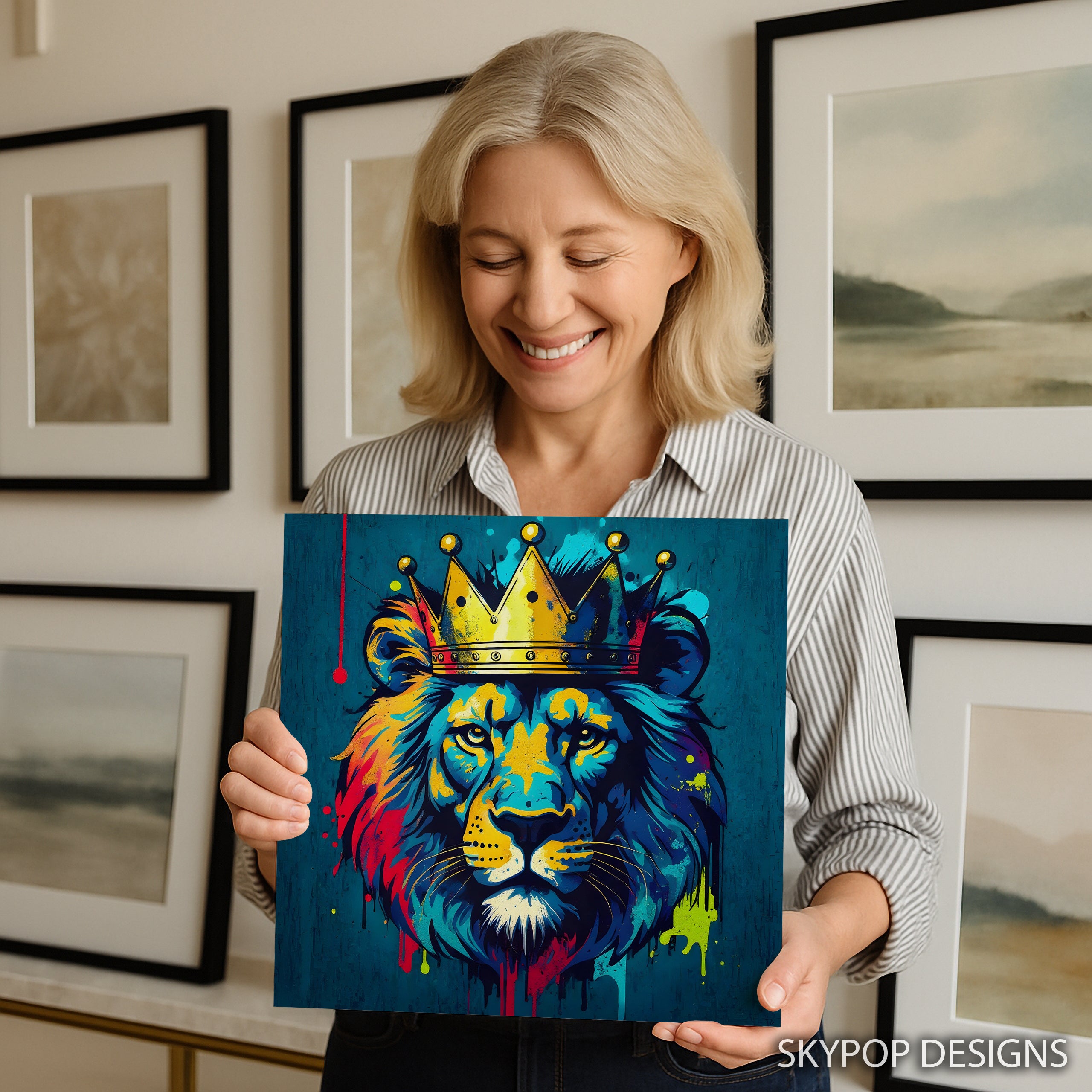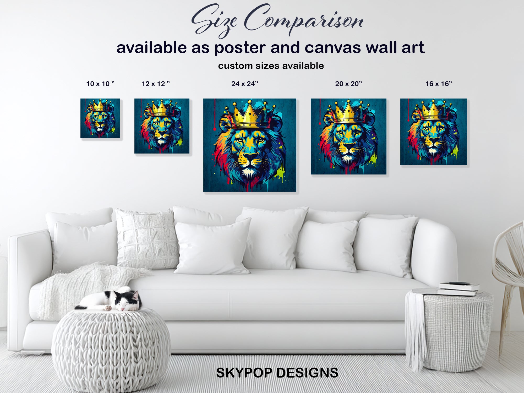 Keywords: Pop Art Lion Art, Graffiti Wall Art, Contemporary Lion Canvas, Modern Decor Lion, Bohemian Lion Print, Glam Lion Artwork, Living Room Wall Art, Office Wall Art, Game Room Decor, Entryway Art, Multicolor Lion Poster, Blue Lion Art, Yellow Lion Painting, Red Lion Art, Majestic Lion King Art, Animal Wall Art, Lion Canvas Print, Golden Crown Lion, Urban Edge Art, Street Art Lion, Bold Lion Decor, Vibrant Lion Art, Regal Imagery, Power and Charisma, Confidence and Creativity, Luxury Wall Art, Fierce Lion Decor, Housewarming Gift Art, Birthday Gift Lion, Holiday Gift Artwork