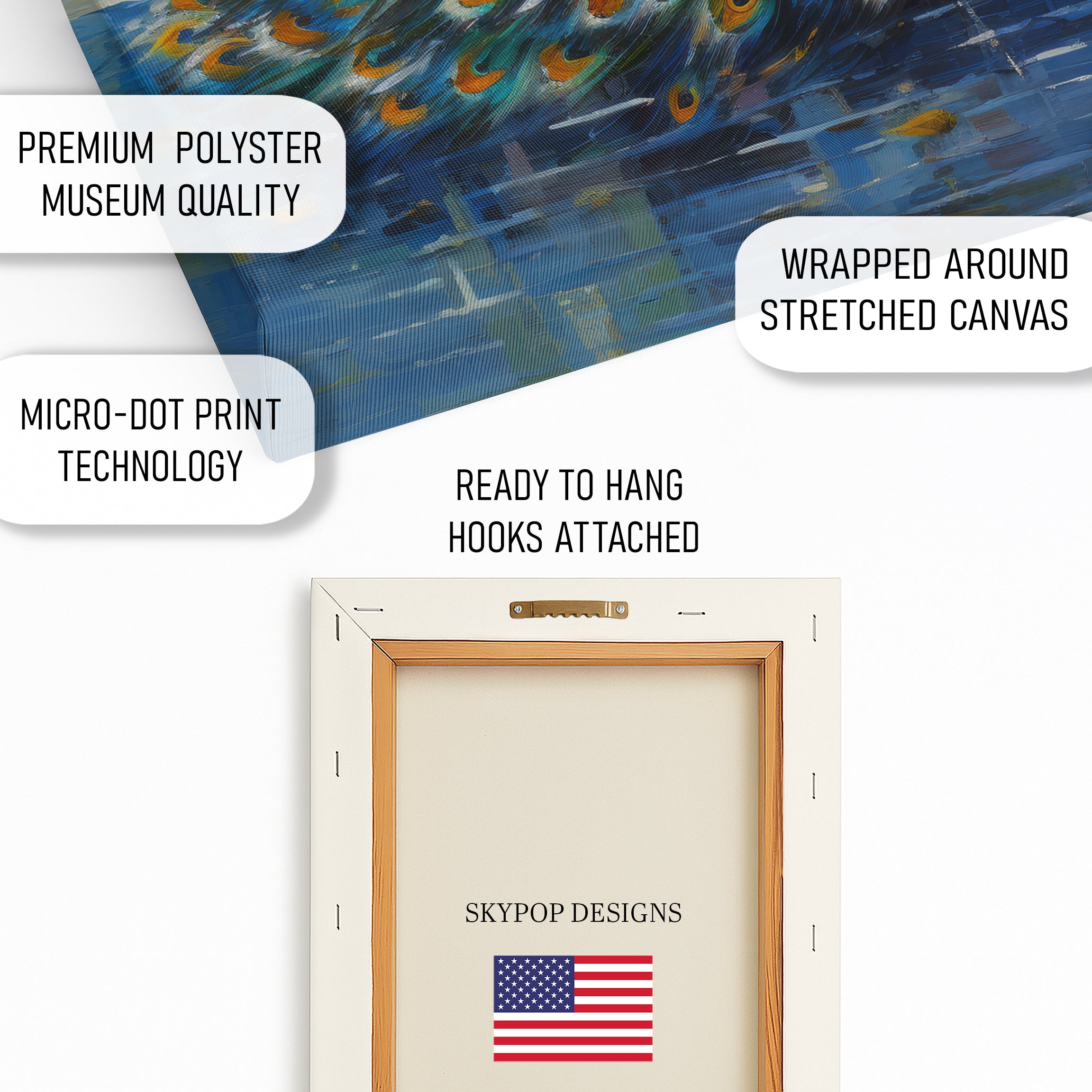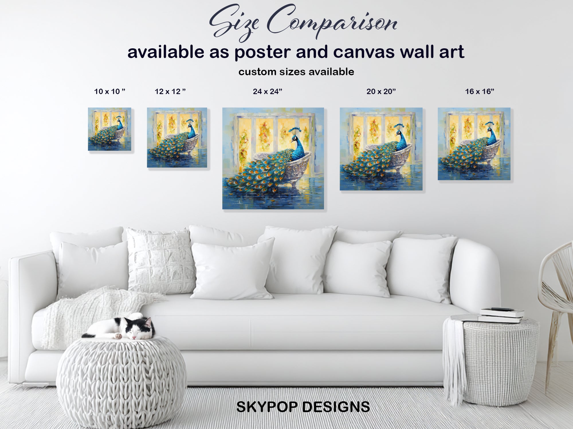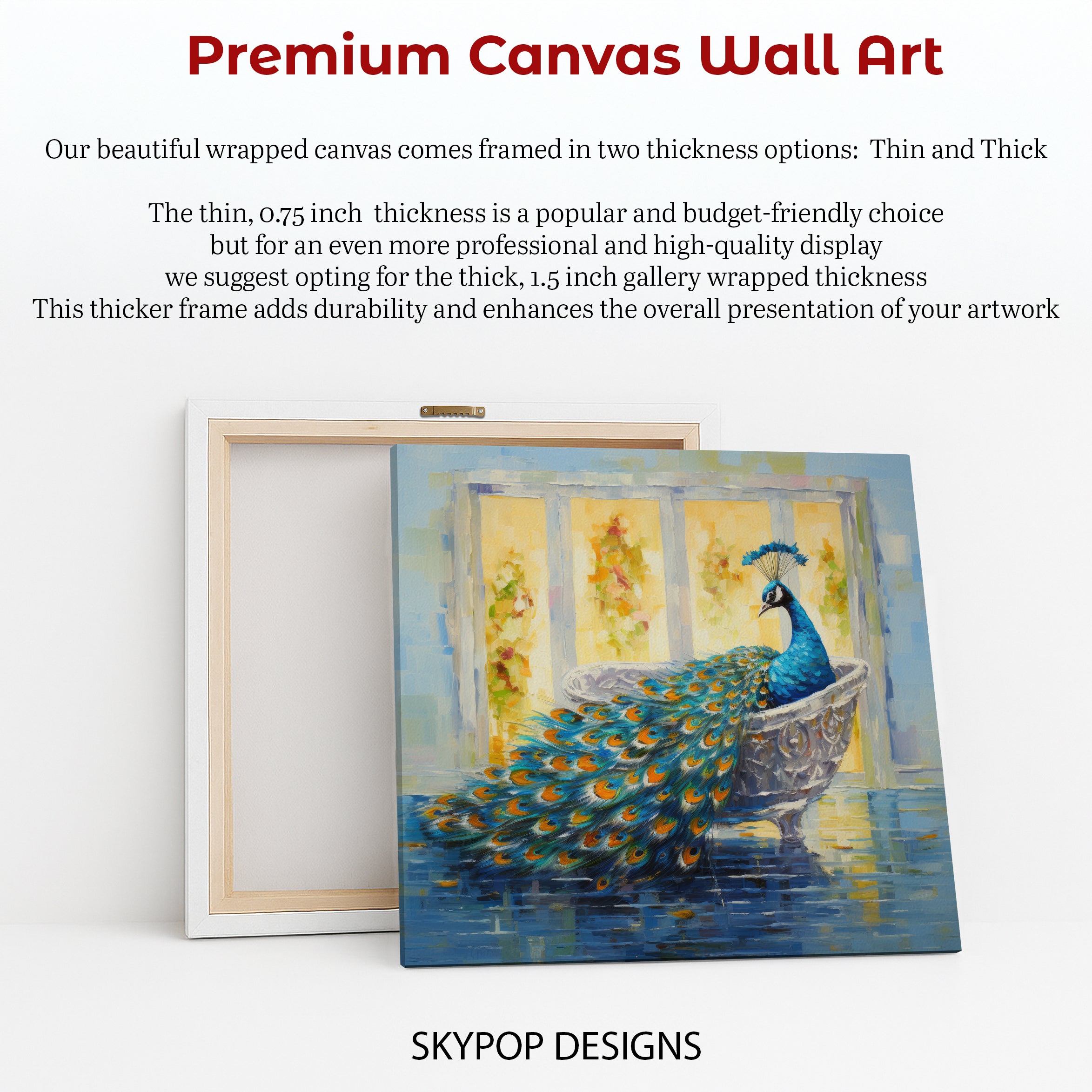 Keywords: Peacock Wall Art, Canvas Print, Blue Green Gold Art, Nature Art, Figurative Art, Contemporary Art, Modern Decor, Glam Decor, Bohemian Decor, Living Room Art, Bedroom Art, Entryway Decor, Bathroom Art, Luxury Art, Whimsical Art, Statement Piece, Animal Art, Peacock Theme, Clawfoot Tub Art, Tranquility Art, Fine Art Print, Home Decor Gift, Housewarming Gift, Birthday Gift, Holiday Gift, Multicolor Art, White Art, Impressionistic Art, High-Quality Canvas, Wall Decor