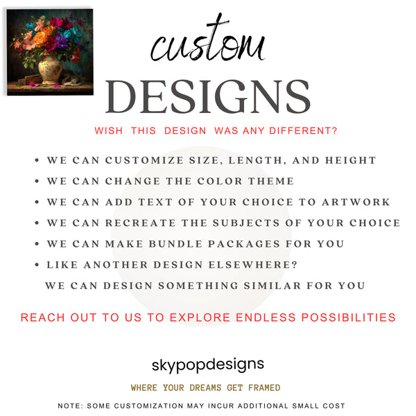 At SKYPOPDESIGNS, we specialize in high-quality canvas and poster prints designed to bring sophistication and style to your space. Please note that our designs are not created with 3D textures or as original oil, acrylic, or watercolor paintings; they are instead HD reproductions of original artwork. This approach allows us to offer these visually stunning pieces at competitive prices, ensuring you receive top-tier, maintenance-free art that's easy to enjoy.