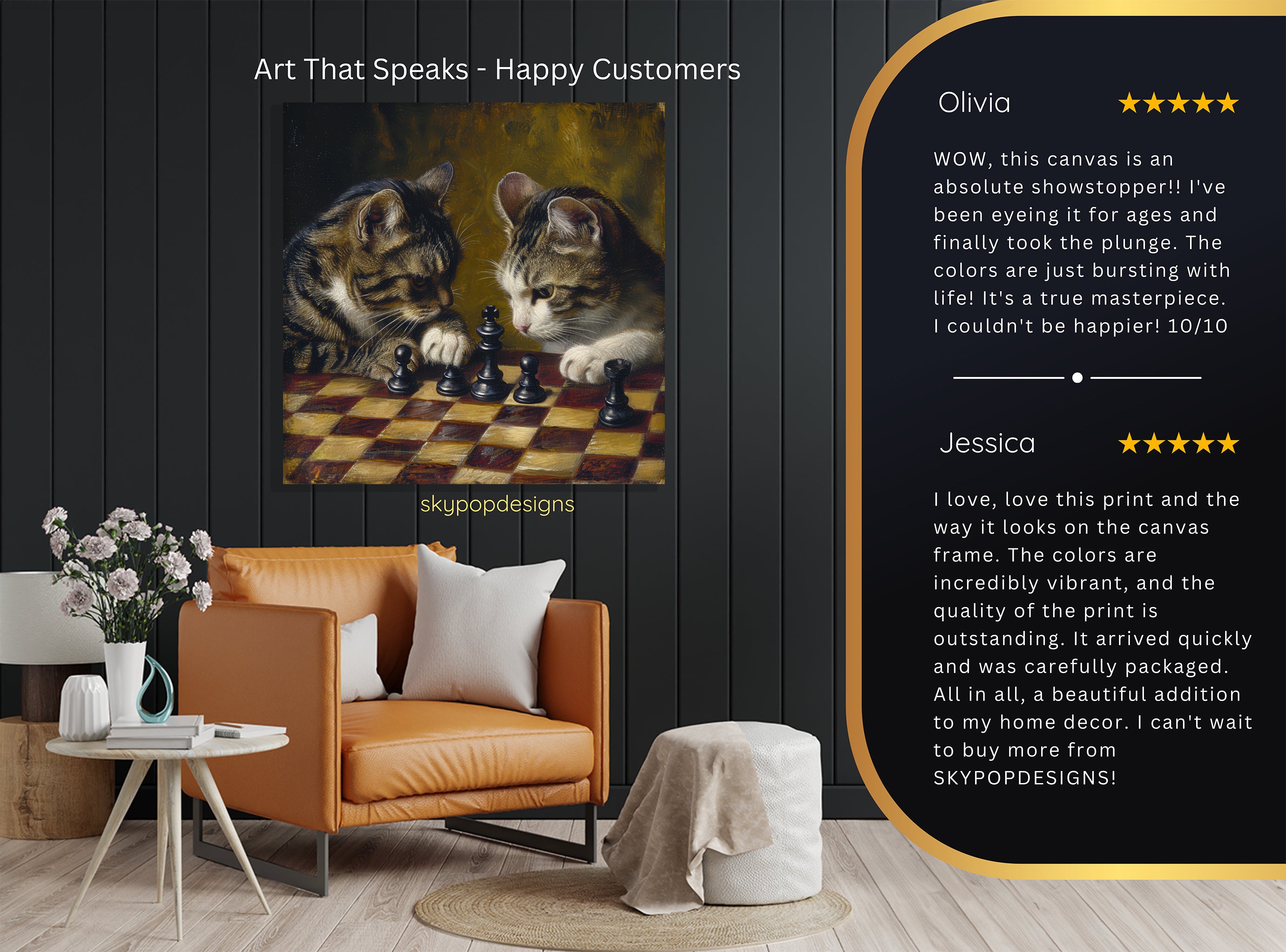 Keywords: cat chess art, animal wall art, classic art print, whimsical wall decor, traditional home decor, Victorian style art, living room art, library decor, home theater art, office wall decor, brown art, multicolor art, gold accent art, black art, cat lover gift, chess enthusiast gift, housewarming gift, birthday gift, pet art, humorous art, vintage art, elegant wall art, canvas wall art, poster art, fine art print, unique home decor, cat painting, strategy art, feline art, animal portrait