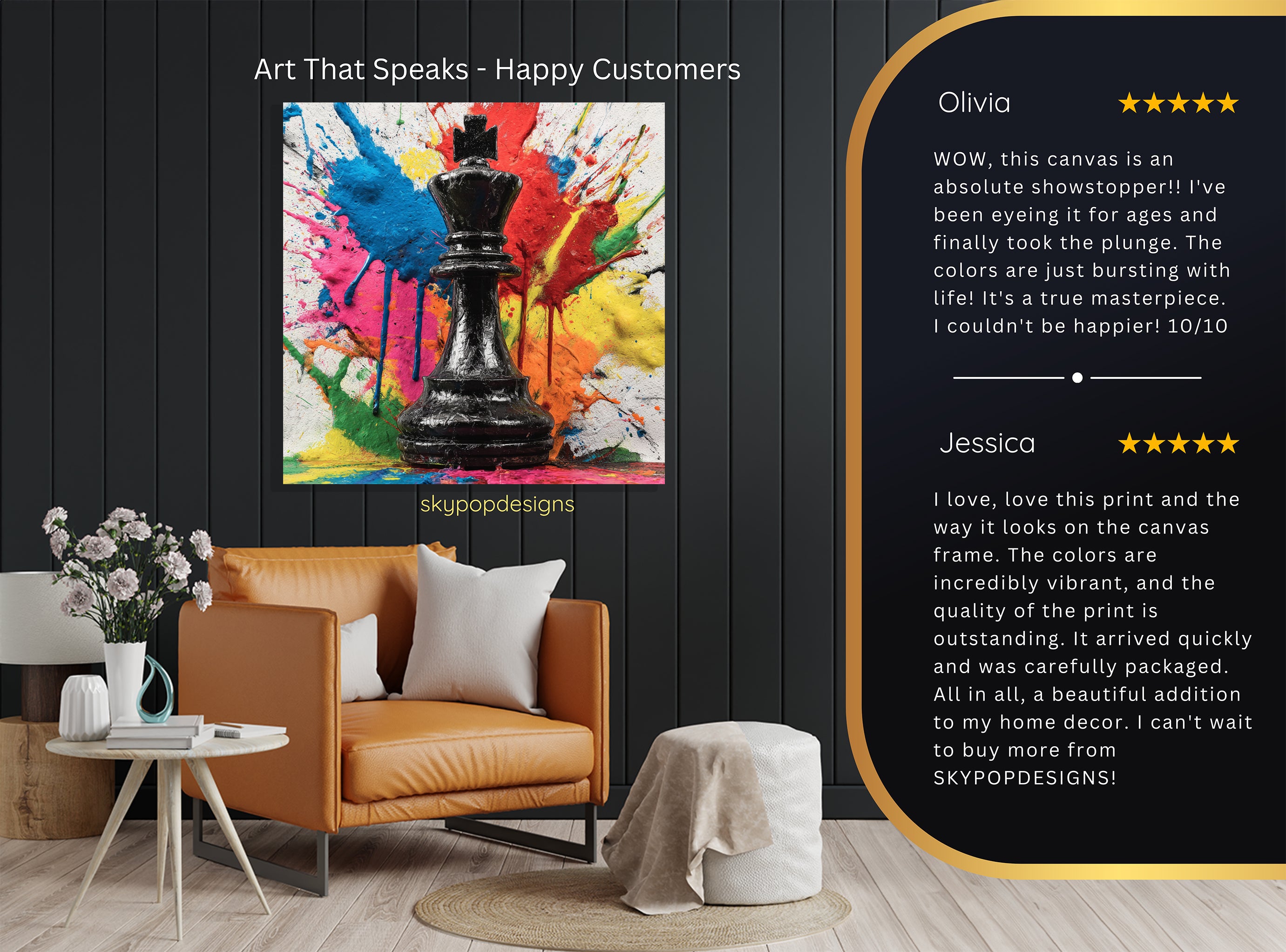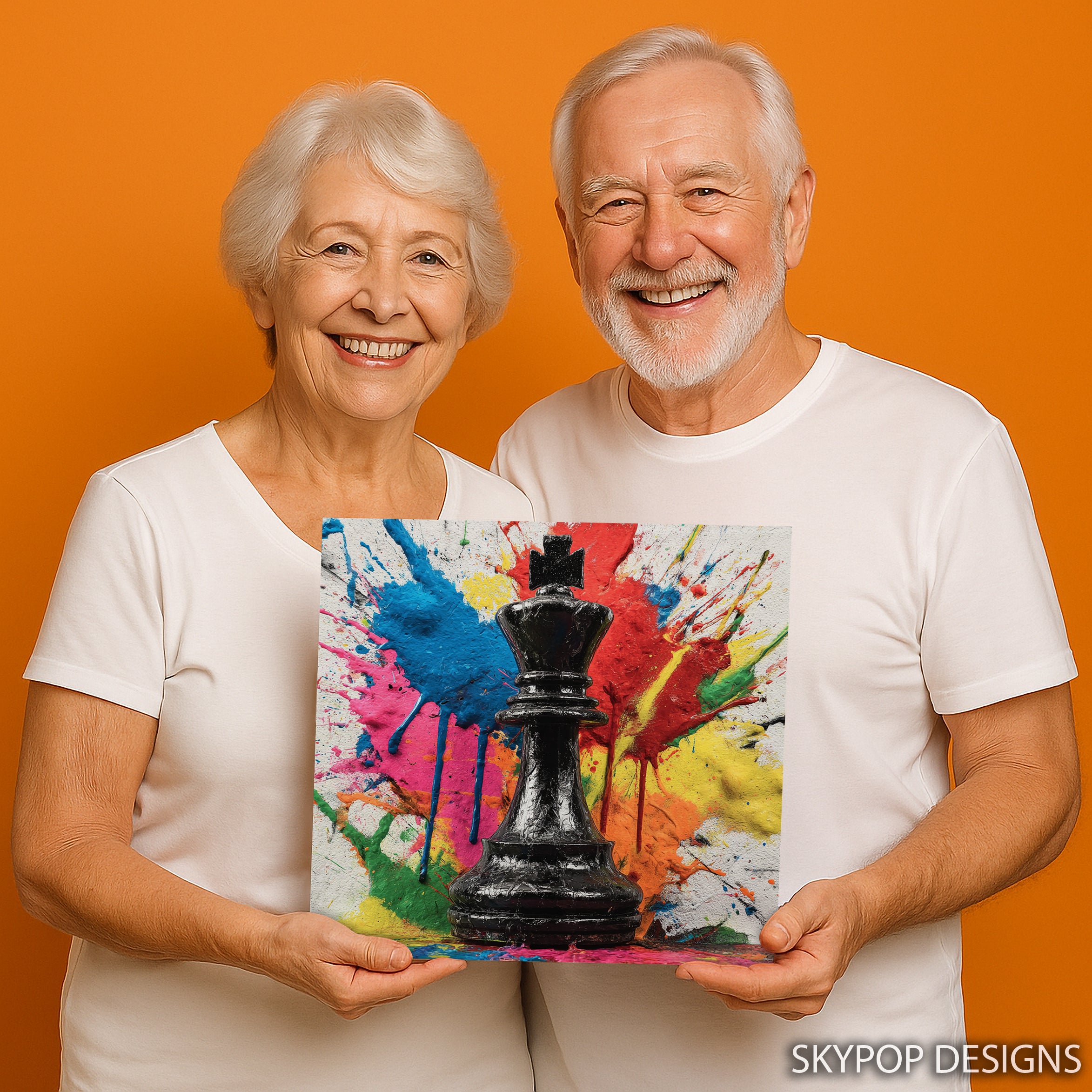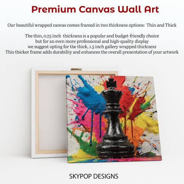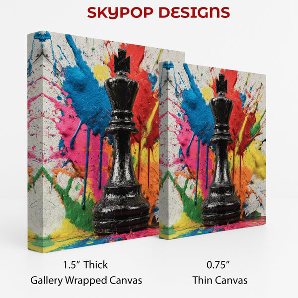 Keywords: King's Gambit Wall Art, Chess Canvas Print, Abstract Art, Pop Art, Graffiti Art, Contemporary Decor, Modern Art, Minimalist Design, Living Room Art, Office Decor, Game Room Art, Bedroom Wall Art, Multicolor Canvas, Black Chess Piece, Gold Accents, Vibrant Splatter Paint, Bold Colors, Red Blue Yellow Pink Orange, Wall Decor, Home Decor, Statement Piece, Artistic Touch, Unique Gift, Housewarming Gift, Artistic Interior, Strategic Flair, Bold Expression, Canvas Prints, Luxury Art, High Quality Canvas