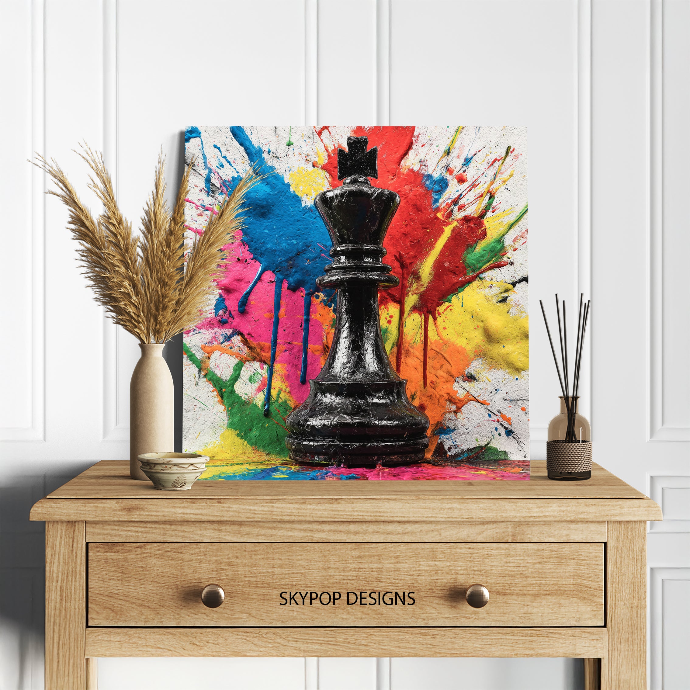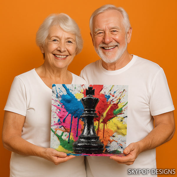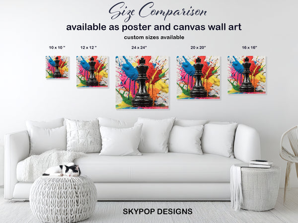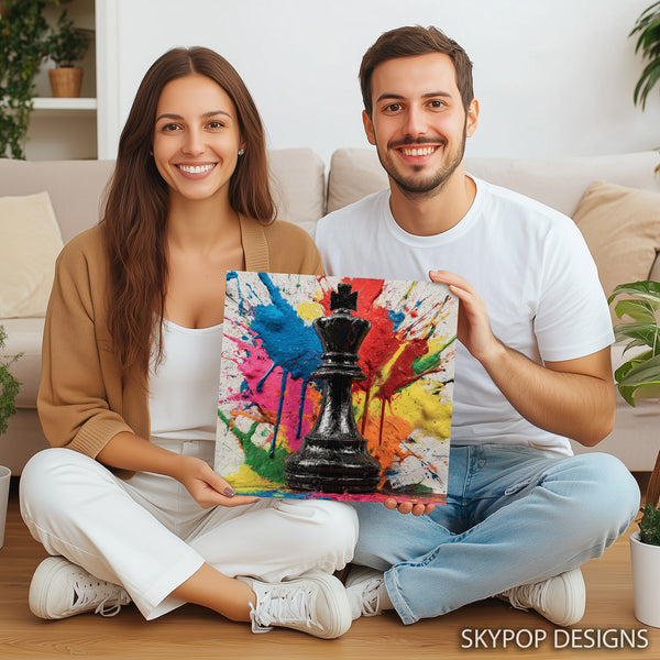 Transform your space with this dynamic King chess piece canvas wall art, bursting with vibrant, splattered paint. This striking piece of pop art and graffiti art captures attention with its bold multicolor abstract background, featuring splashes of red, blue, yellow, pink, and orange. The glossy black king stands as a powerful focal point, creating a dramatic contrast that elevates any modern interior decor. Absolutely perfect for a living room, office, or game room, this canvas wall art adds a touch of sophisticated playfulness and strategic flair. It's an ideal poster for those who appreciate contemporary design and a splash of energetic color. The abstract art style makes it a versatile piece, fitting seamlessly into minimalist or eclectic decor schemes. Use this captivating artwork to inspire contemplation and conversation, bringing a sense of bold expression to your walls. Great as a unique housewarming gift or to add an artistic edge to your home office setup. This poster or canvas wall art is a statement piece that adds personality and a modern artistic touch to any room. Elevate your home decor with this visually stunning chess-themed wall art and showcase your passion for strategy and art. Our high-quality canvas prints are designed to be a lasting addition to your home.
