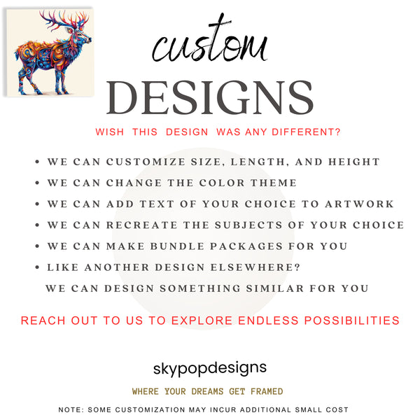 Transform your living space with this captivating deer canvas wall art, bringing a burst of energy and artistry into your home. This striking poster showcases a magnificently decorated deer, rendered in a vibrant multicolor palette that instantly enhances any room. The intricate patterns and bold colors evoke a sense of wild beauty and spiritual connection, making this piece of animal art a true statement. Perfect for bohemian or eclectic decor styles, this canvas wall art adds a unique touch to your bedroom or entryway. The blend of abstract and natural elements creates a mesmerizing visual experience, ideal for a contemporary office or a cozy living room. Celebratethe beauty of nature with this stunning deer poster, which offers a unique perspective and sparks conversation. The rich colors, featuring blues, oranges, and gold accents, are known to promote creativity and a sense of wonder. This high-quality canvas art is a versatile addition to your decor, suitable for various room sizes and styles. It makes an exceptional gift for nature lovers or anyone seeking to add a touch of the extraordinary to their home decor. Elevate your walls with this breathtaking deer artwork and infuse your surroundings with vibrant, uplifting energy. Discover the magic of this unique wall art and make your space truly unforgettable. Enhance your home's aesthetic with this stunning deer canvas print today.