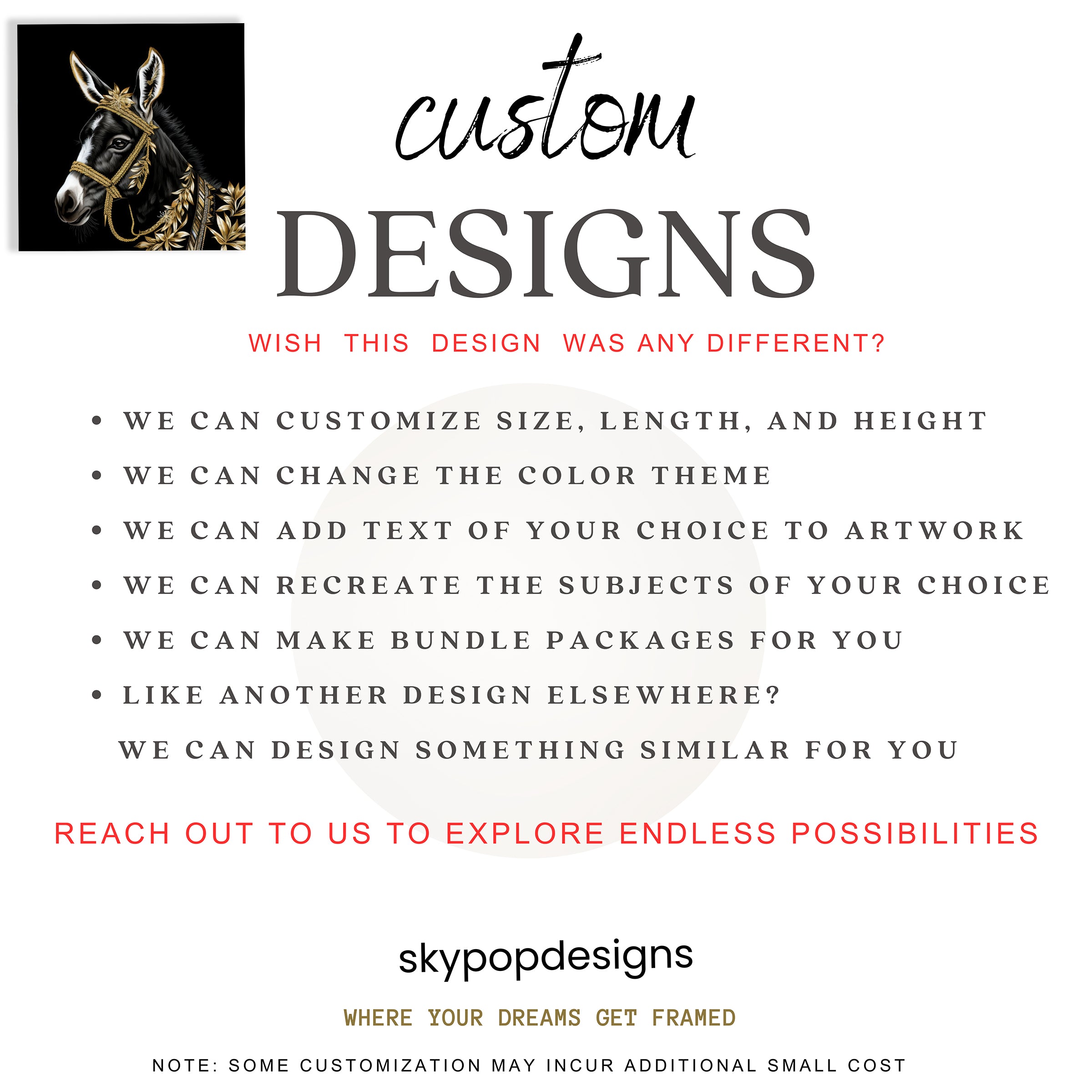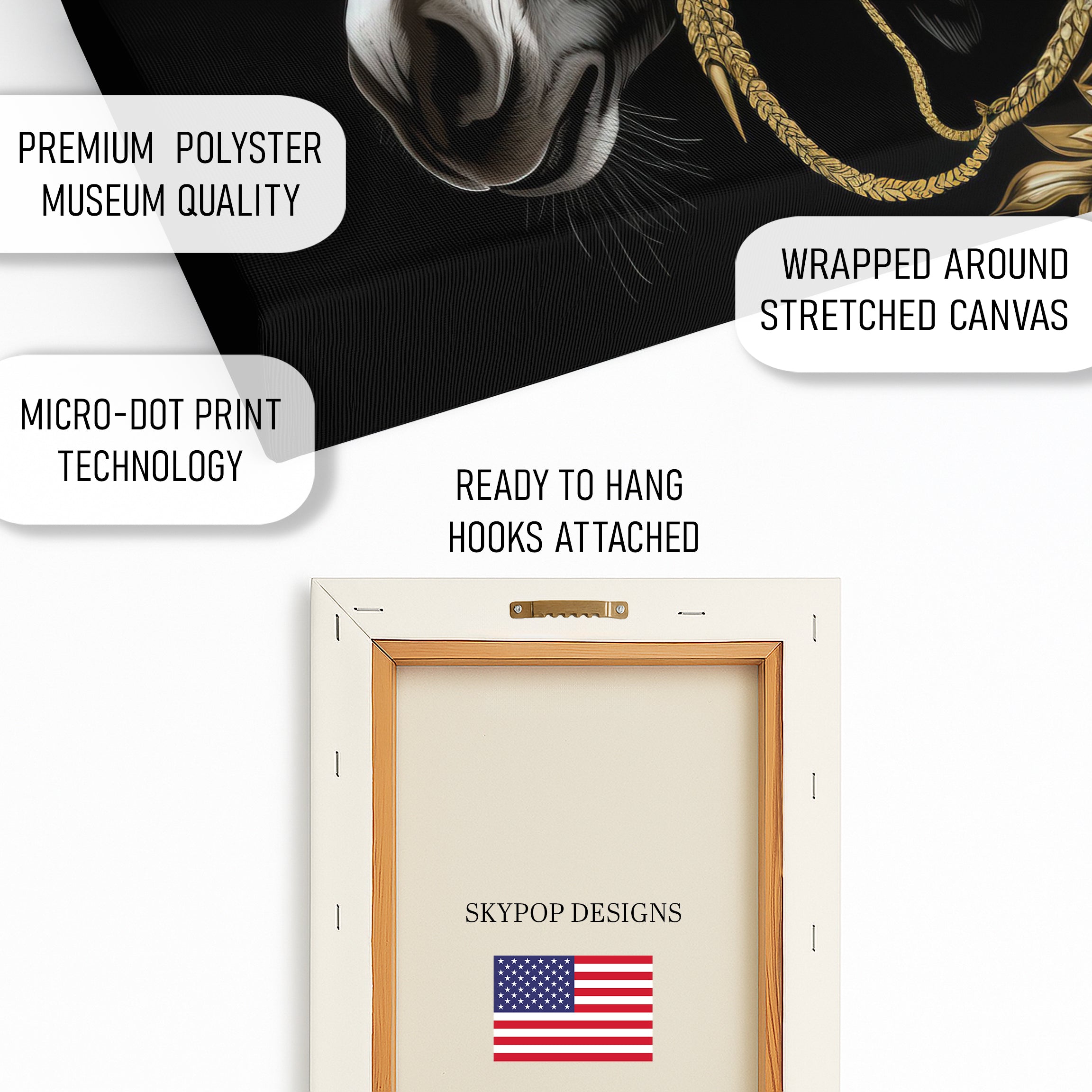Elevate your home decor with this stunning donkey canvas wall art, featuring a regal donkey adorned with intricate gold detailing and a crown. This captivating piece adds a touch of glamour and sophistication to any room, making it a true statement artwork for your walls. The striking contrast between the black background and the rich gold elements creates a dramatic and luxurious visual effect, perfect for contemporary and glam decor styles. This animal art poster is ideal for living rooms, bedrooms, entryways, or dining rooms, instantly transforming your space. Showcase your unique taste with this eye-catching canvas print, a perfect gift for animal lovers or anyone who appreciates opulent design. The detailed rendering of the donkey and its ornate accessories conveys a sense of majesty and strength, inspiring a sophisticated atmosphere. Whether you're looking for modern wall art or traditional accent pieces, this versatile artwork fits seamlessly into various interior designs. The vibrant gold accents not only draw the eye but also add a warm, inviting glow to your home. High-quality reproduction ensures the longevity and beauty of this exquisite canvas wall art. Make a bold statement and enhance your living space with this unique and elegant donkey artwork today. This piece offers a timeless appeal that will be admired for years to come. Transform your walls into a gallery of sophisticated art.
