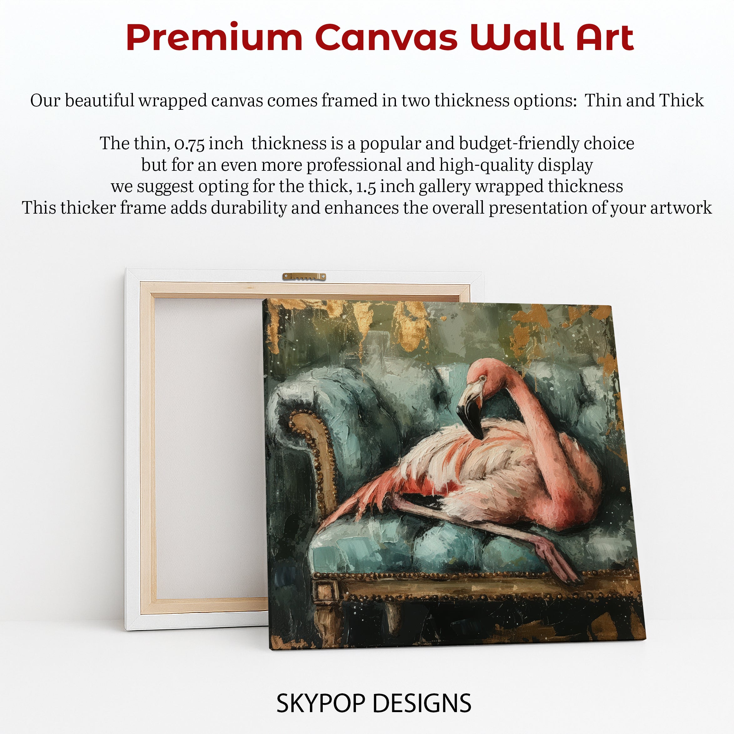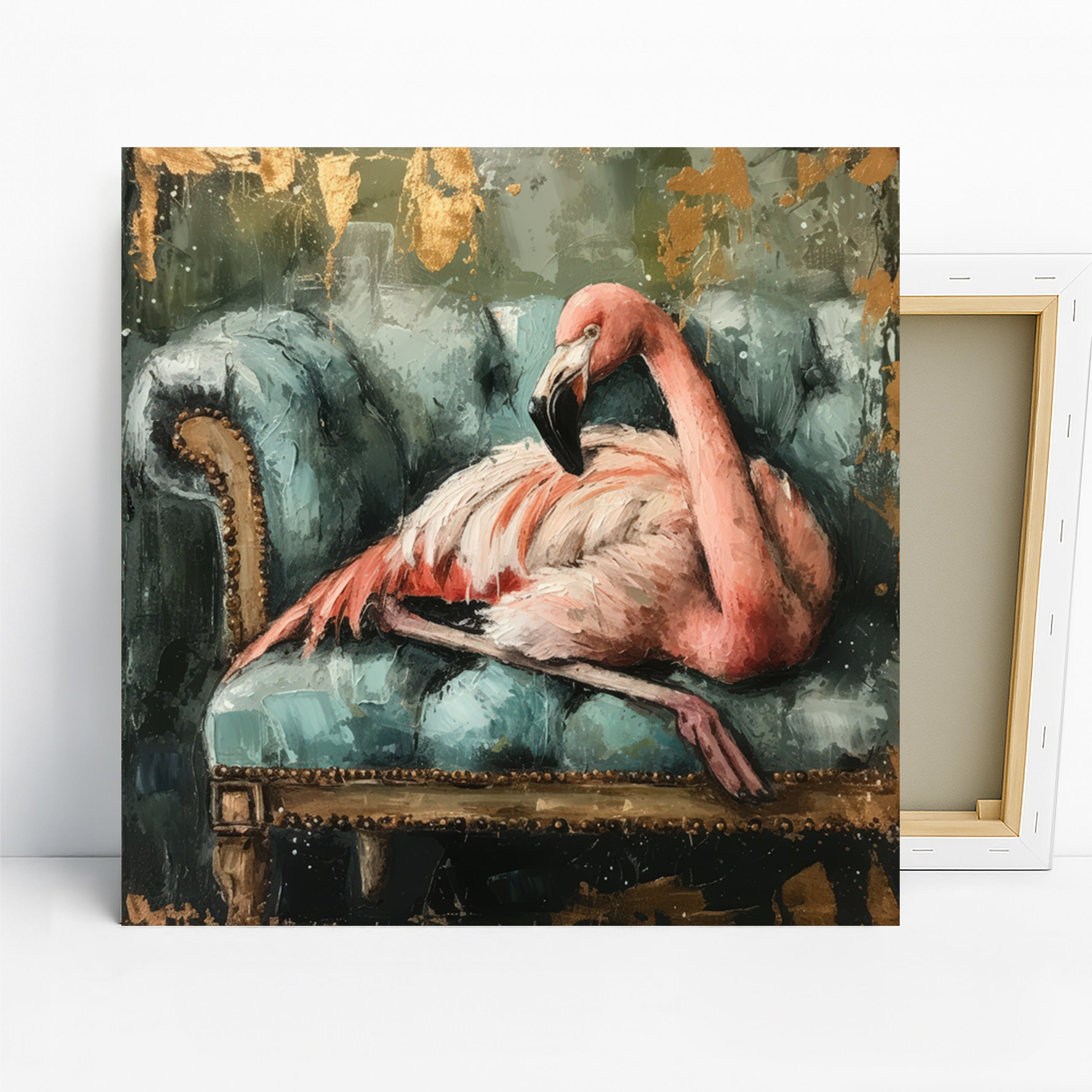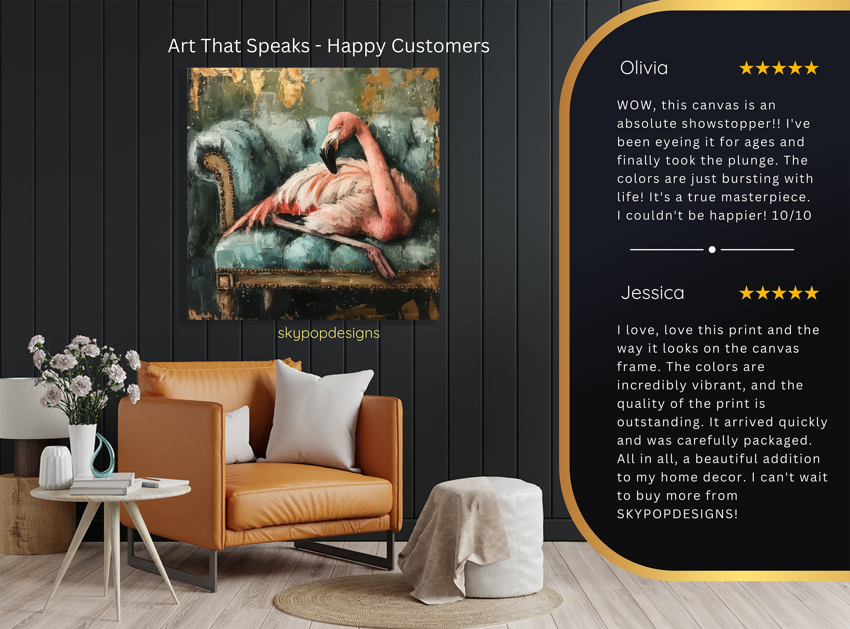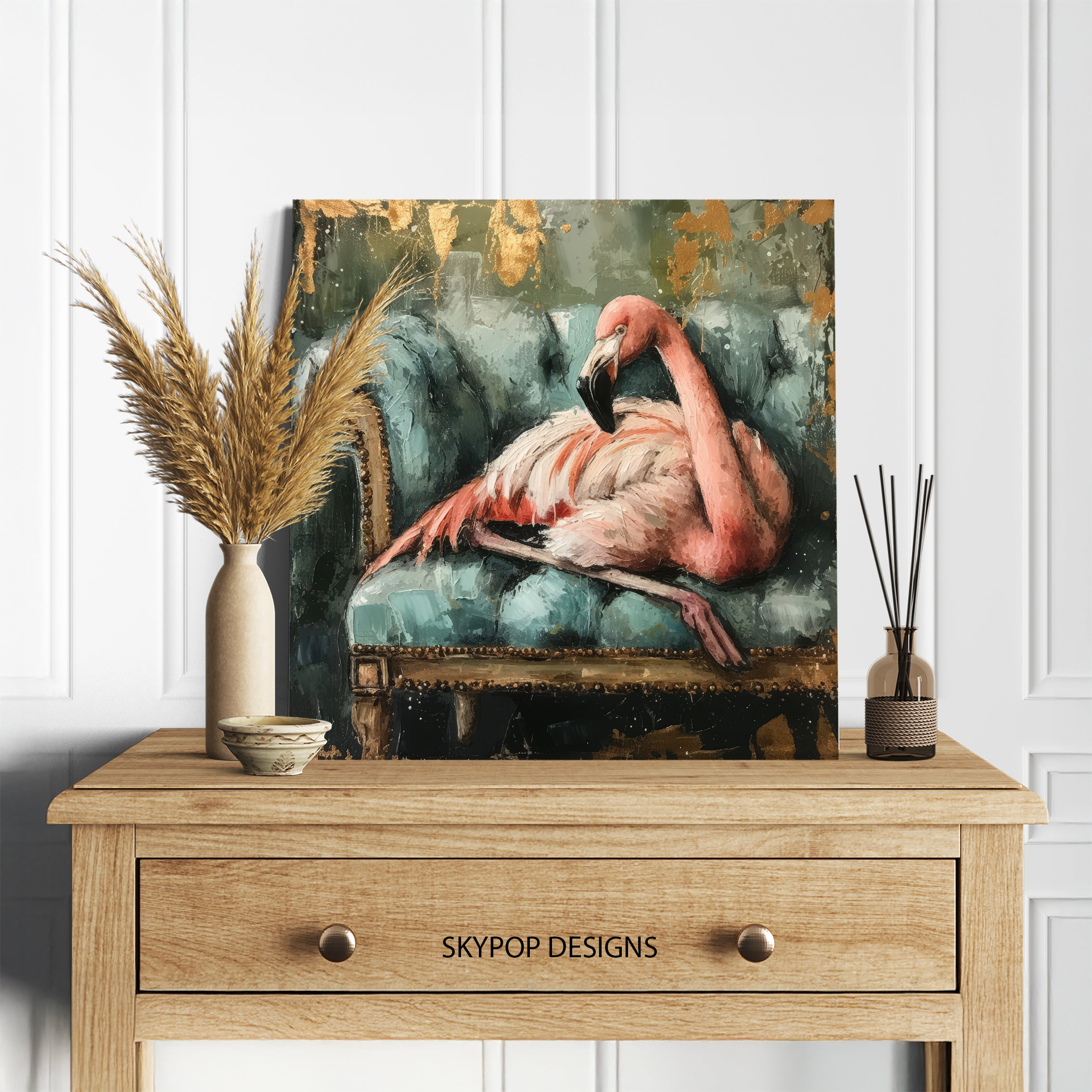 Keywords: Flamingo Art, Canvas Wall Art, Abstract Art, Contemporary Art, Animal Art, Glam Decor, Modern Decor, Living Room Art, Bedroom Art, Entryway Art, Gold Art, Multicolor Art, Teal Art, Brown Art, Flamingo Lounge, Wall Decor, Home Decor, Interior Design, Luxury Art, Statement Piece, Housewarming Gift, Birthday Gift, Abstract Flamingo, Velvet Sofa Art, Teal Sofa Art, Chic Art, Stylish Wall Art, Art Poster, Vibrant Art, Unique Decor