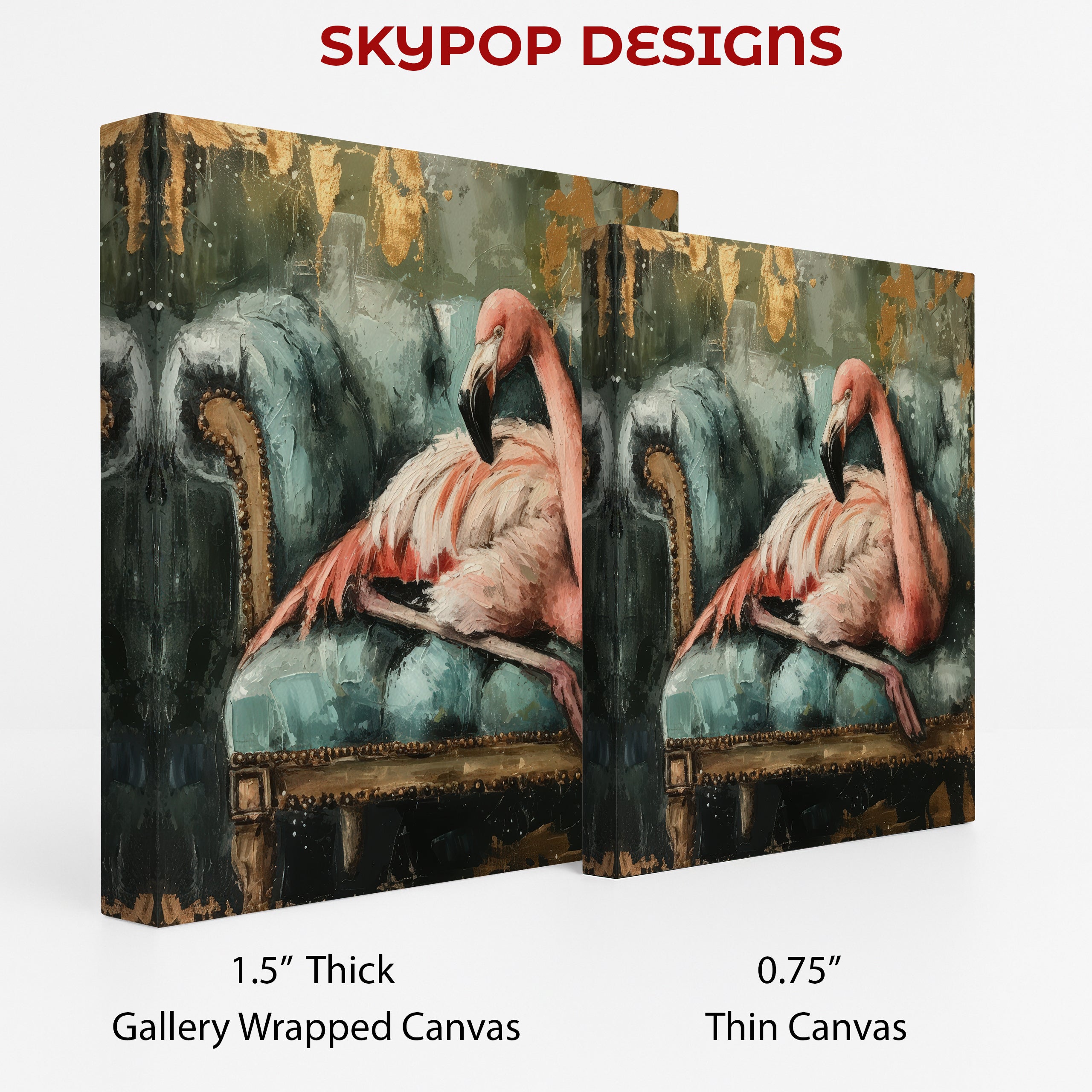 Transform your living space with this captivating flamingo canvas wall art, featuring a striking pink flamingo lounging on a distressed teal velvet sofa. This unique piece of art merges glamorous decor with contemporary style, creating an eye-catching focal point for any room. The rich gold accents and textured background add depth and sophistication, making this canvas wall art perfect for those looking to elevate their home decor. Whether you're aiming for a bold statement in your living room, a touch of elegance in your bedroom, or a conversation starter in your entryway, this poster is an ideal choice. The vibrant pink of the flamingo beautifully contrasts with the deep teal of the sofa, evoking a sense of luxury and artistic flair. This artwork is not only a stunning decorative item but also an excellent gift for housewarmings or birthdays, bringing a playful yet chic vibe to any setting. The detailed brushwork and high-quality printing ensure the longevity and visual appeal of this canvas wall art. Enhance your home with this inspiring piece that combines animal art with modern design, celebrating individuality and a love for unique interior styles. Elevate your wall decor and infuse your space with personality and charm. This versatile poster is perfect for adding a touch of glamour to modern or contemporary interiors, making your walls a true reflection of your taste. Discover the perfect blend of art and comfort with this exquisite flamingo canvas art.