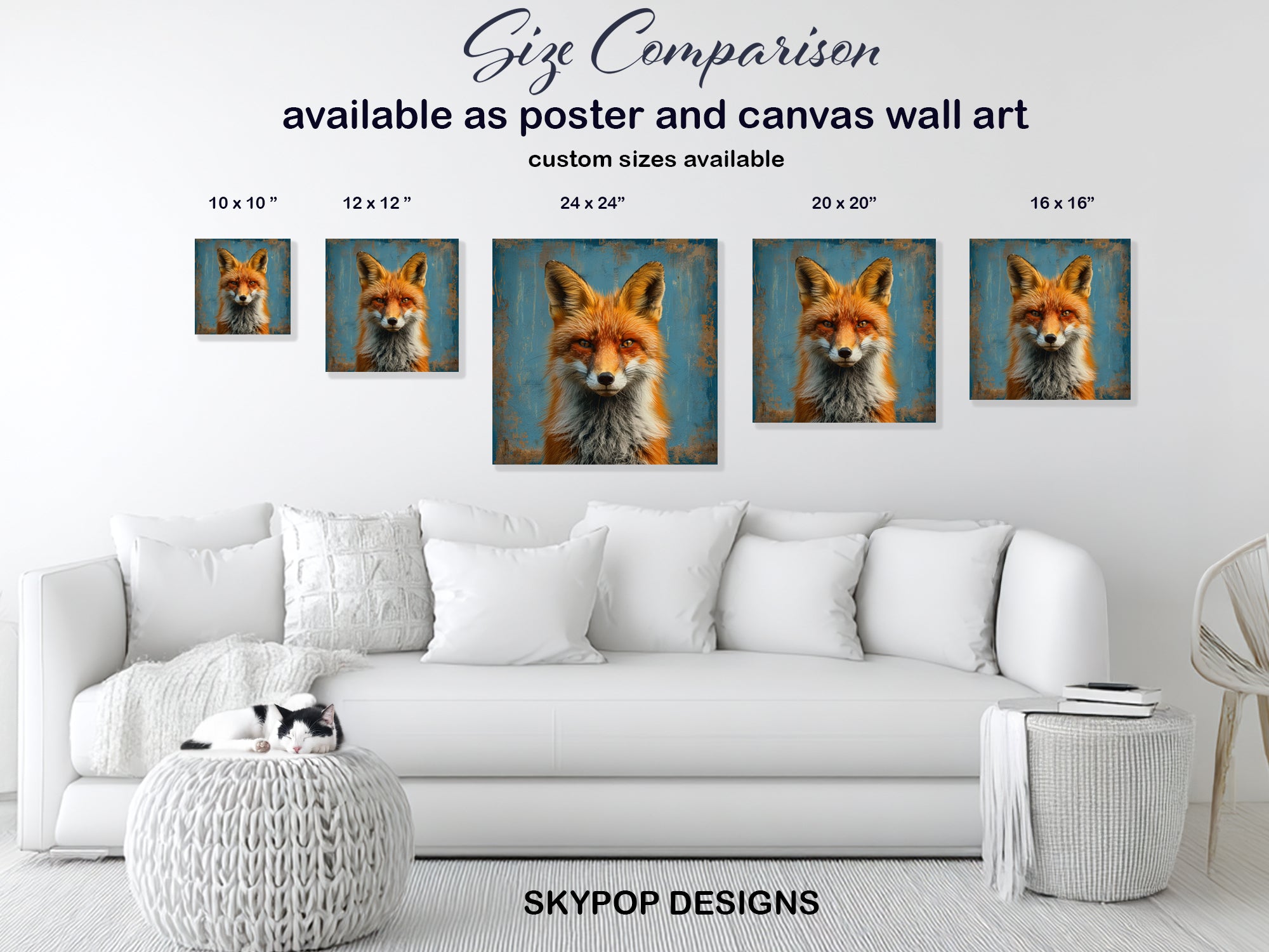 Fox Portrait Art, Canvas or Poster, Rustic Modern Farmhouse Decor, Living Room Bedroom Office Entryway Wall Art, Brown Blue Gold Multicolor