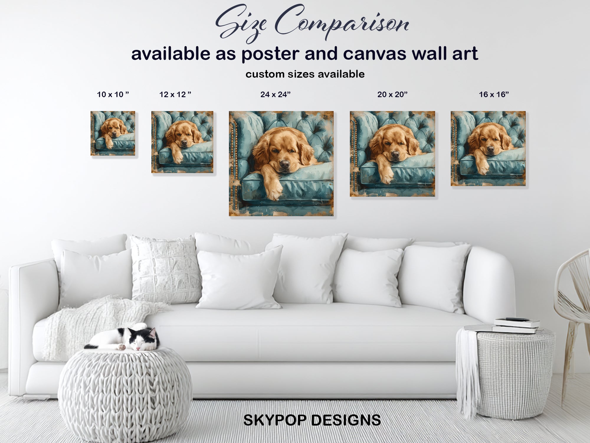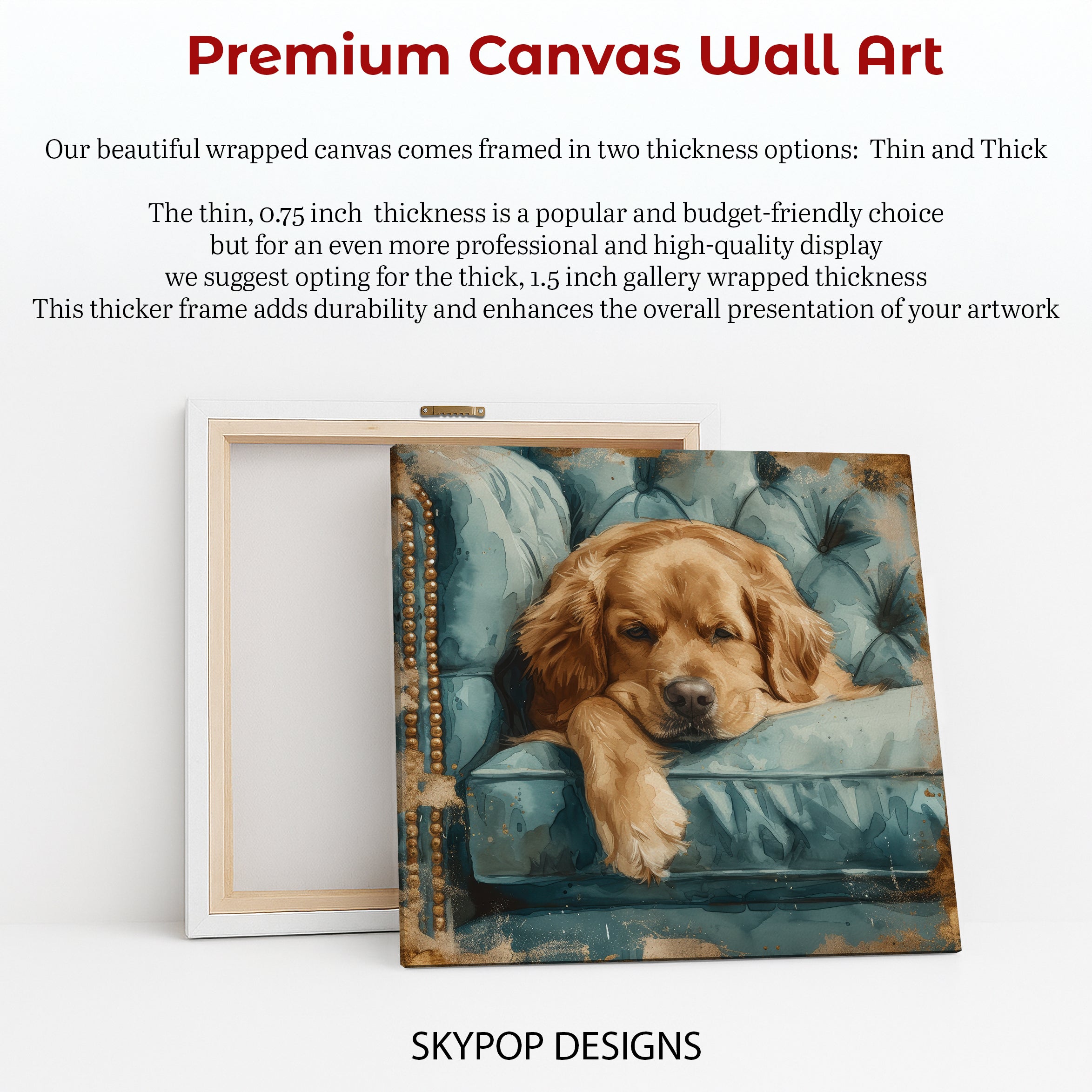 Transform your home with this stunning Golden Retriever canvas wall art, showcasing a serene dog relaxing on a plush teal loveseat. This captivating piece of animal art will elevate your living room decor, bedroom sanctuary, or office space. The striking blend of teal, gold, and warm brown tones creates a sophisticated and inviting atmosphere, perfect for contemporary or mid-century modern interiors. This versatile poster also makes an ideal gift for Golden Retriever lovers or any occasion like housewarmings or birthdays. The abstract brushstrokes and luxurious texture of this canvas wall art bring depth and character to any wall. Inspire a sense of calm and comfort with this heartwarming depiction of a beloved pet. This artwork is perfect for those seeking to add a touch of elegance and personality to their home decor. Embrace the soothing color palette, featuring calming teal and rich browns, accented by shimmering gold details, to create a tranquil ambiance. Enhance your space with this high-quality canvas print, available in various sizes to perfectly fit your wall. Make a statement and bring the comforting presence of this Golden Retriever into your home. This unique piece of wall art will surely be a conversation starter.