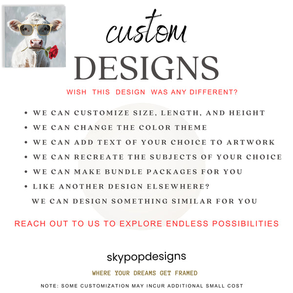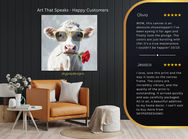 Elevate your space with this striking Highland Cow canvas wall art, showcasing a touch of whimsical charm. This captivating poster or canvas wall art features a stylized cow sporting cool gold sunglasses and holding a vibrant red rose, adding a playful yet sophisticated element to any room. The art combines contemporary animal art with pop art sensibilities, making it a fantastic focal point for modern living rooms, trendy kitchens, or cozy bedrooms. The bold contrast between the white cow, red rose, and gold accents creates a visually stimulating piece that adds personality and character to your decor. This versatile canvas wall art is perfect for farmhouse style enthusiasts looking to add a unique twist or for those who appreciate eye-catching modern art. The high-quality print ensures vibrant colors and sharp details, making this poster a durable and beautiful addition to your home. It's an ideal housewarming gift or a thoughtful present for birthdays and holidays. Enhance your entryway with a touch of unexpected personality, or bring a spark of joy to your kitchen decor. This stunning cow artwork is designed to transform your home and inspire conversation. Celebrate unique art styles with this unforgettable canvas poster that brings a fresh, contemporary vibe to your wall decor. Make a statement with this cool cow art and transform your home into a stylish sanctuary.