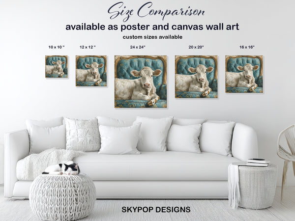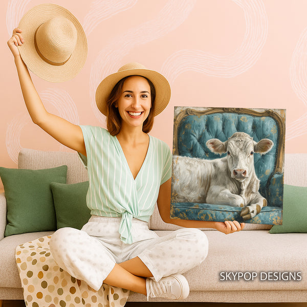 Elevate your home with this captivating Highland Cow canvas wall art, showcasing a majestic cow lounging on a plush teal armchair. The striking contrast between the bovine subject and the opulent setting creates a sophisticated and whimsical focal point. This unique poster or canvas artwork blends animal art with contemporary flair, making it ideal for modern living rooms or glam bedrooms. The deep teal of the chair complements the cow's creamy white coat, adding a touch of luxury and serenity to your space. Perfect for transitional decor, this piece brings personality and charm to any room. The textured brushwork and subtle gold accents enhance the depth and richness of the composition, ensuring this wall art stands out. Whether you're looking for a statement piece for your entryway or a comforting addition to your bedroom, this canvas wall art offers timeless appeal. It's a wonderful gift for housewarmings, birthdays, or any occasion, adding a touch of unexpected elegance. Experience the transformative power of art with this stunning Highland Cow canvas print, designed to inspire smiles and conversations. Add this versatile artwork to your collection and infuse your home with unique character and style. This high-quality canvas wall art promises lasting beauty and a unique aesthetic for your home.