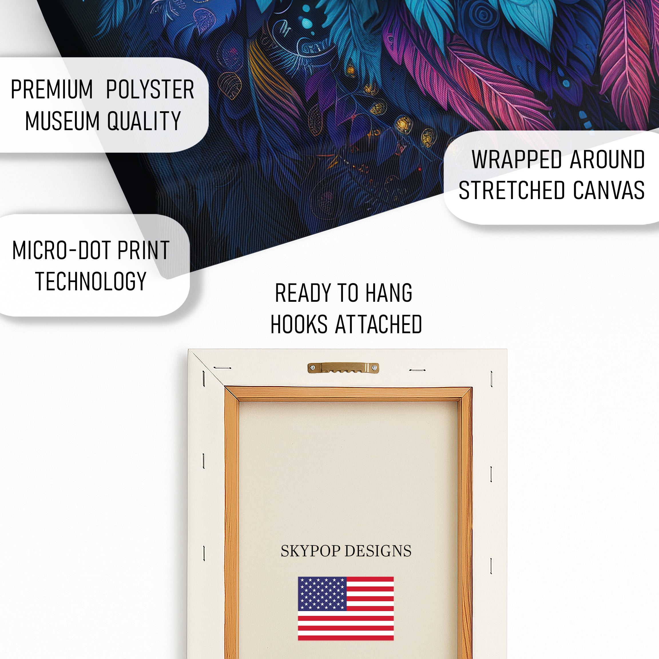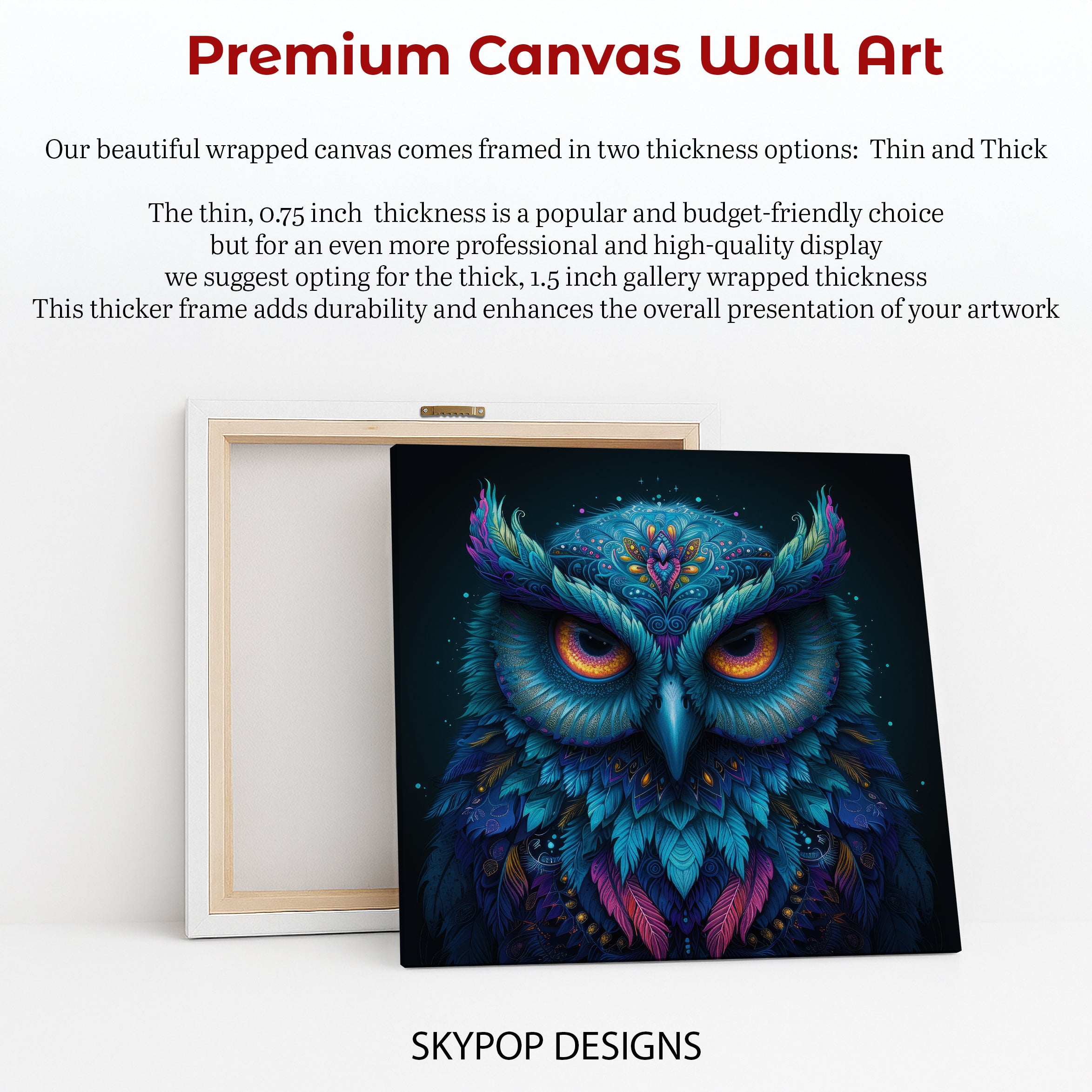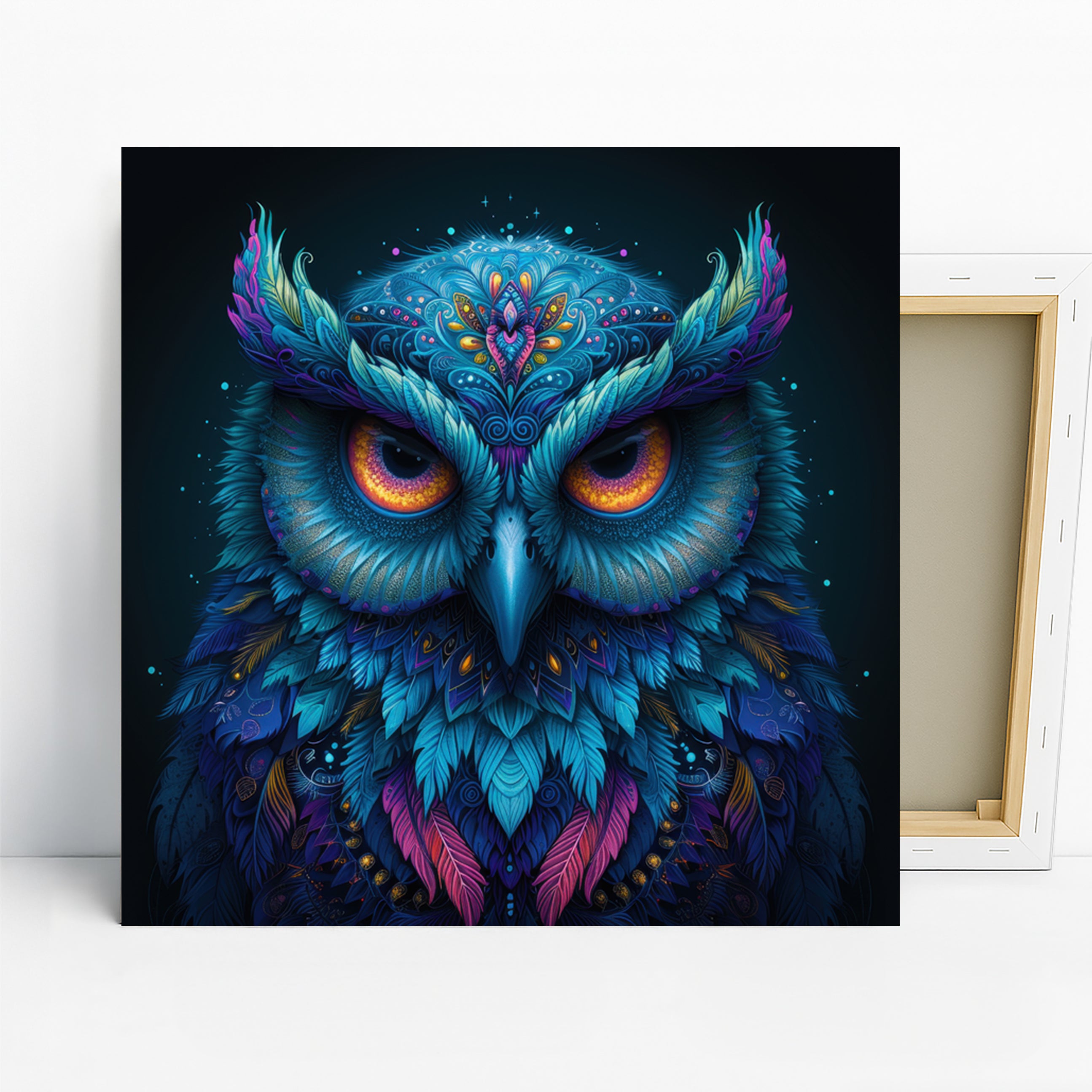 Transform your living space with this stunning owl canvas wall art, a captivating piece that blends abstract and nature art with a mystical allure. This intricate owl poster features a symphony of blues, purples, and gold, creating a vibrant and eye-catching focal point ideal for bohemian or contemporary decor styles. The detailed, almost surreal patterns on the owl’s feathers evoke a sense of wonder and wisdom, making this canvas wall art perfect for your living room, bedroom, or office. Its striking color palette brings a touch of the extraordinary to any room, offering a mood-enhancing visual experience. This versatile artwork is a perfect gift for nature lovers or anyone seeking unique wall decor for housewarmings or birthdays. Showcase your love for the natural world with this beautiful owl canvas art, designed to impress and inspire. The rich hues and imaginative design will elevate your home's atmosphere, adding a touch of magic to your interior. Invest in this high-quality poster and let the wisdom of the owl transform your environment. This striking piece of animal art is sure to be a conversation starter and a cherished addition to your home decor collection. Elevate your walls today with this extraordinary owl artwork.