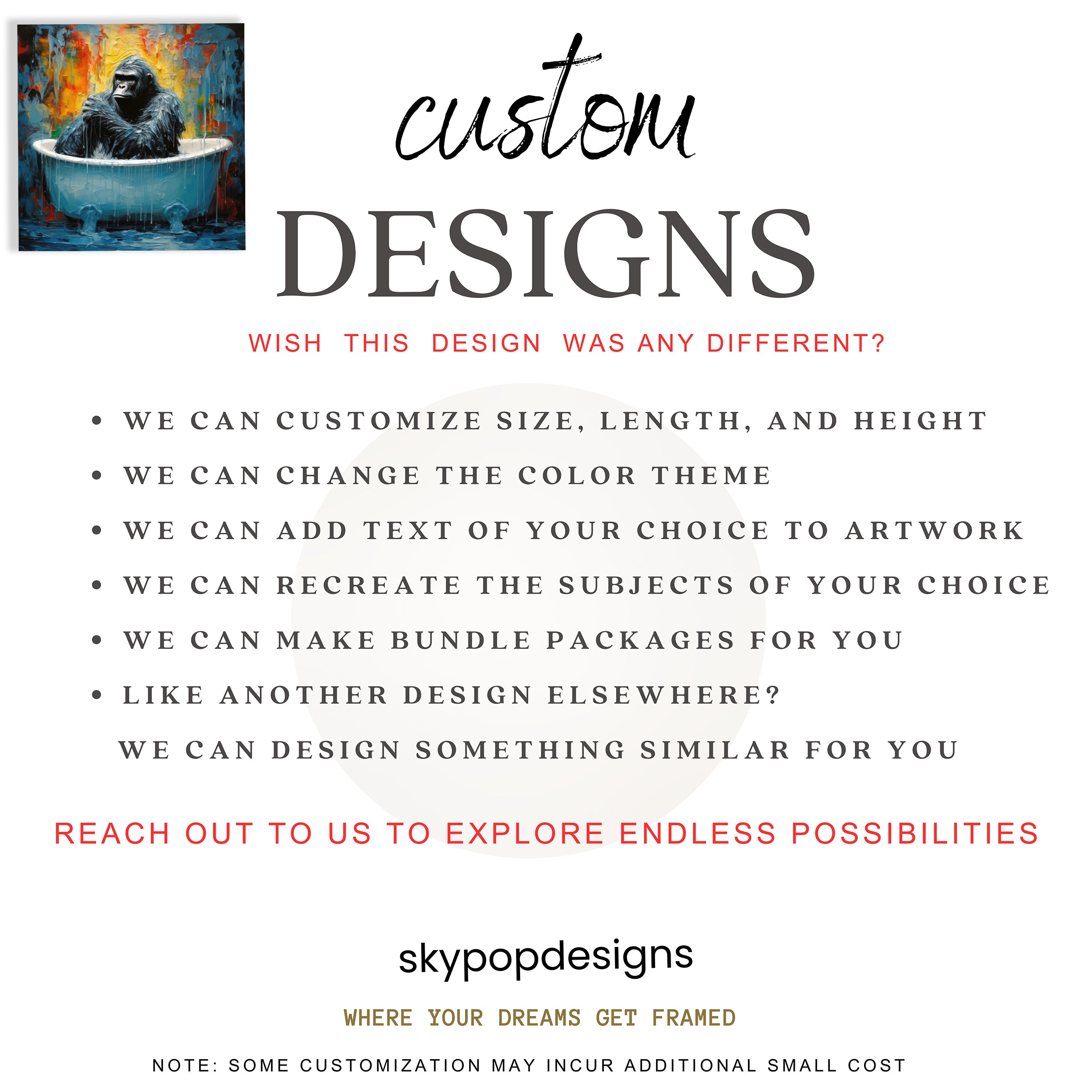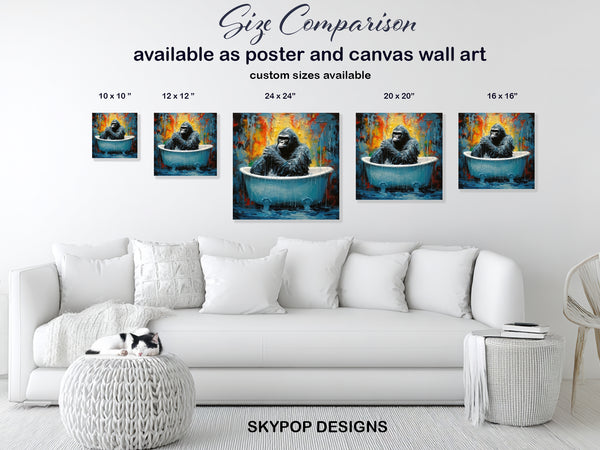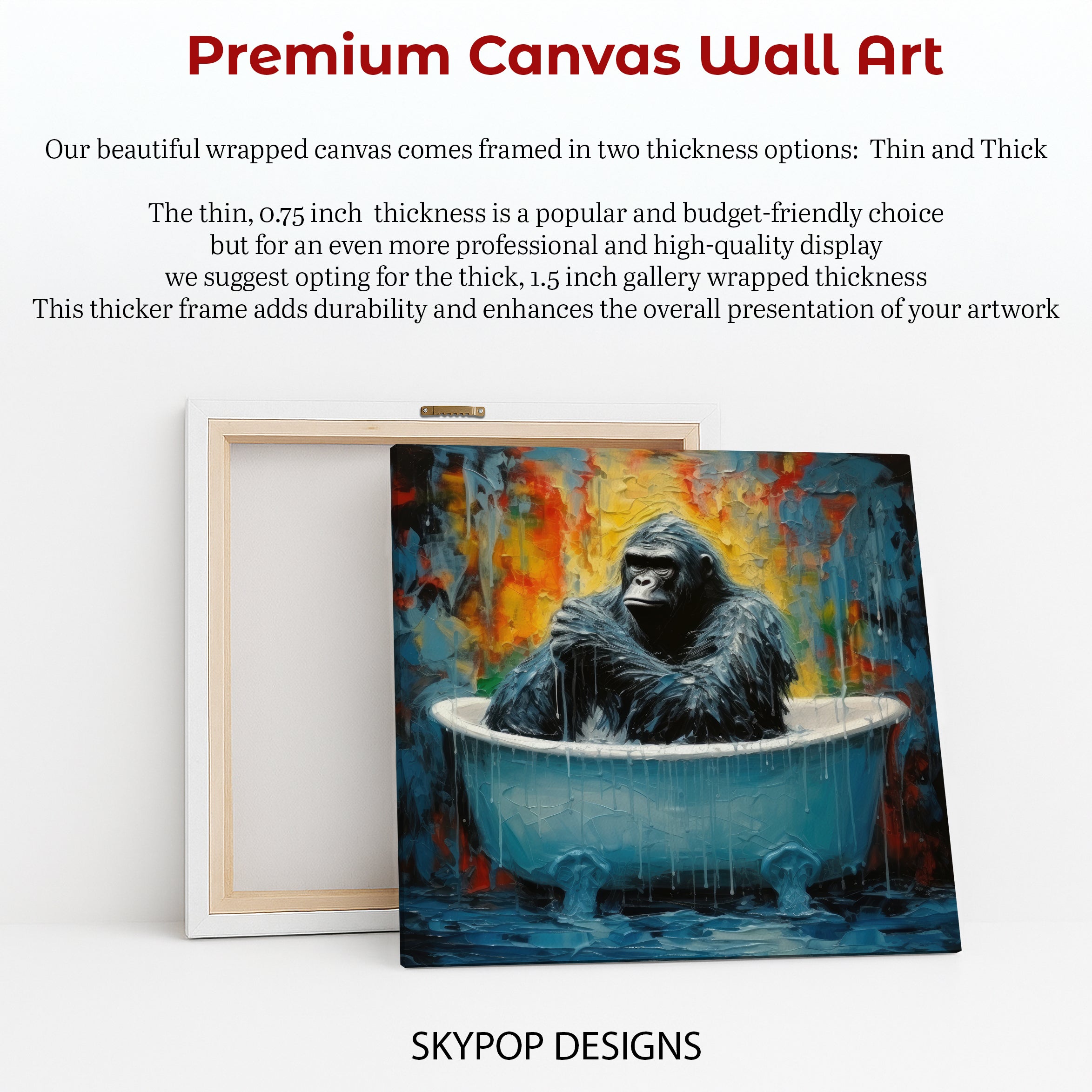 Keywords: Gorilla canvas art, Animal wall art, Abstract art, Contemporary art, Modern decor, Bohemian decor, Living room art, Bathroom decor, Game room art, Office wall art, Blue art, Multicolor art, Yellow art, Black art, Gorilla painting, Bathtime art, Unique wall art, Statement piece, Home decor, Wall decor, Canvas print, Poster art, Expressive art, Nature inspired, Art enthusiast gift, Animal lover gift, Textured art, Bold art, Sophisticated whimsy, Conversation starter