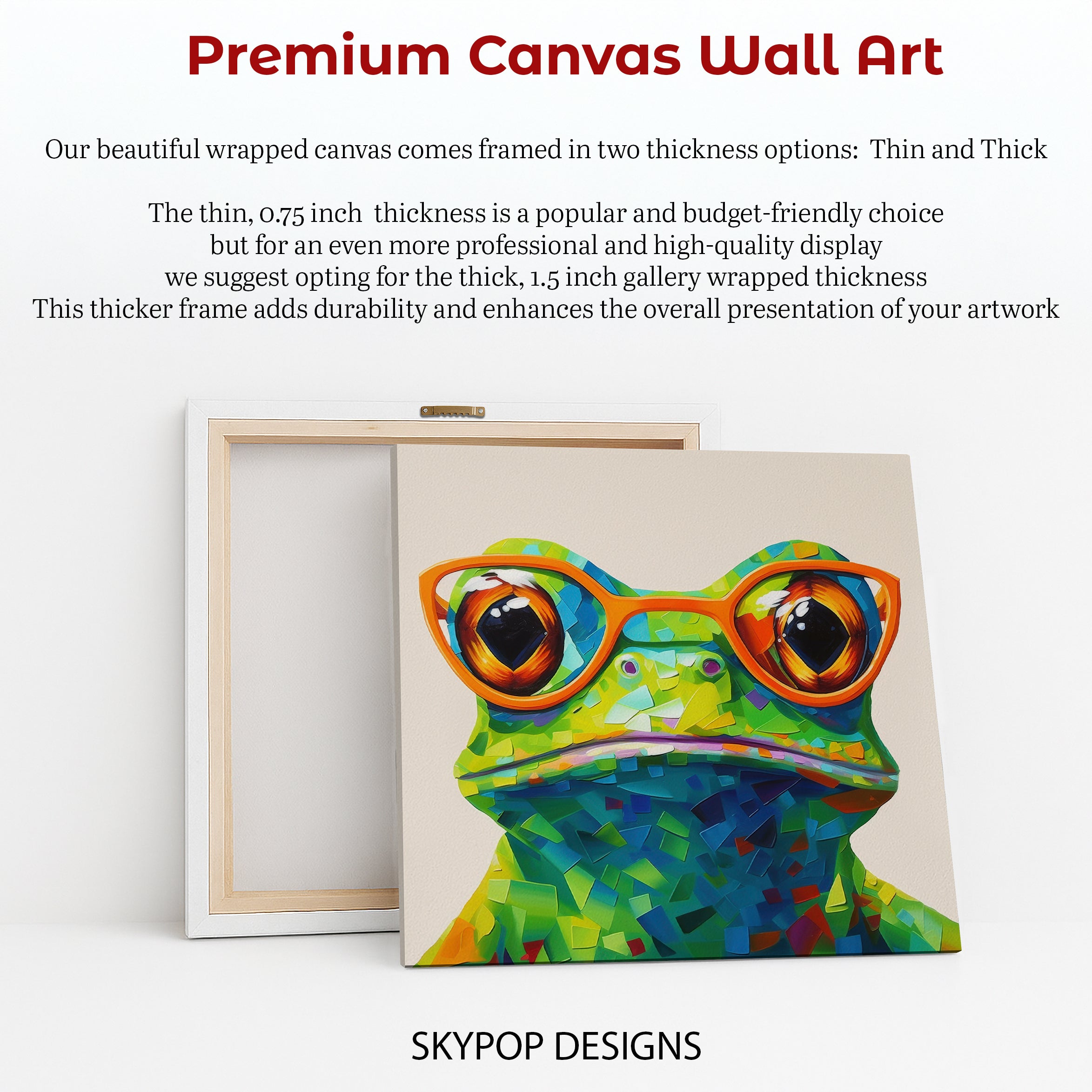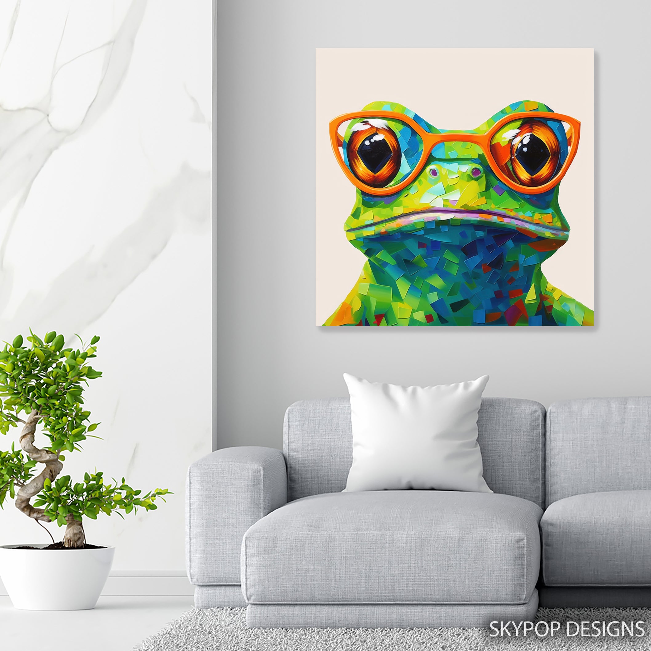 Transform your space with this vibrant frog canvas wall art featuring a cool frog sporting colorful sunglasses. This captivating piece of pop art and abstract art will elevate any contemporary or bohemian living room, bedroom, or office. The striking combination of greens, oranges, and blues creates a playful and energetic mood, bringing life to your walls. This wall art, also available as a poster, is perfect for adding a splash of personality to modern decor. Its unique style makes it an ideal gift for birthdays or housewarmings, sure to spark joy and conversation. The textured brushstrokes and bold colors create a striking visual appeal that complements various interior design styles. Showcase your love for quirky animal art with this eye-catching canvas print. Whether you're looking to enhance a children's room or add a fun element to your adult spaces, this artwork delivers. Bring a sense of whimsy and modern flair into your home with this stunning frog poster. Elevate your decor today with this unique and vibrant piece of wall art.
