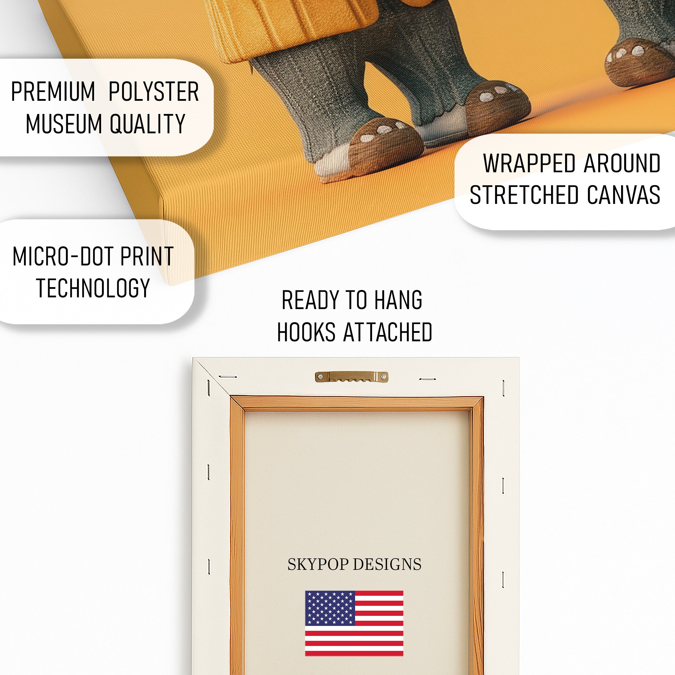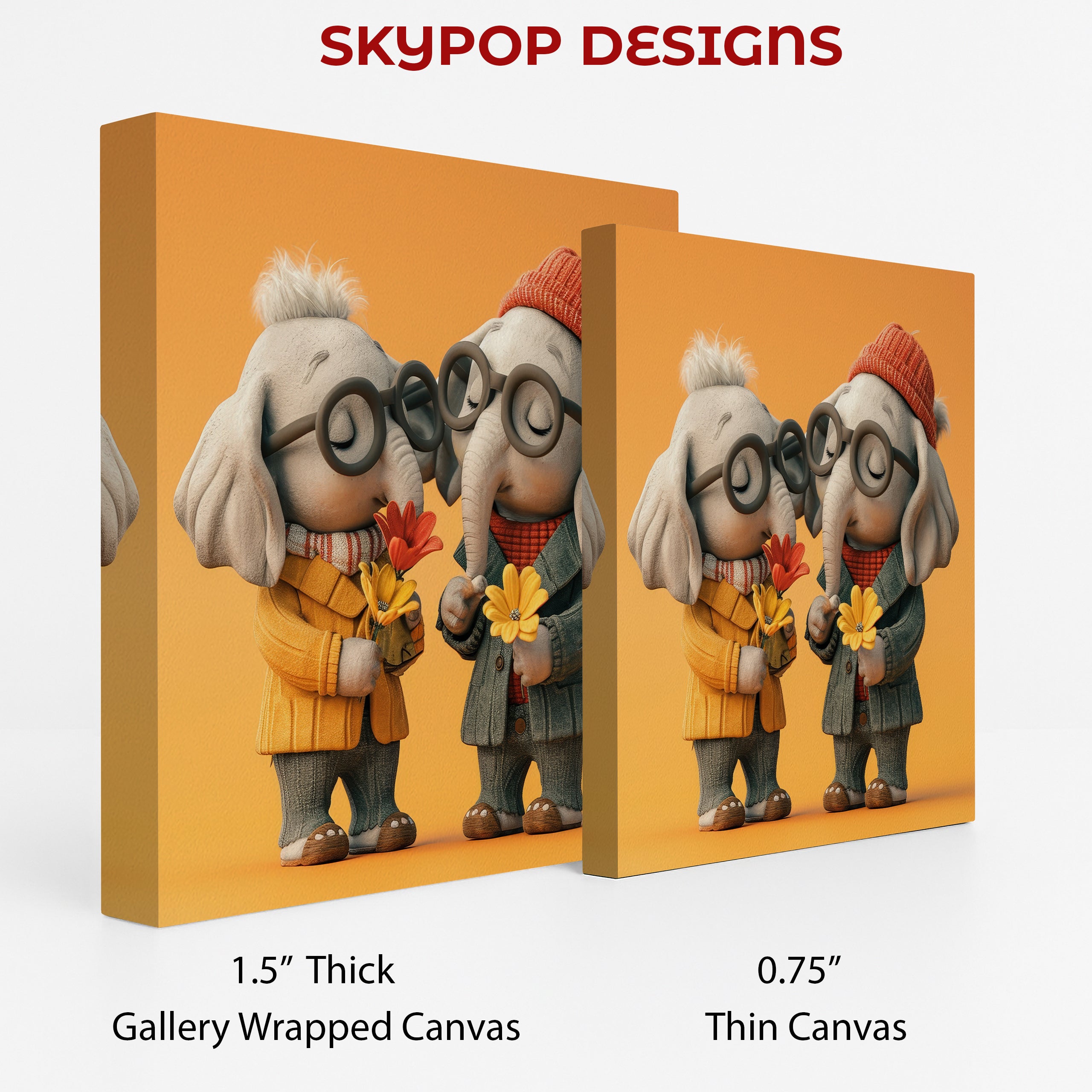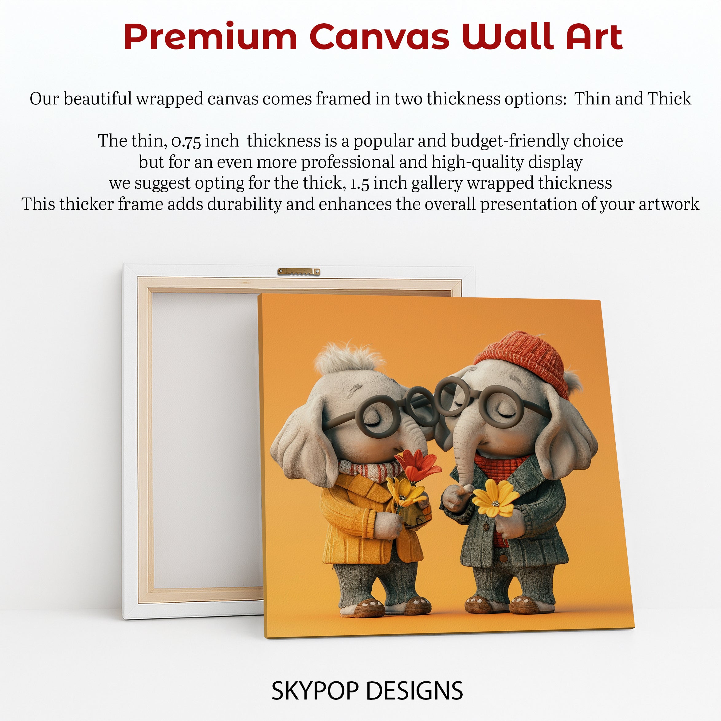 Transform your space with this heartwarming elephant canvas wall art, featuring two charming elephants sharing a tender moment with colorful flowers. This delightful poster blends whimsical animal art with modern and Scandinavian decor styles, making it perfect for a living room, children's room, or bedroom accent. The vibrant yellow and orange flowers pop against the elephants' characterful design and the warm, orange backdrop, evoking feelings of joy and affection. This unique canvas wall art is ideal as a gift for anniversaries, birthdays, or housewarmings, adding a touch of charm and personality to any home. The eye-catching, playful composition of this poster will elevate your wall decor, creating a focal point that sparks conversation and smiles. High-quality printing ensures the intricate details, from the elephants' cozy outfits to the delicate petals of the flowers, are beautifully preserved. Whether you're aiming for a minimalist feel or a more eclectic style, this versatile artwork enhances any chosen aesthetic. Give your walls a dose of happiness and warmth with this captivating elephant artwork, a perfect addition to your collection of canvas prints. This stunning piece is sure to bring a cheerful vibe to your chosen room, celebrating love and simple joys. Elevate your home with this adorable elephant wall art today.