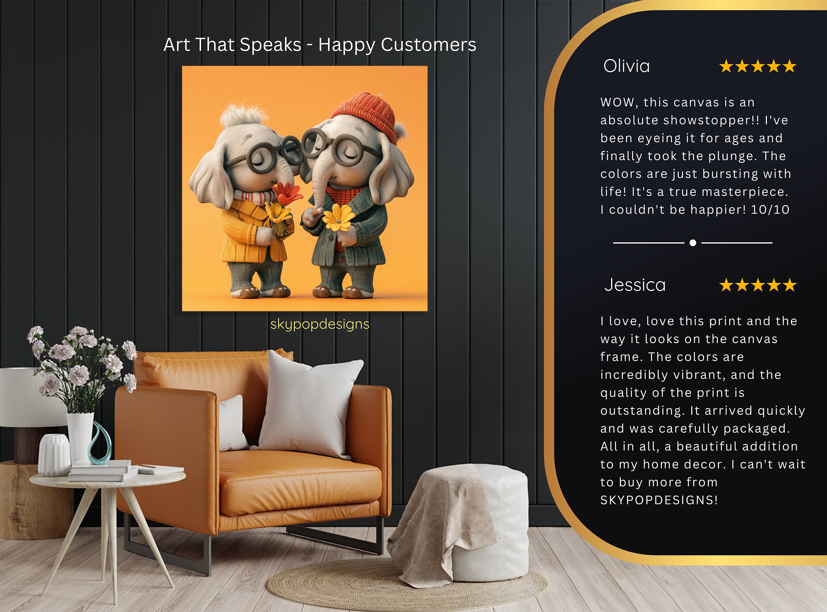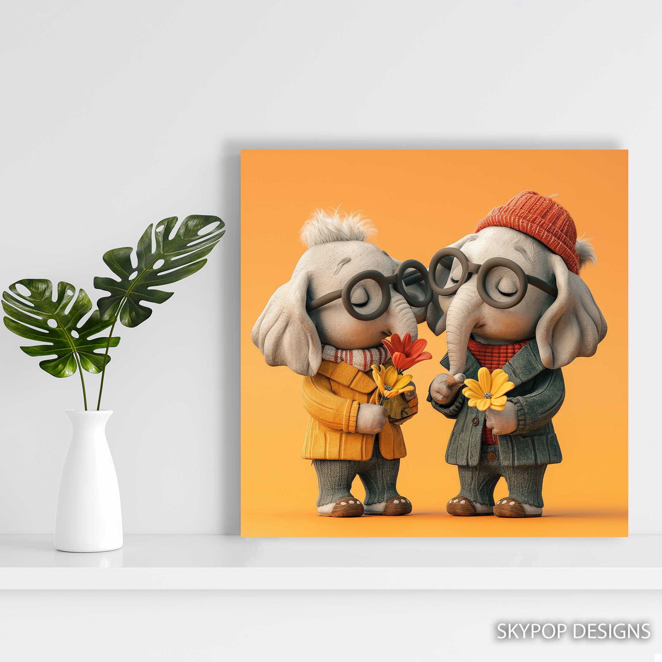 Keywords: Whimsical Elephant Art, Elephant Couple Art, Animal Wall Art, Canvas Wall Art, Poster Print, Modern Decor, Contemporary Art, Scandinavian Style, Living Room Art, Children's Room Decor, Bedroom Artwork, Nursery Wall Art, Yellow Decor, Orange Art, Grey Accents, Multicolor Artwork, Elephant Lover Gift, Anniversary Gift, Birthday Present, Housewarming Gift, Joyful Art, Affection Artwork, Playful Wall Decor, Unique Home Decor, Figurative Art, Flower Art, Cozy Home Decor, Wall Art Prints, Animal Couple, Whimsical decor