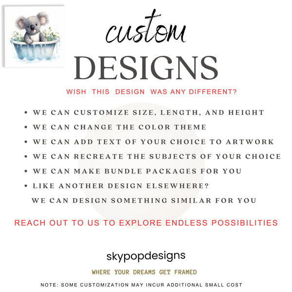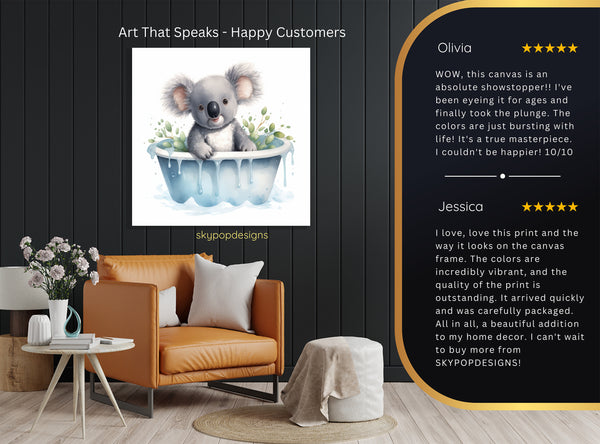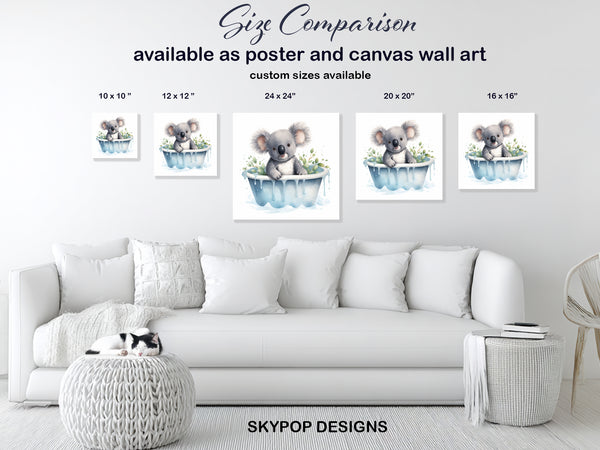 Keywords: Koala Wall Art, Animal Art, Nature Art, Whimsical Art, Bathroom Art, Nursery Decor, Children's Room Art, Bedroom Art, Modern Decor, Scandinavian Decor, Minimalist Decor, Grey Art, Blue Art, White Art, Multicolor Art, Koala Bathtime Art, Watercolor Art, Canvas Print, Home Decor, Wall Decor, Cute Koala, Baby Shower Gift, Birthday Gift, Housewarming Gift, Playful Art, Calm Art, Joyful Art, Serene Art, Home Accents, Animal Lover Gift