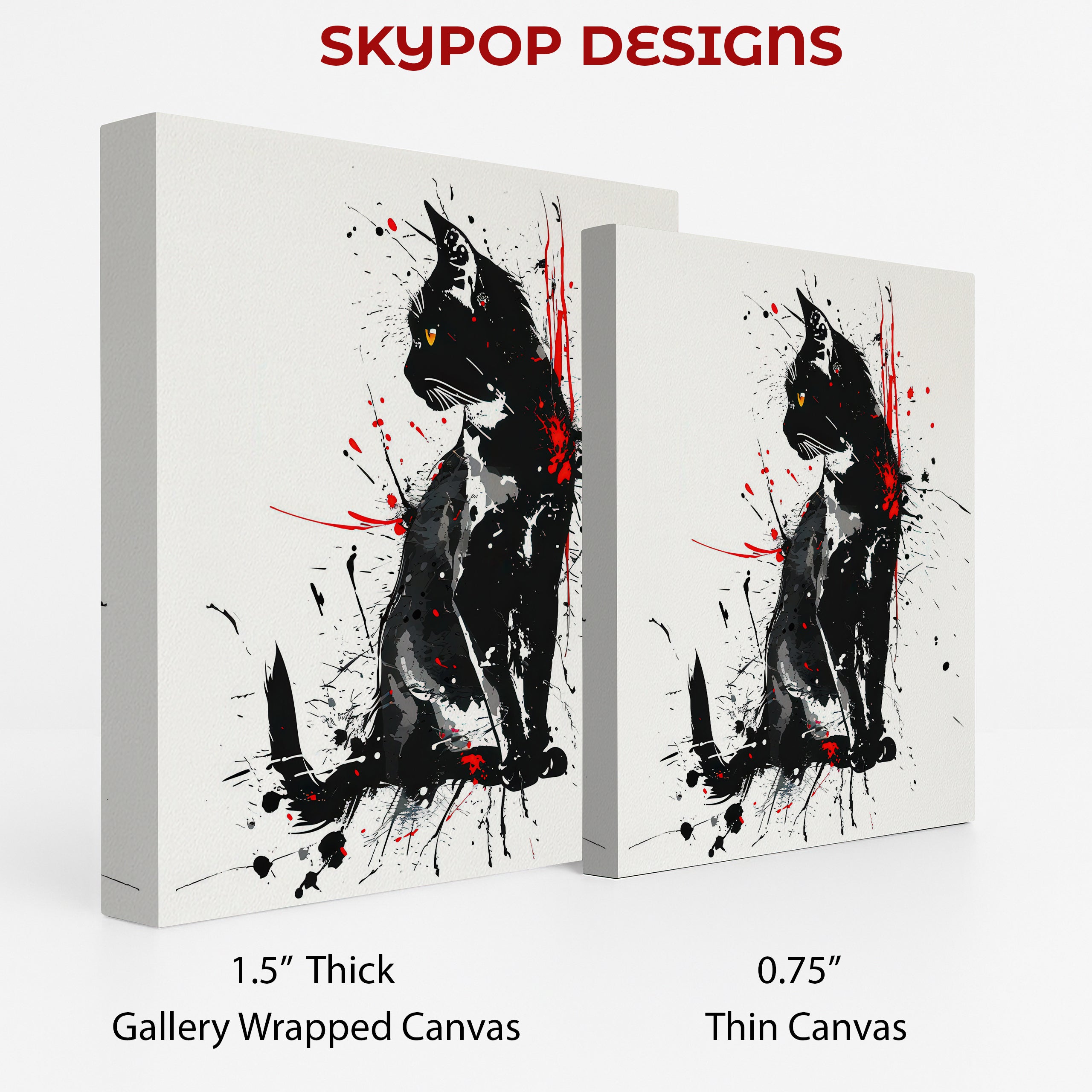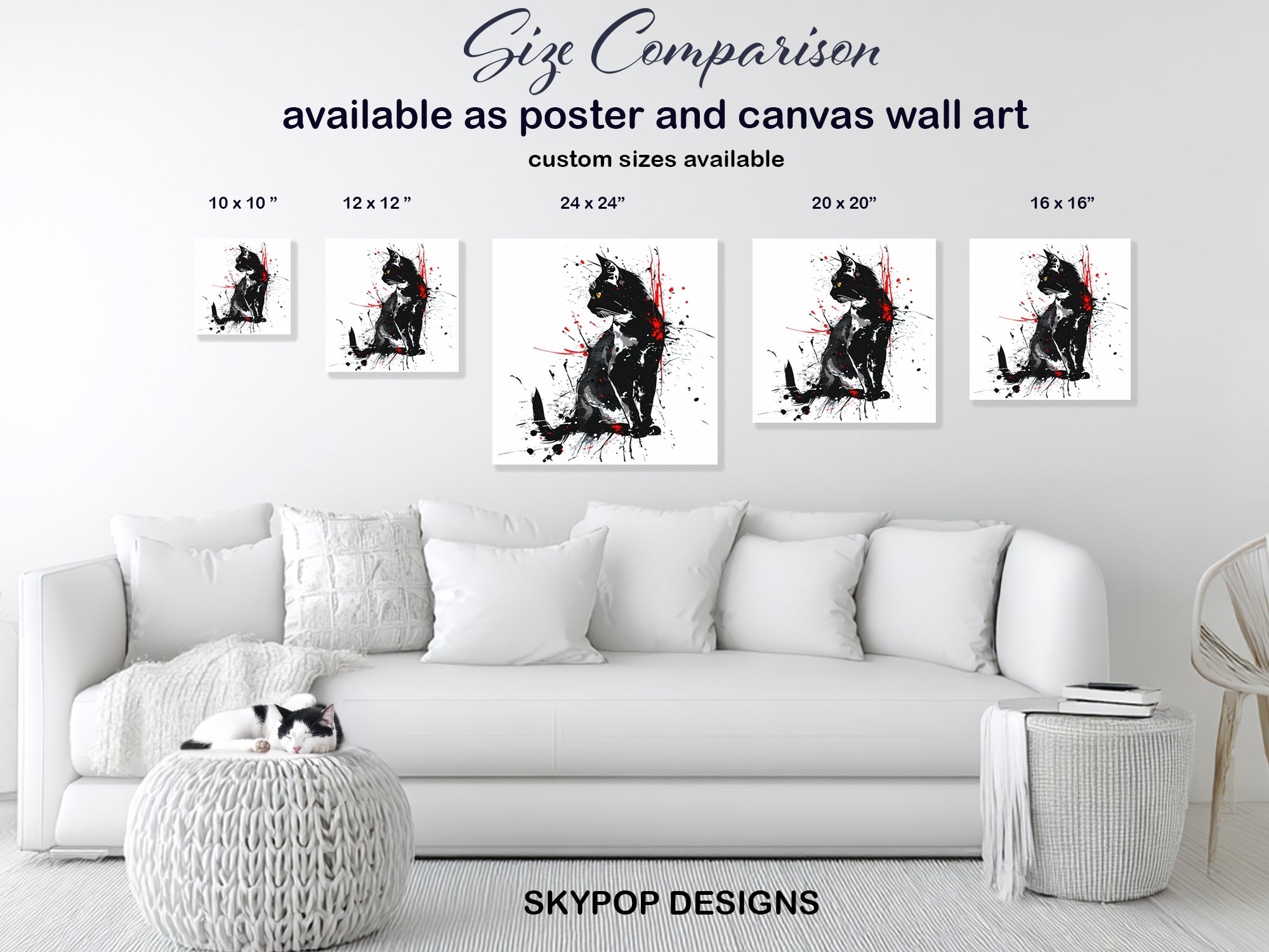 Black Cat Splatter Art, Canvas or Poster, Modern Minimalist Decor, Living Room Bedroom Office Hallway Wall Art, Black White Red Grey