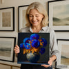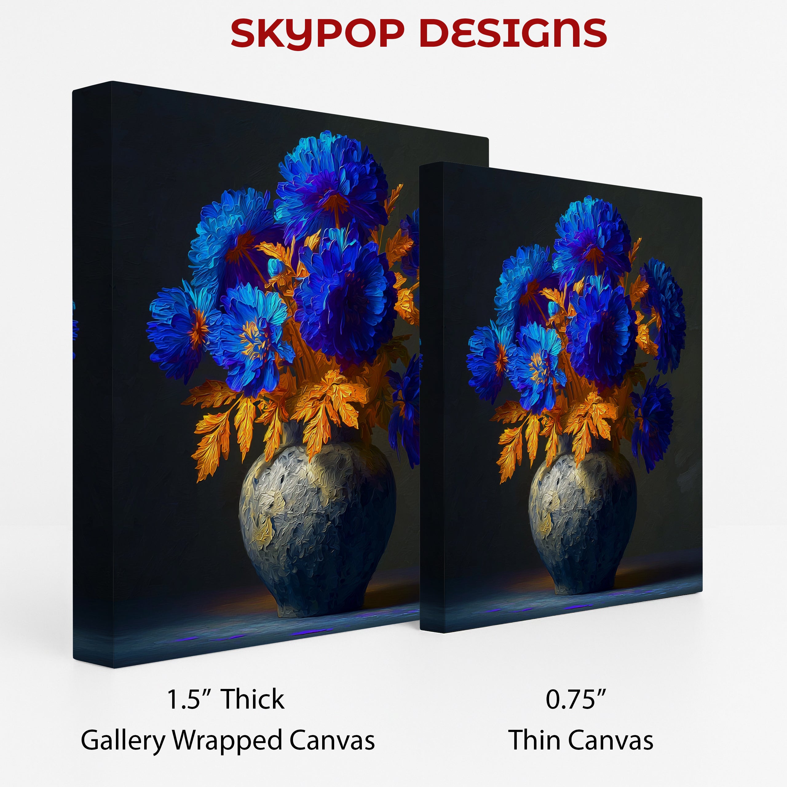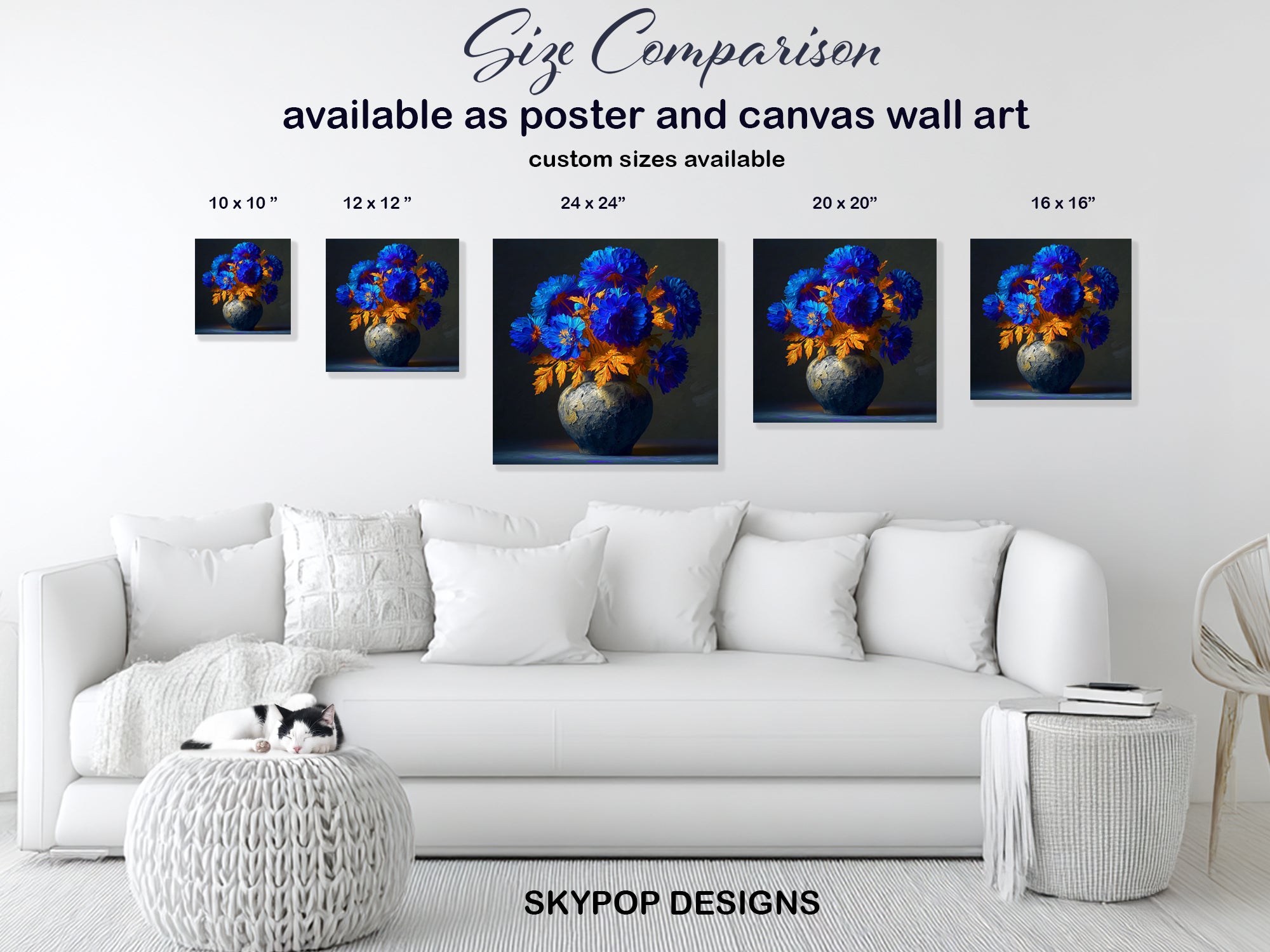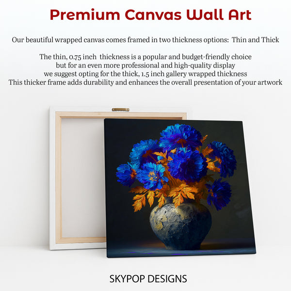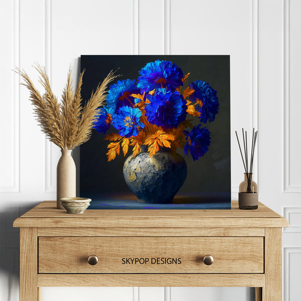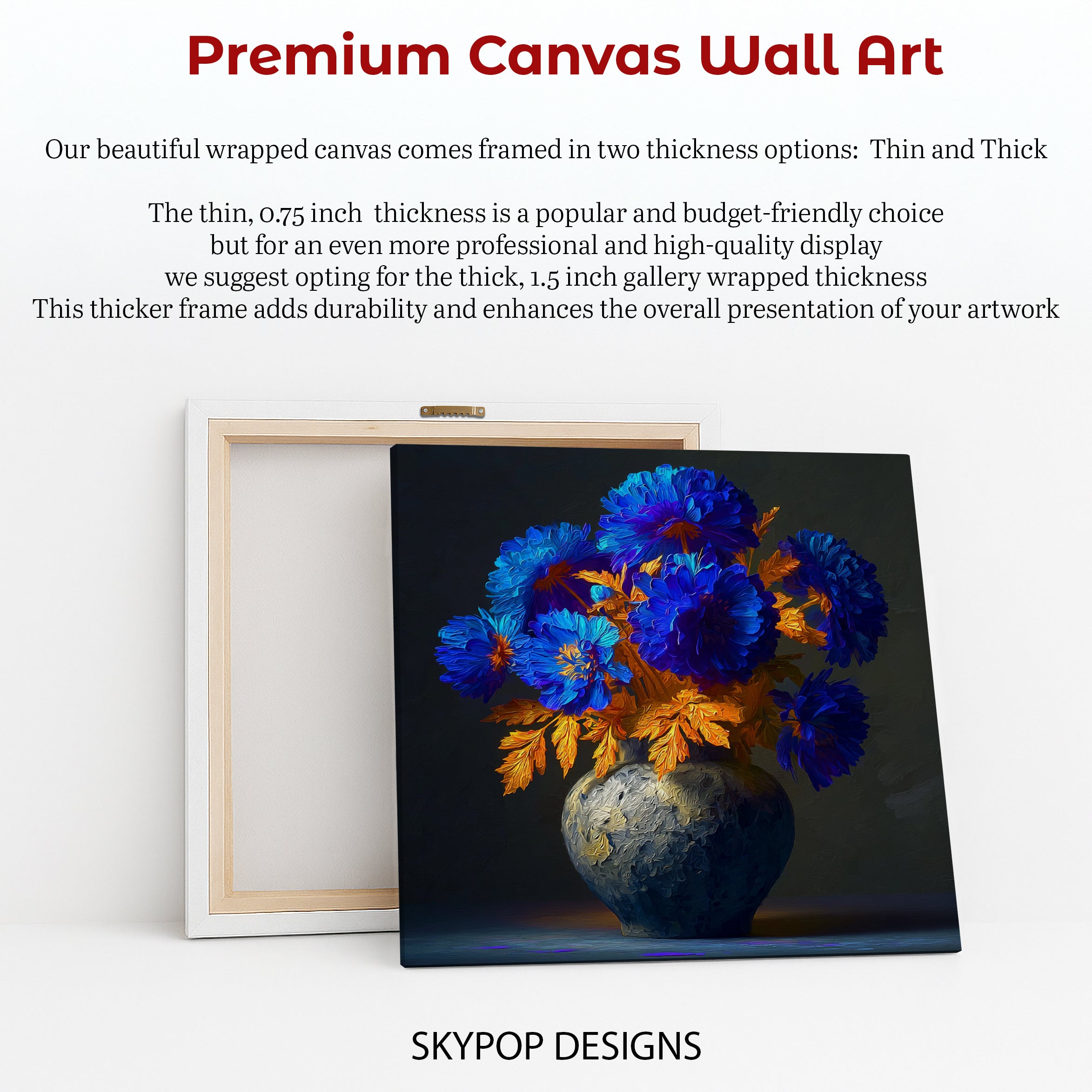 Elevate your home with this stunning floral canvas wall art, showcasing a captivating bouquet of vibrant blue dahlias. The rich blue hues paired with radiant golden leaves create a striking contrast that will transform any room into a sophisticated and welcoming space. This beautiful poster or canvas wall art is perfect for adding a touch of nature's beauty to your living room, dining room, or bedroom, complementing contemporary and even farmhouse decor styles. The textured brushstrokes evoke a sense of classic impressionism, adding depth and artistic flair to this eye-catching piece of wall art. Use this versatile artwork to enhance your hallway or entryway, creating an immediate visual impact. It makes an ideal gift for housewarming occasions, birthdays, or holidays, bringing joy and color to any recipient. This high-quality canvas print captures the intricate details of each bloom and leaf, ensuring a long-lasting and impressive display. The dark, moody background enhances the vibrant blues and golds, creating a dramatic yet elegant aesthetic. This piece is perfect for those looking to incorporate bold colors and natural elements into their modern home decor. Add a touch of timeless elegance and vibrant energy to your walls with this exquisite floral canvas wall art. Transform your space and inspire tranquility with this breathtaking botanical artwork today.