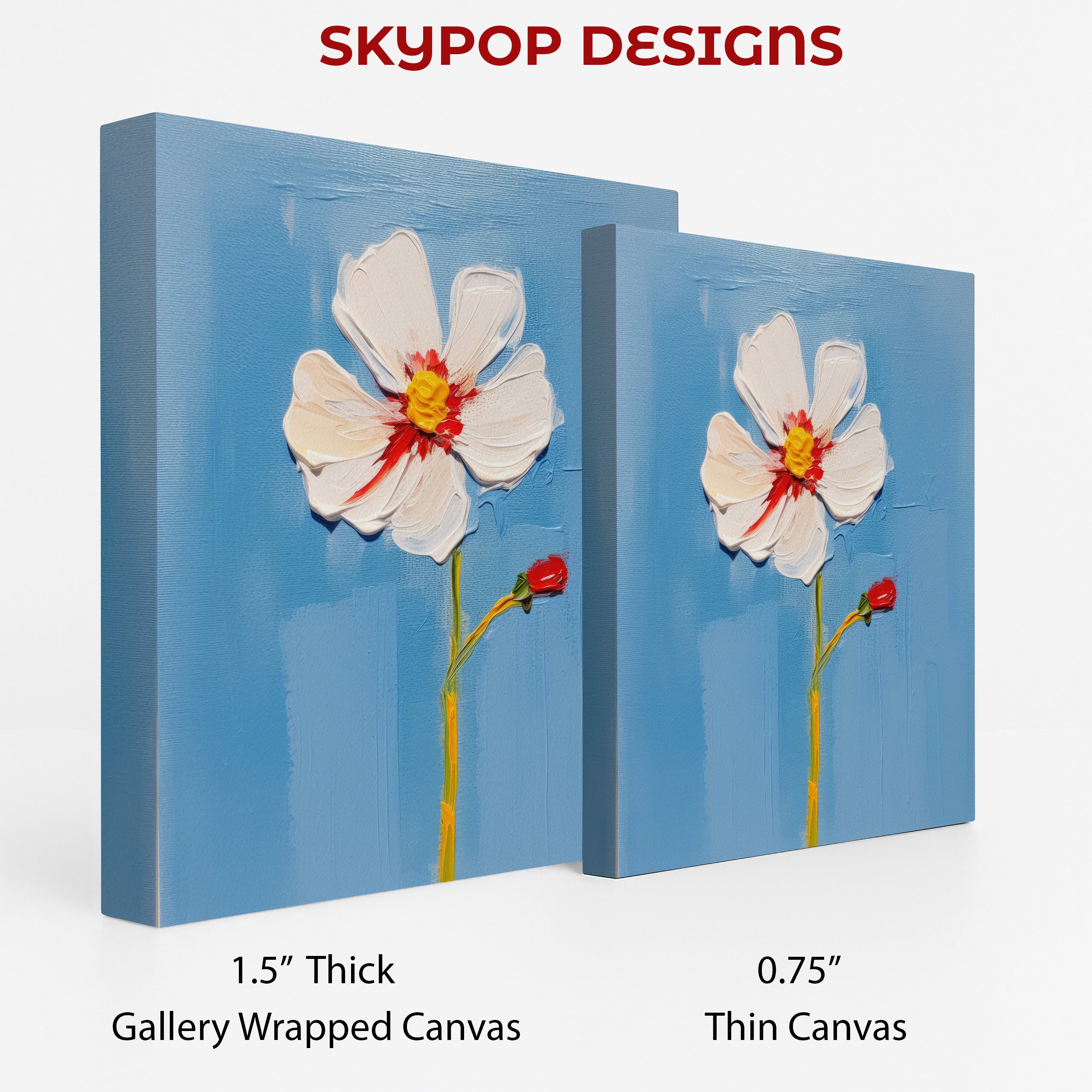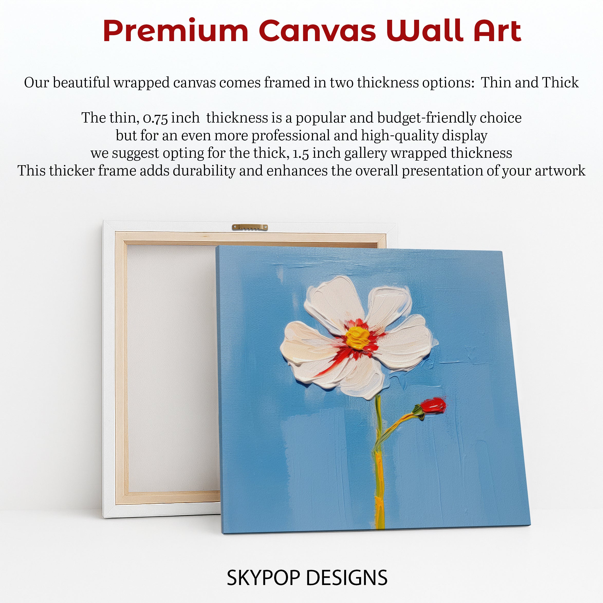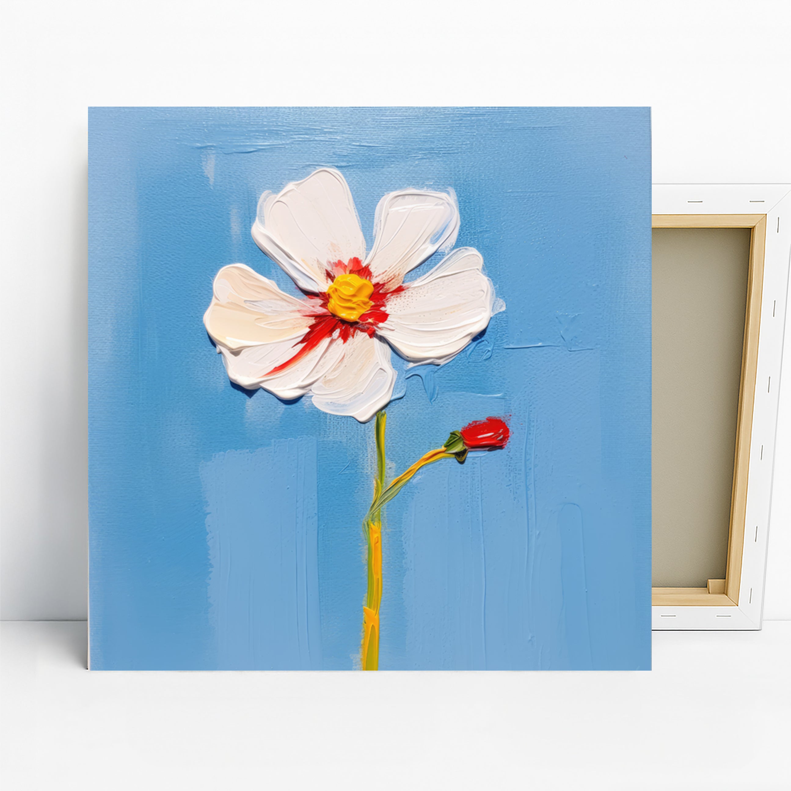 Enhance your home with striking flower wall art that captures the vibrant beauty of nature. This stunning canvas art piece features a bold, impressionistic flower with thick, textured brushstrokes that bring the artwork to life. The bright white petals, central yellow accent, and deep red touches pop against the serene blue background, creating a captivating focal point for any room. This poster or canvas wall art is perfect for a contemporary living room, a chic bedroom, or a welcoming entryway. The clean lines and minimalist subject matter make this flower canvas wall art versatile, fitting seamlessly into modern or minimalist decor styles. The cool blue background evokes a sense of calm and serenity, while the bold flower adds a touch of energy and optimism. This piece is ideal for anyone looking to add a touch of nature's artistry to their home, offering a fresh and artistic statement. It makes a thoughtful housewarming gift or a beautiful addition to seasonal decor. The textured quality of this wall art will be a conversation starter and a constant source of inspiration. Elevate your space with this beautiful impressionistic flower canvas art and bring the outdoors in with its captivating beauty and dynamic styling. Transform your walls with this unique and artistic representation of a single bloom today. This high-quality poster is printed on durable canvas, ensuring lasting vibrancy and detail.