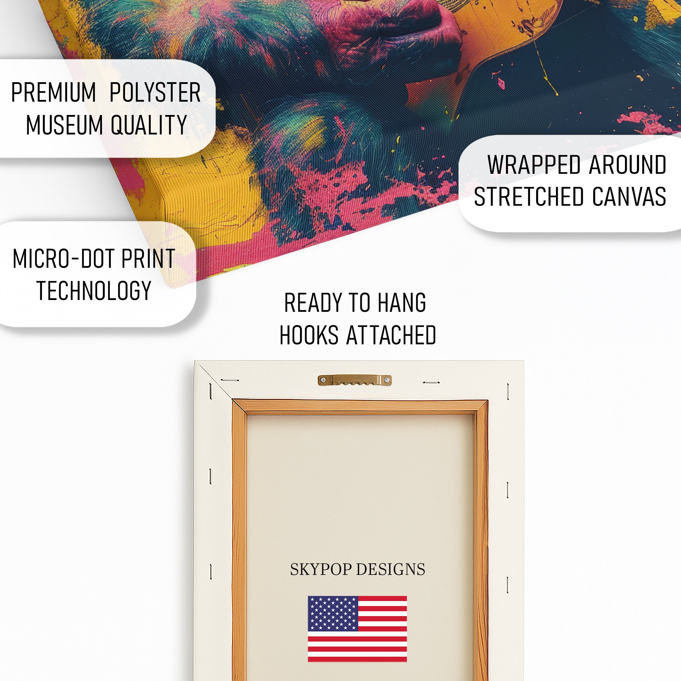 Bring vibrant sound and color into your home with this striking chimpanzee canvas wall art. This captivating piece showcases a chimpanzee strumming a guitar, rendered in a bold, abstract style with splashes of vibrant yellow, pink, and teal. It's perfect for transforming any living room or bedroom into a lively, artistic space. The energetic use of color in this poster adds a pop of personality, ideal for modern or eclectic decor styles. This chimpanzee wall art is a fantastic conversation starter and adds a unique touch to your home decor. Celebrate music and nature with this striking canvas print that inspires creativity. The abstract elements and rich colors evoke a sense of joy and freedom, making it a perfect addition to a stylish office or eclectic entryway. Whether you're a music lover or an art enthusiast, this versatile artwork enhances your space. This stunning poster is also a memorable gift for birthdays, holidays, or housewarmings. Elevate your wall decor with this high-quality canvas print that brings personality and artistic flair to any room. Transform your space with this uniquely captivating chimpanzee artwork today.
