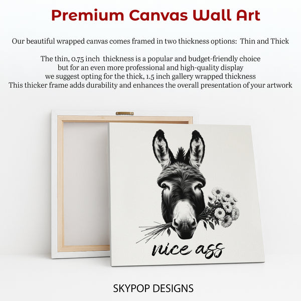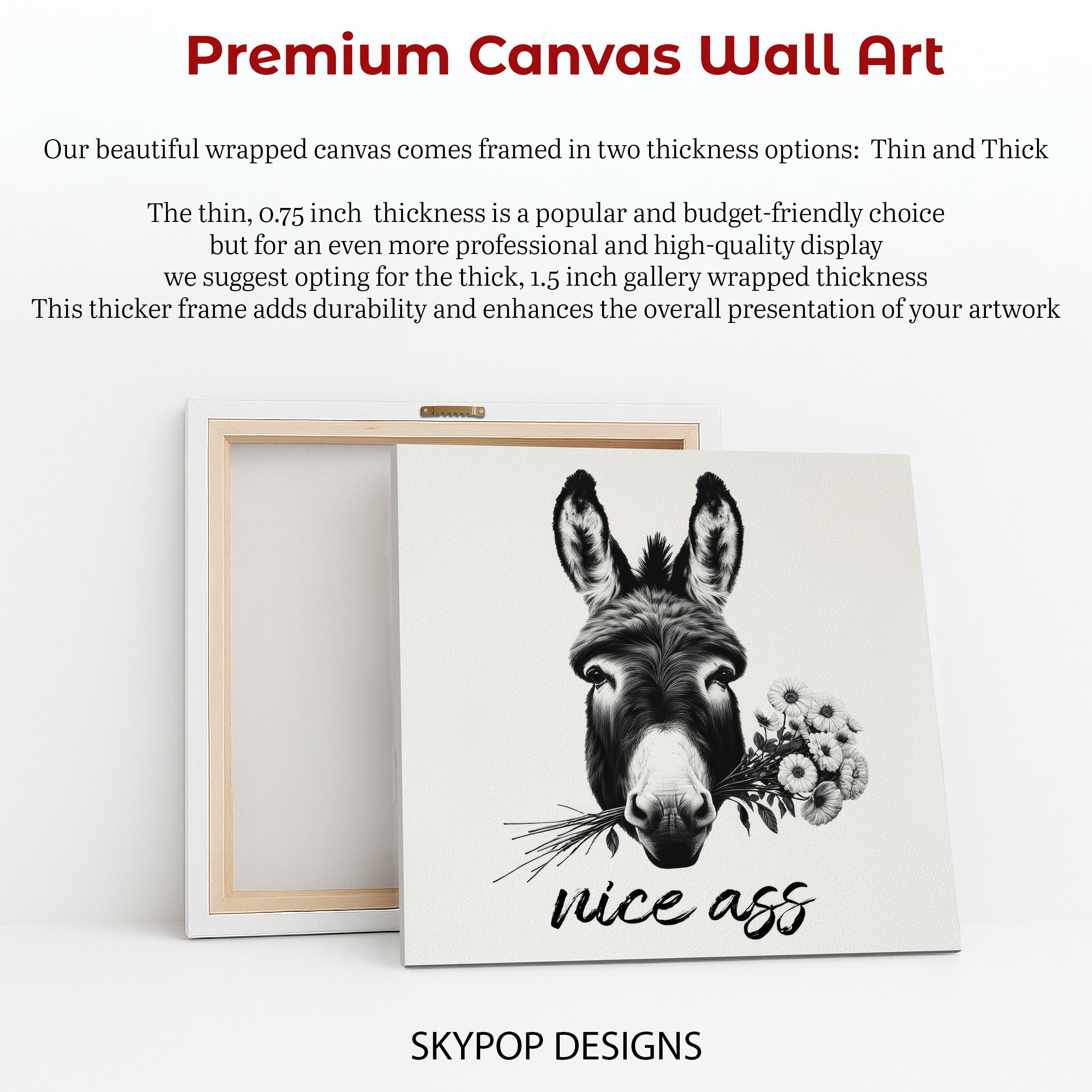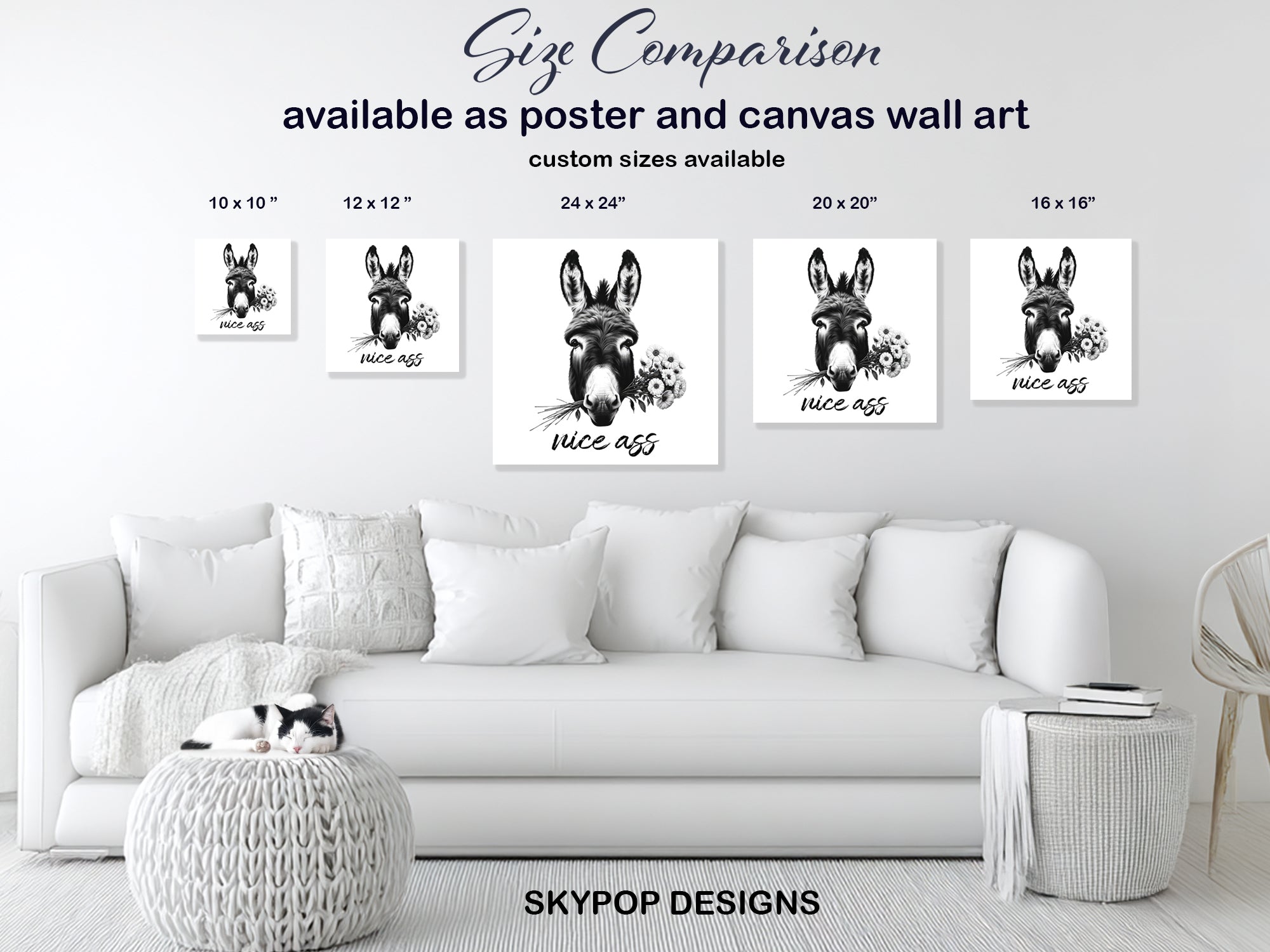 Transform your living space with this striking donkey canvas wall art, a unique piece that blends animal art with a touch of edgy graffiti style. This captivating poster showcases a beautifully rendered donkey with a bouquet of delicate white flowers, creating a bold yet charming statement. The black and white palette, accented with subtle multicolor tones from the flowers, makes this artwork incredibly versatile, fitting seamlessly into modern, bohemian, or eclectic decor styles. Elevate your bedroom, office, or hallway decor with this eye-catching canvas wall art that is sure to spark conversation. The intricate details of the donkey's fur and the delicate rendering of the blooms in this poster add a layer of sophistication to the playful theme. It's the perfect wall art to add personality to your home, offering a fresh and contemporary feel. This art celebrates individuality and is ideal for anyone looking to enhance their space with unique animal-themed decor. The contrast between the donkey's stoic gaze and the soft floral arrangement creates a compelling visual narrative. This high-quality canvas wall art or poster is an excellent gift for housewarmings, birthdays, or any occasion where a memorable present is desired. Make a statement with this original piece that brings an artistic and slightly humorous touch to any room. Add character and style to your walls; this donkey artwork is more than just decor, it's a mood elevator.Shop this stunning donkey canvas wall art and let its charm embrace your home.