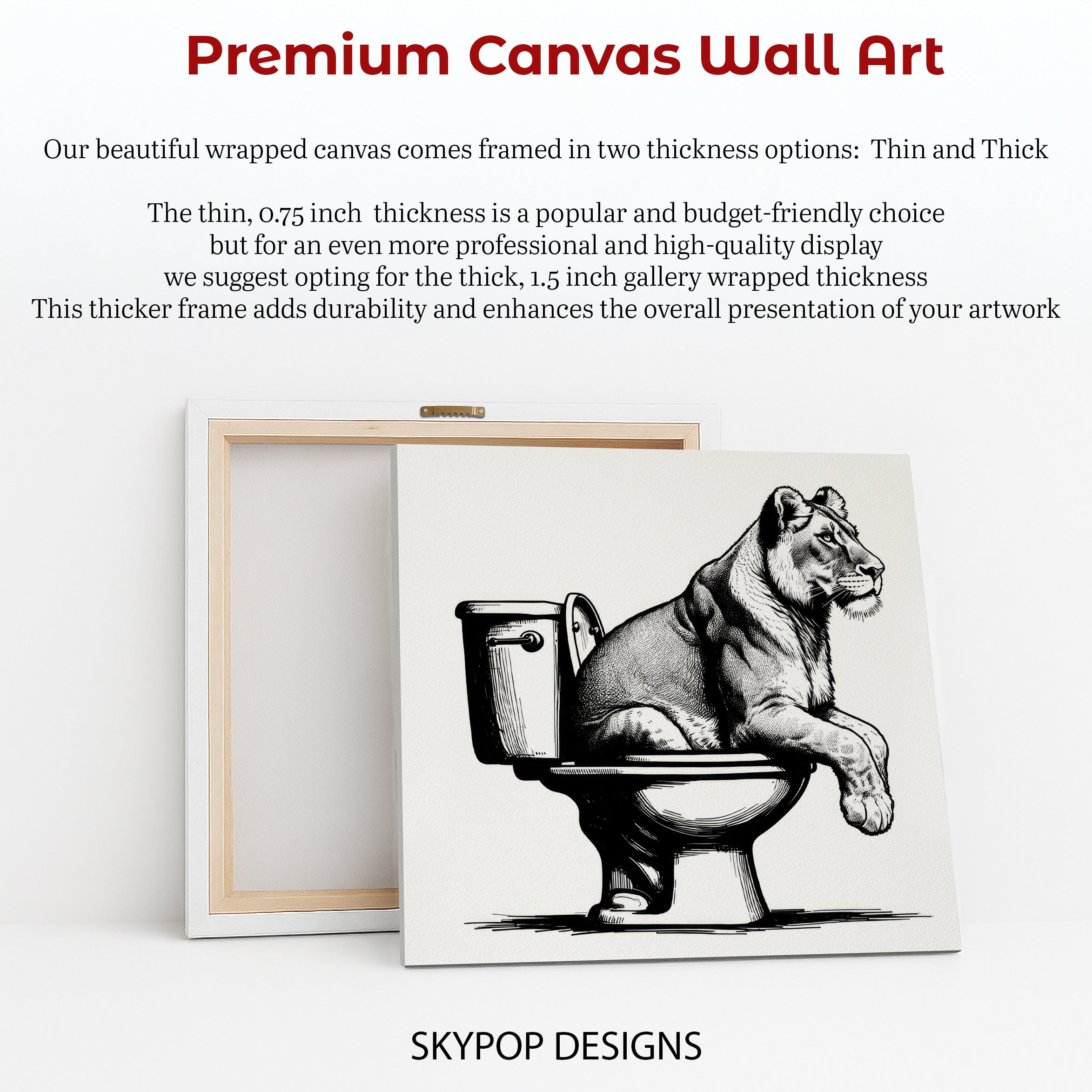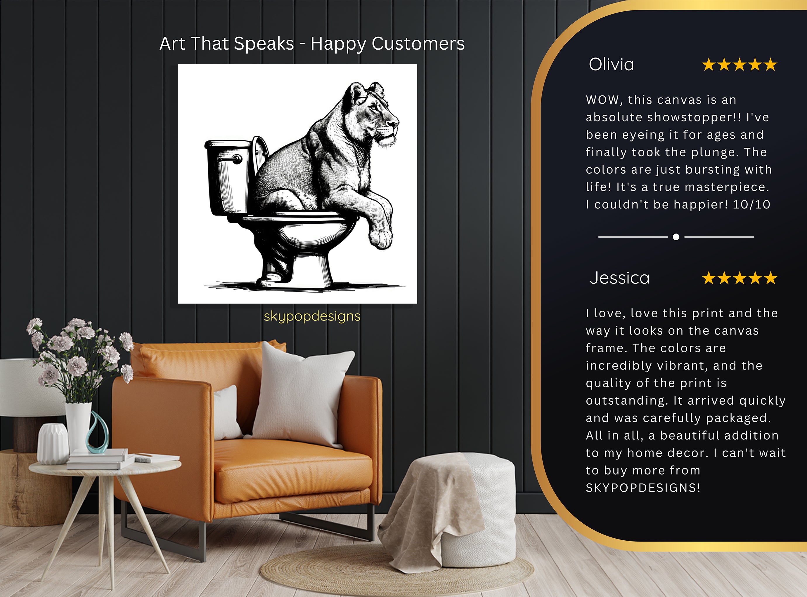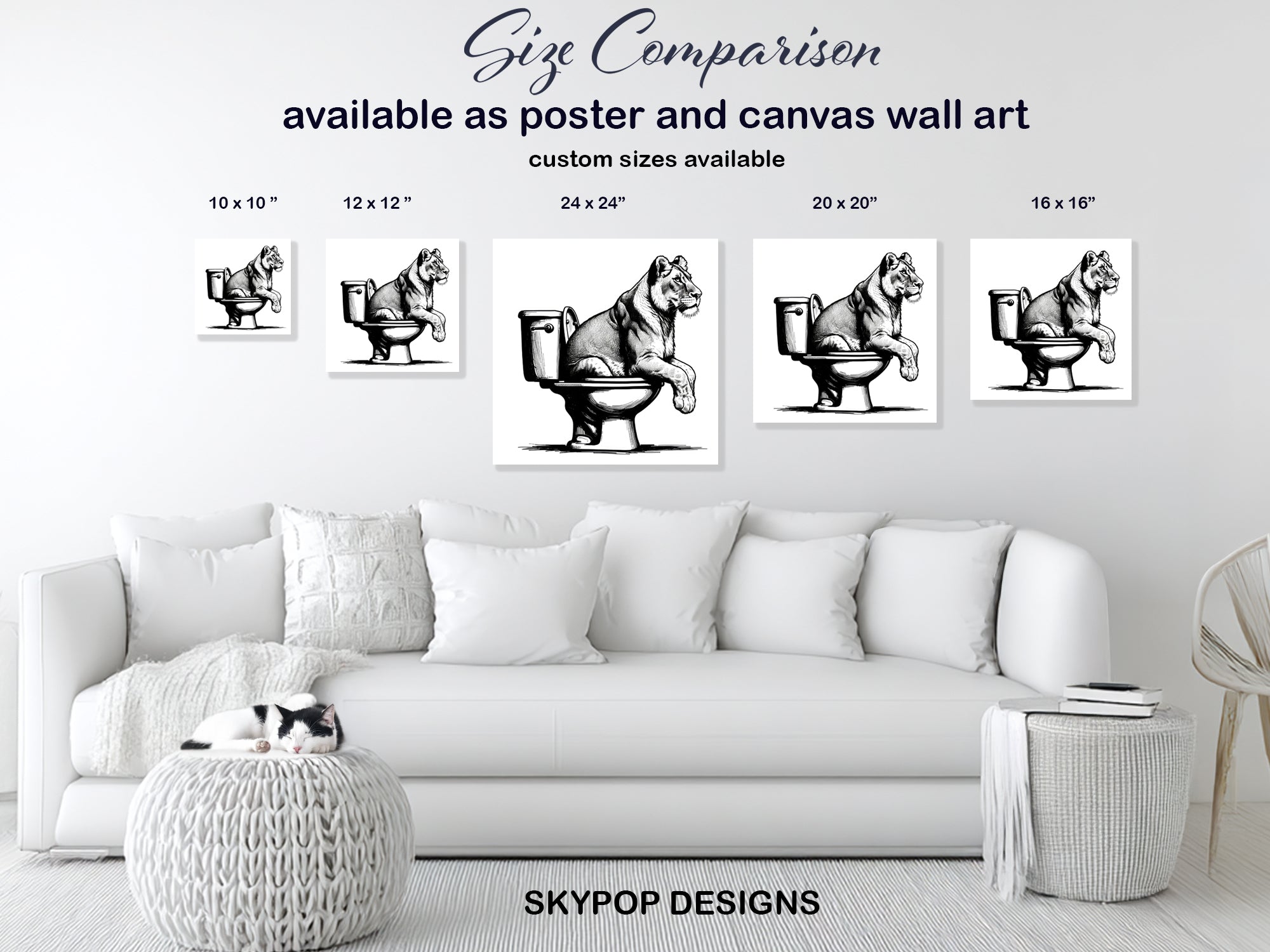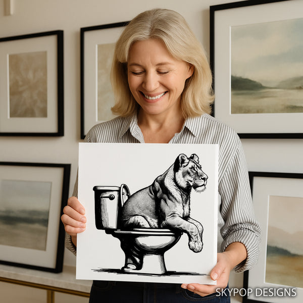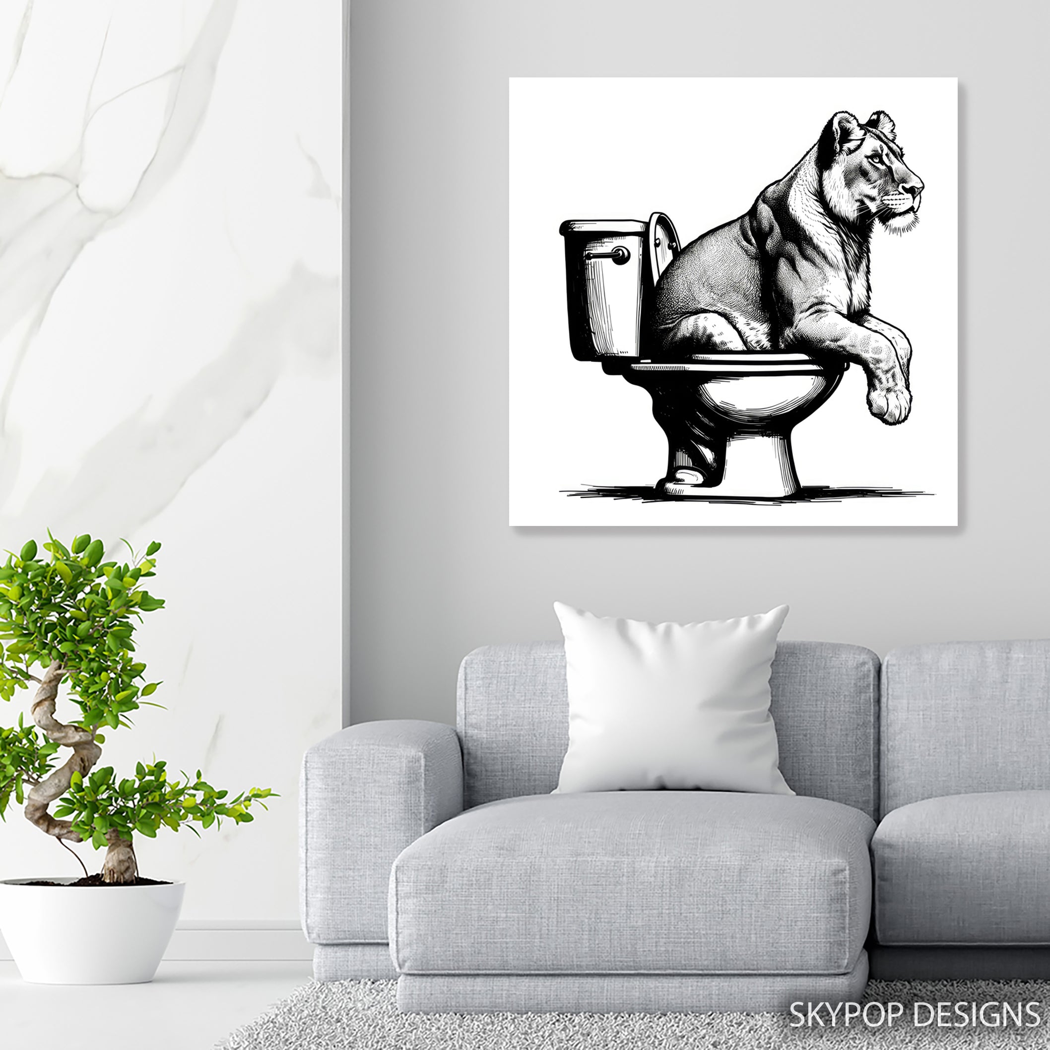 Transform your space with this striking lioness canvas wall art, a bold statement piece that adds immediate impact. This captivating poster features a beautifully rendered lioness in a humorous and unexpected pose, guaranteed to spark conversation and laughter. The dramatic black and white illustration, reminiscent of line art, creates a sophisticated yet playful focal point, perfect for modern and minimalist decor styles. Elevate your bathroom or living room with this unique wall art, ideal for adding a touch of unexpected glam or a pop of personality to any room. This canvas art is not just decor; it's an expression of daring and fun, showcasing the wild in a comfortable setting. Its high contrast design makes it a stand-out piece, drawing the eye and captivating viewers. Enhance your office or entryway with this versatile artwork, suitable for a range of contemporary interiors. This poster or canvas wall art makes an excellent gift for anyone who appreciates wit and originality, perfect for housewarmings or as a birthday surprise. The quality printing ensures sharp details and impactful visuals, making this lion art a cherished addition to any art collection. Add a touch of regal humor to your home with this eye-catching lioness in a toilet canvas print. Elevate your interior design with this memorable and engaging piece of wall art today.