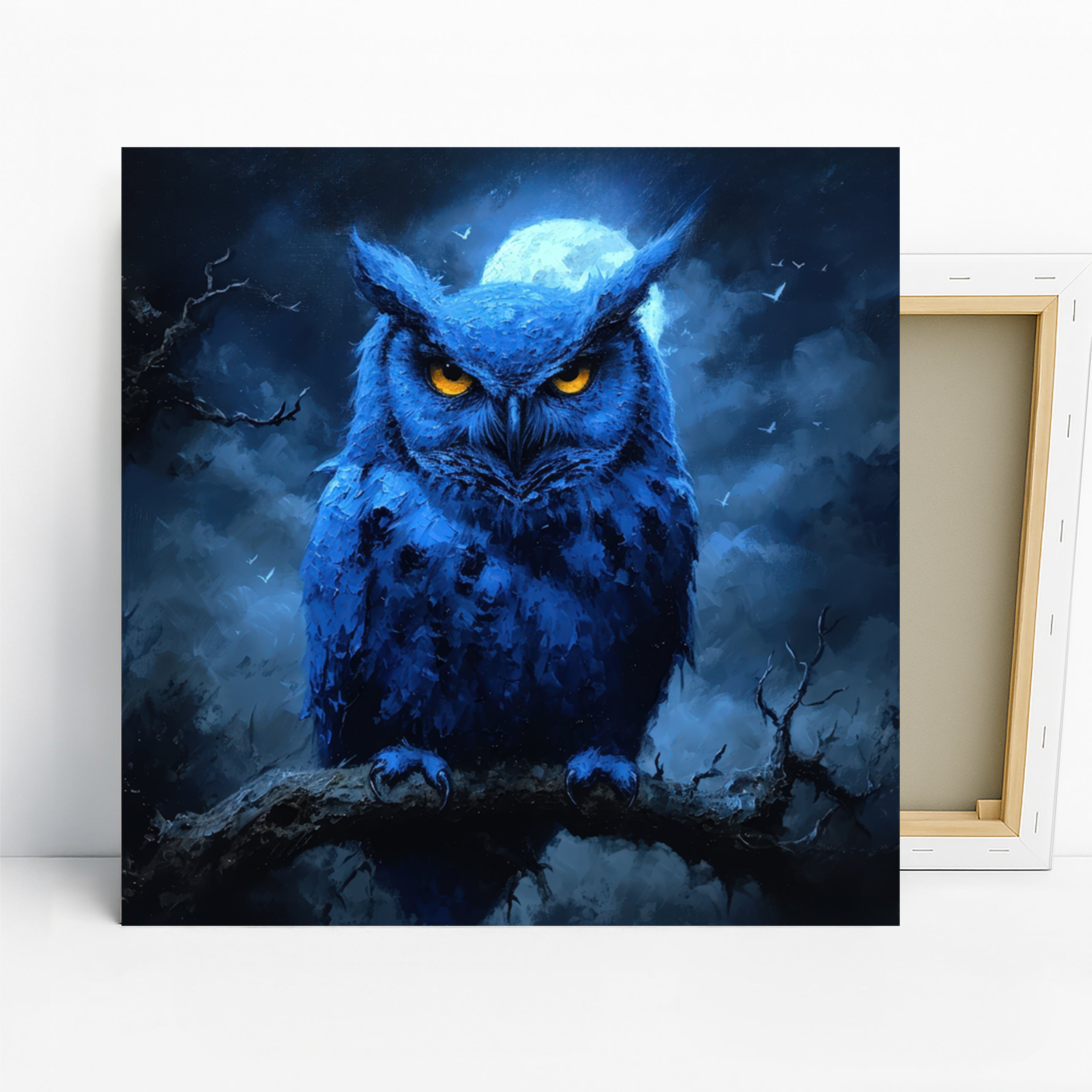 Transform your space with this striking owl canvas wall art, featuring a captivating owl with piercing yellow eyes against a deep blue, moonlit backdrop. The textured brushwork and abstract rendering create a powerful visual statement, perfect for adding a touch of mystique to any modern or contemporary living room. This stunning poster or canvas wall art will elevate your bedroom or office decor, bringing a sense of nocturnal beauty and intrigue. The rich blue hues evoke feelings of calm and mystery, enhanced by the vibrant contrast of the owl's illuminated eyes, making it a truly mesmerizing piece of wall decor. Ideal for those who appreciate minimalist yet impactful art, this owl imagery provides a sophisticated focal point for your home. It's a fantastic gift option for nature lovers or anyone seeking to add unique wall art to their collection, celebrating the enigmatic charm of the owl. This high-quality canvas print captures the depth and mood of the original artwork, ensuring it remains a conversation starter. Create an atmosphere of serene contemplation or powerful presence with this versatile artwork, a true statement piece for your home. Embrace the allure of the night sky and the wisdom of the owl with this captivating canvas wall art. Elevate your interior design with the enduring appeal of animal-themed art, designed to inspire and enchant. Discover the magic of this owl artwork and make your walls come alive with personality and style.