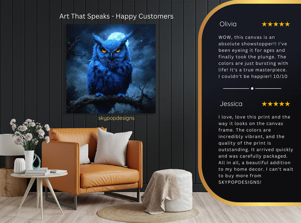 Keywords: Abstract Wall Art, Animal Art, Owl Art, Nature Art, Modern Decor, Contemporary Decor, Minimalist Decor, Living Room Art, Bedroom Art, Office Decor, Hallway Art, Blue Wall Art, Black Canvas Art, Yellow Eye Art, White Backdrop, Midnight Owl Mystique, Canvas Wall Art, Wall Poster, Textured Artwork, Abstract Owl, Piercing Yellow Eyes, Deep Blue Art, Moonlit Backdrop, Nocturnal Beauty, Intrigue Decor, Calm Atmosphere, Mystery Decor, Mesmerizing Art, Sophisticated Focal Point, Gift for Nature Lover