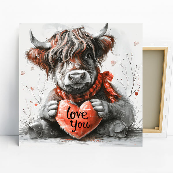 Bring heartwarming charm to your home with this captivating highland cow canvas wall art. This striking piece showcases a fluffy highland cow tenderly holding a bright red heart that says "love you," creating an instant emotional connection. The artful blend of detailed sketching, subtle red accents, and bold black lettering makes this poster a perfect focal point for any room seeking a touch of charm. It's ideal for farmhouse decor, adding a cozy and rustic feel to your living room, bedroom, or entryway. The heartwarming sentiment and adorable animal subject make this canvas wall art a wonderful gift for Valentine's Day, anniversaries, or housewarmings. The textured details and monochromatic base with pops of red enhance its visual appeal, making it a versatile addition to modern or traditional settings. This quality canvas print or poster will transform your space, radiating warmth and affection, and is perfect for creating a cozy, inviting atmosphere. Elevate your wall decor with this unique and lovable highland cow artwork that celebrates love and simple joys. Make your walls speak volumes of affection with this unique animal art piece today.