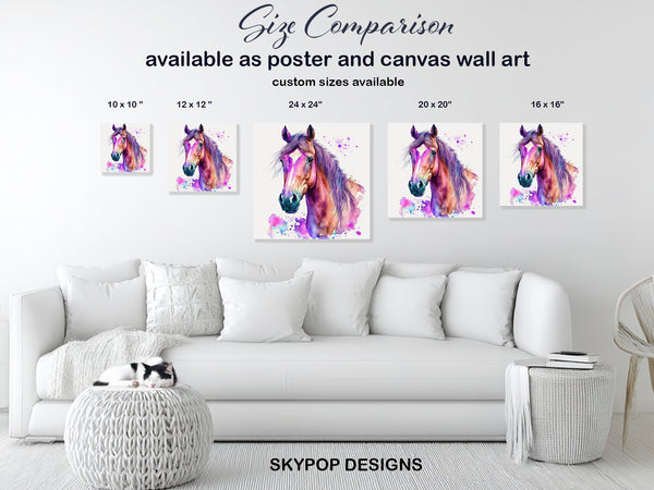 Horse Art, Canvas or Poster, Bohemian Modern Decor, Living Room Bedroom Office Wall Art, Purple Multicolor Pink Teal, Splash Animal Art