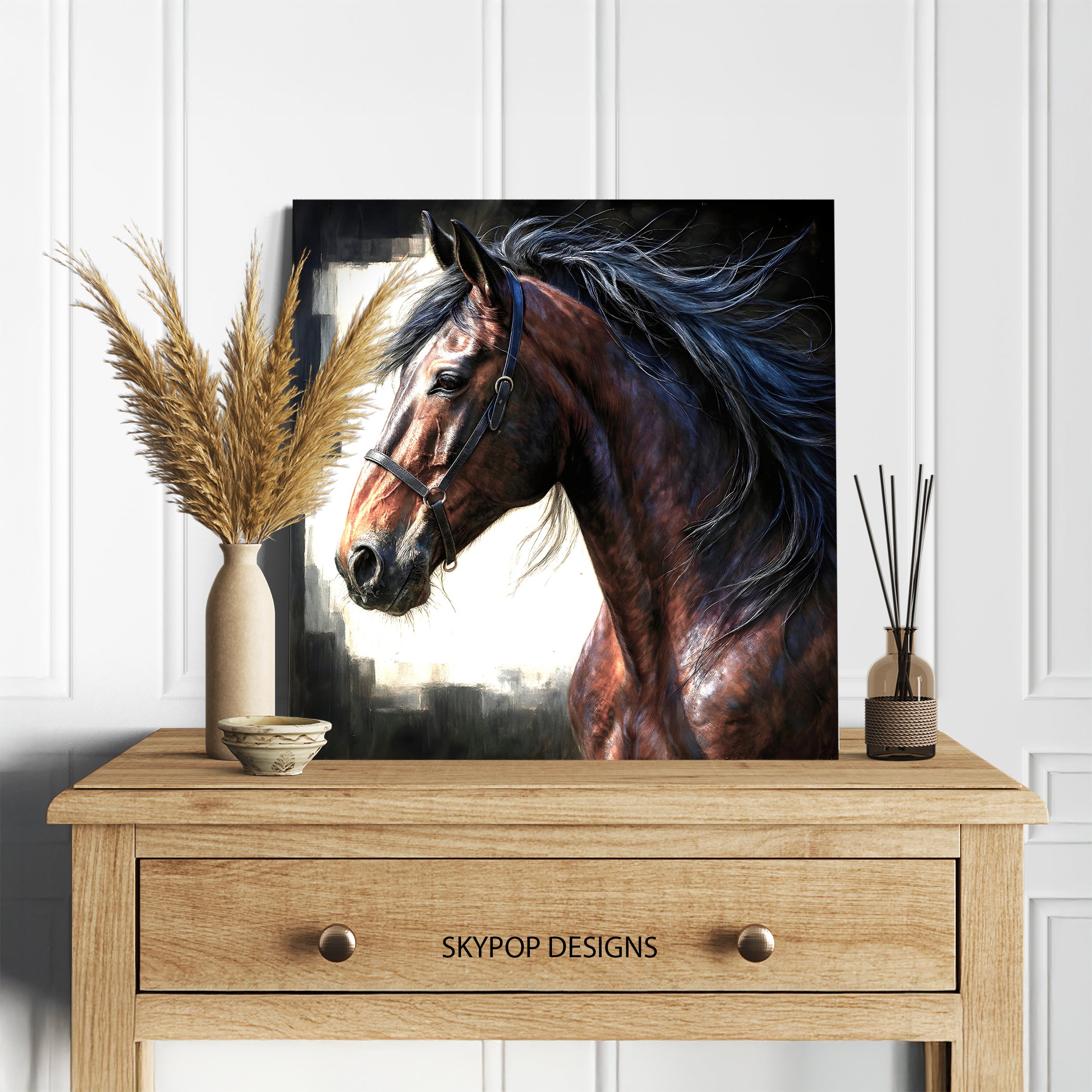 Elevate your space with this stunning horse canvas wall art featuring a powerful and majestic horse in profile. This captivating poster or canvas wall art showcases the animal's grace and strength with rich brown hues and dramatic contrast. The artwork's classic style and natural theme make it a perfect addition to traditional and rustic decors, while its striking composition also complements modern interiors. Ideal for living rooms, bedrooms, or offices, this piece will transform any area into a sophisticated sanctuary. The deep browns and blacks evoke a sense of grounded power, while the bright whites and greys add a touch of ethereal light, creating a visually dynamic experience. This horse poster or canvas wall art is perfect for horse enthusiasts, equestrian lovers, or anyone who appreciates fine animal art. It's an ideal gift for birthdays, housewarmings, or holidays, bringing a touch of timeless elegance to any home. Showcase your passion for nature and these magnificent creatures with this high-quality canvas wall art. This striking artwork enhances your decor, creating a focal point that inspires and captivates. Transform your environment with the enduring beauty of this horse artwork that celebrates the spirit of the wild. Make this breathtaking horse canvas wall art the centerpiece of your collection and experience its powerful presence daily.