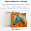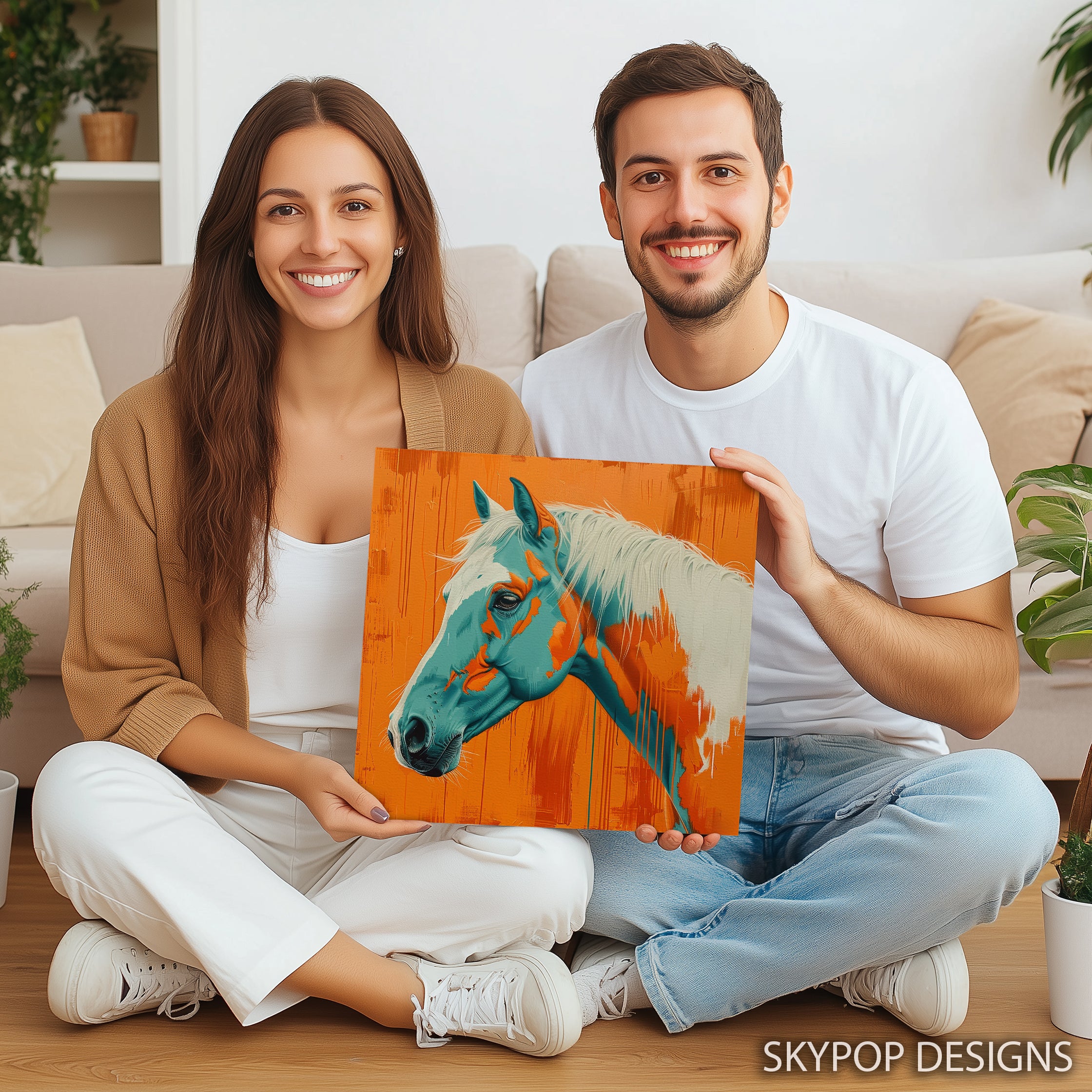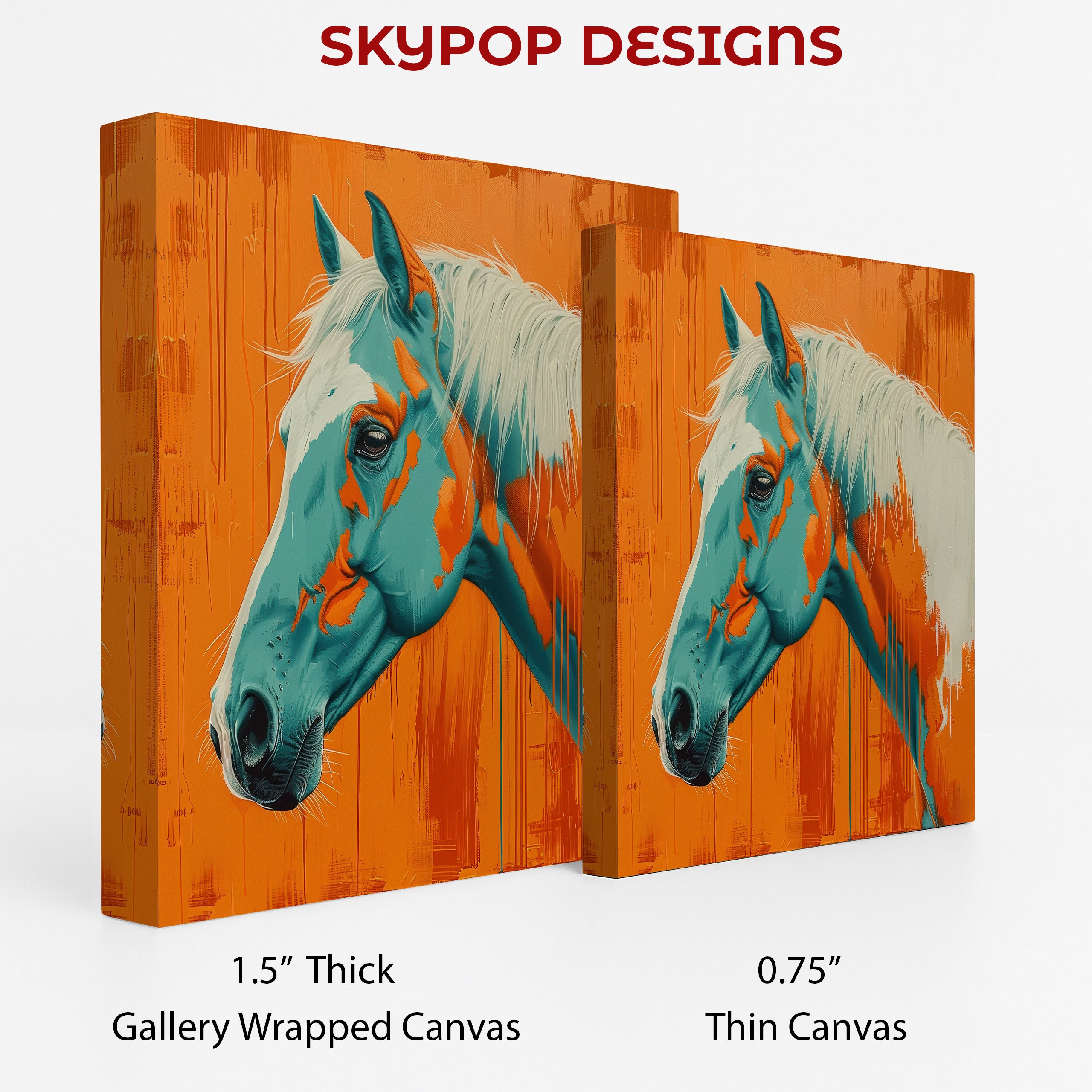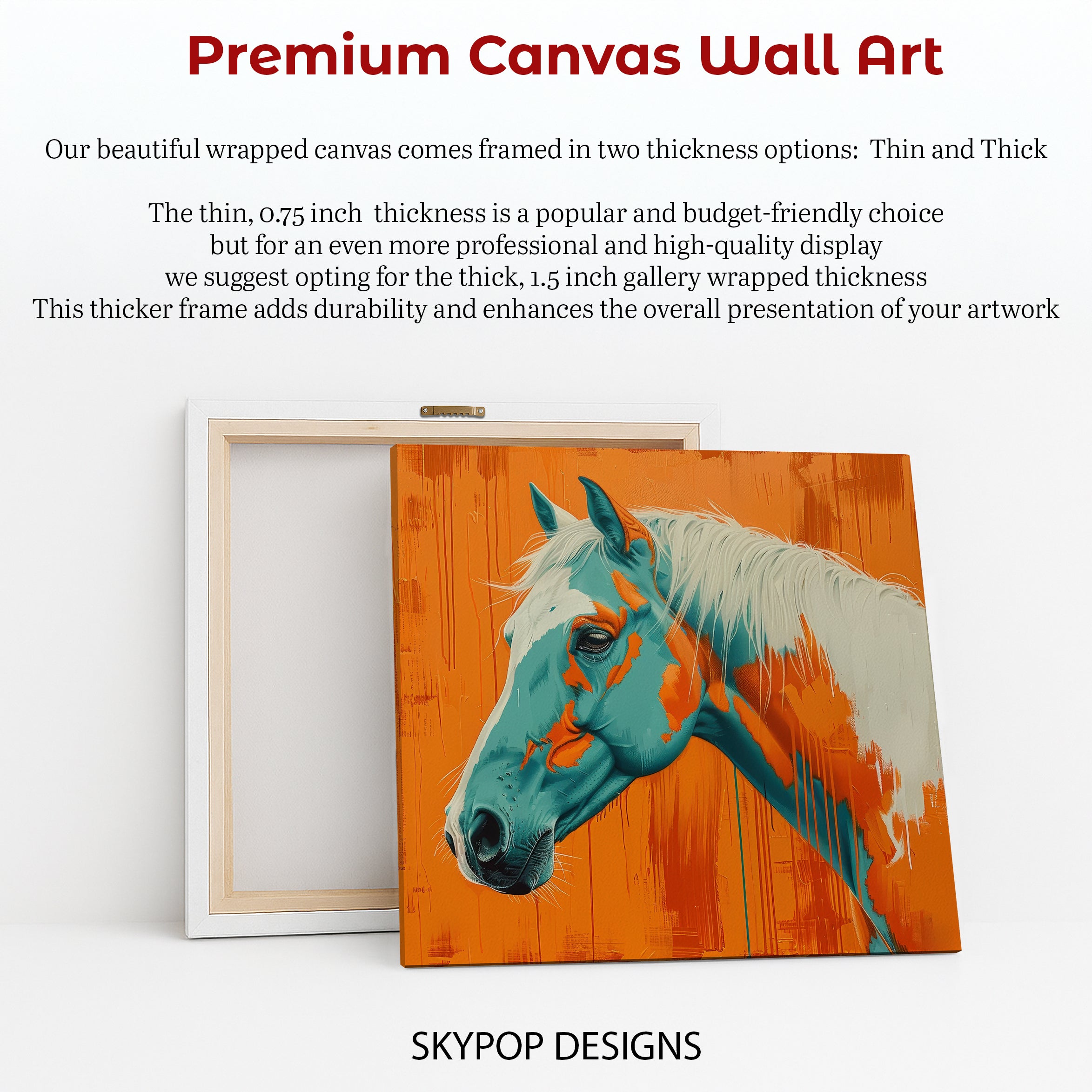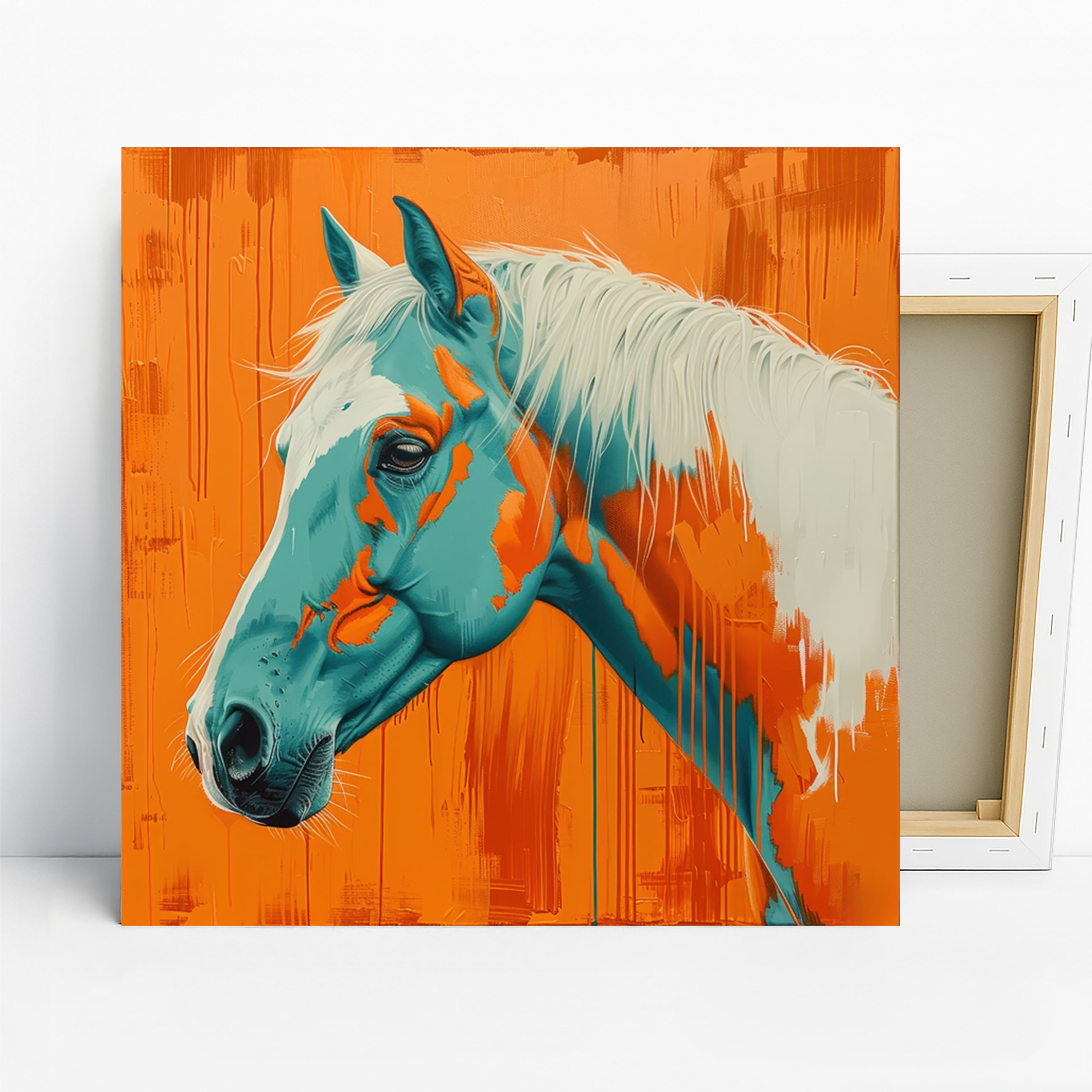 Keywords: abstract horse art, canvas wall art, modern decor, contemporary art, animal wall art, teal and orange art, multicolor wall art, horse portrait, living room art, bedroom wall art, office decor, entryway art, bold art, vibrant art, textured art, graphic art, statement art, wall decor, home decor, gift for art lovers, birthday gift, housewarming gift, unique wall art, artistic expression, passion art, dynamic art, sophisticated art, equine art, animal print, wall poster