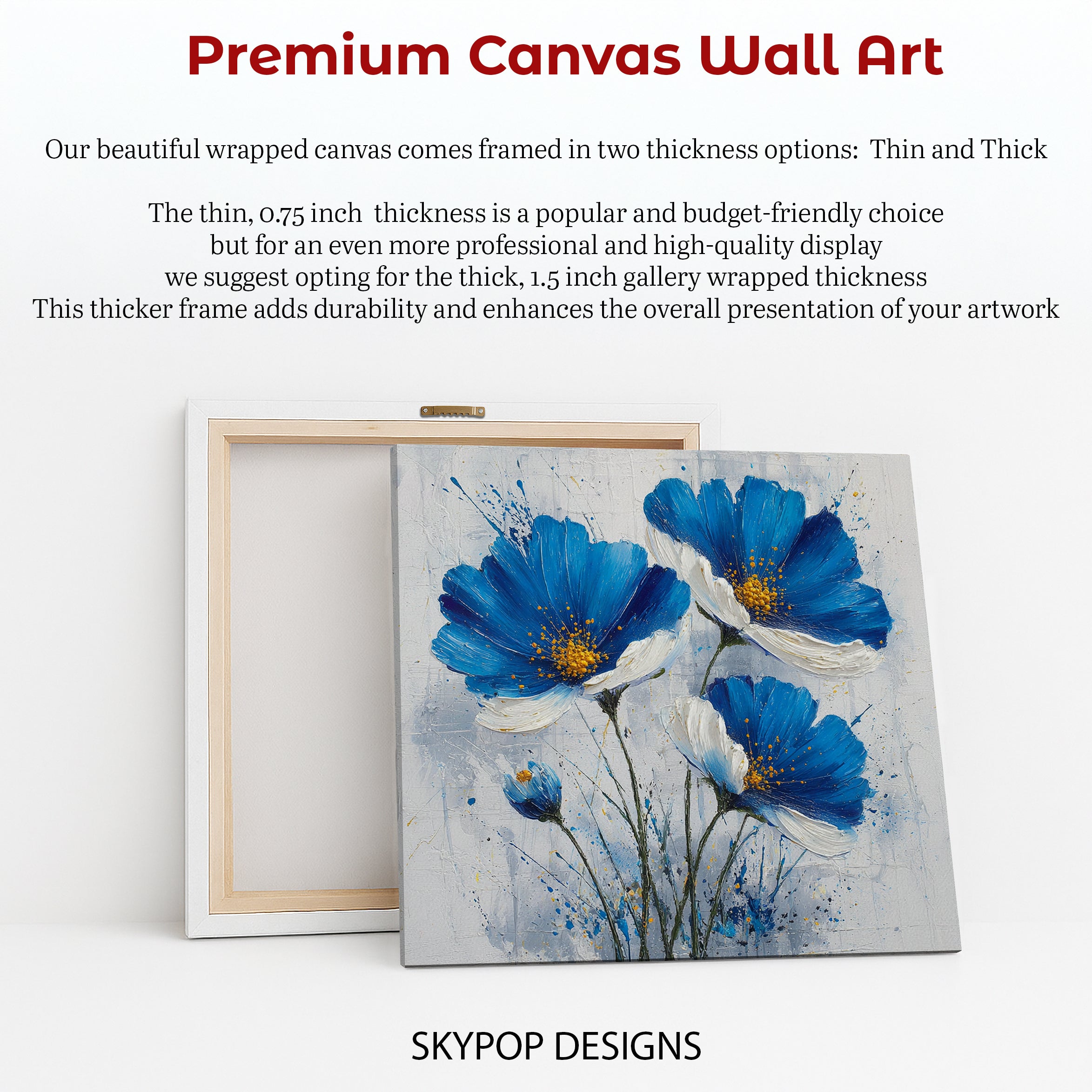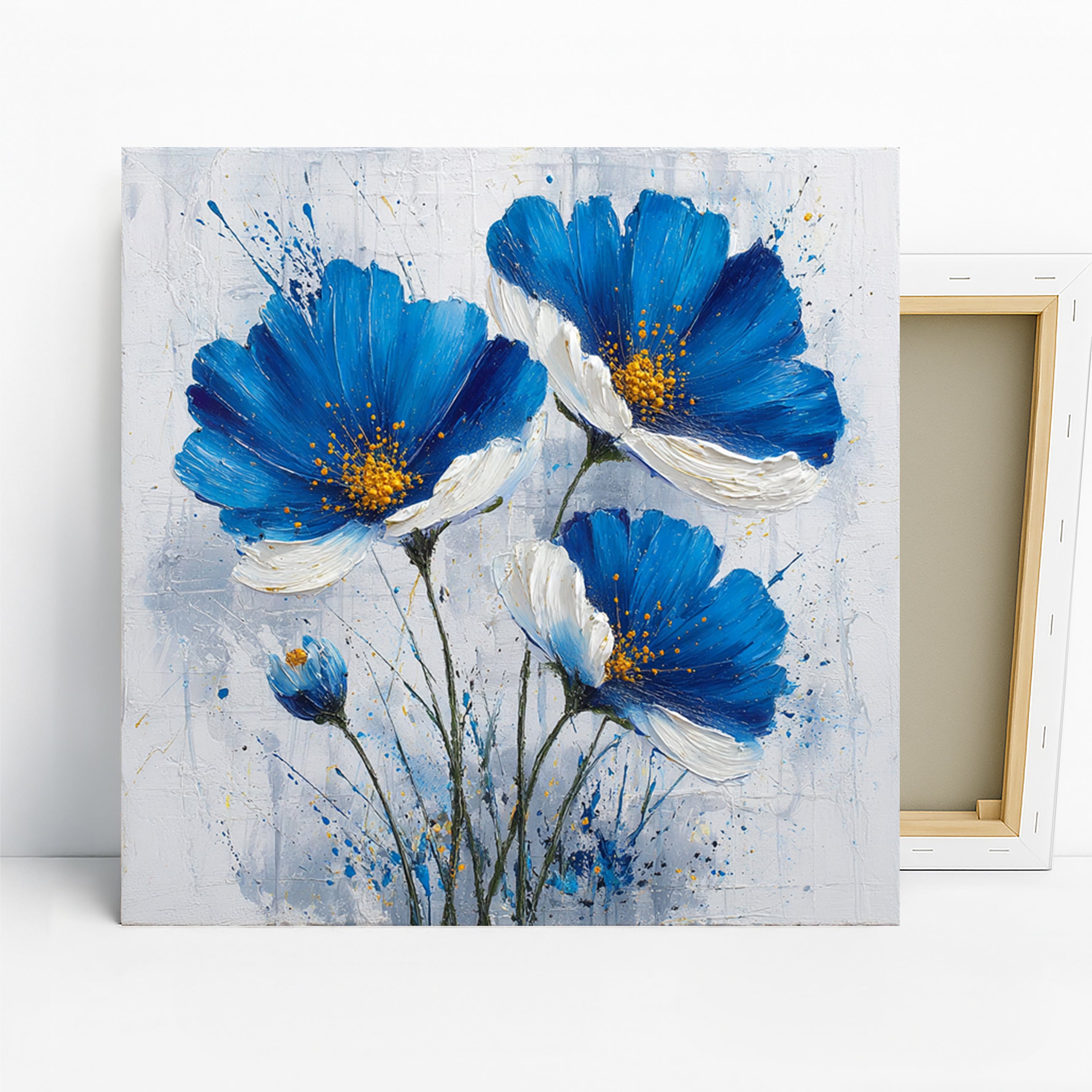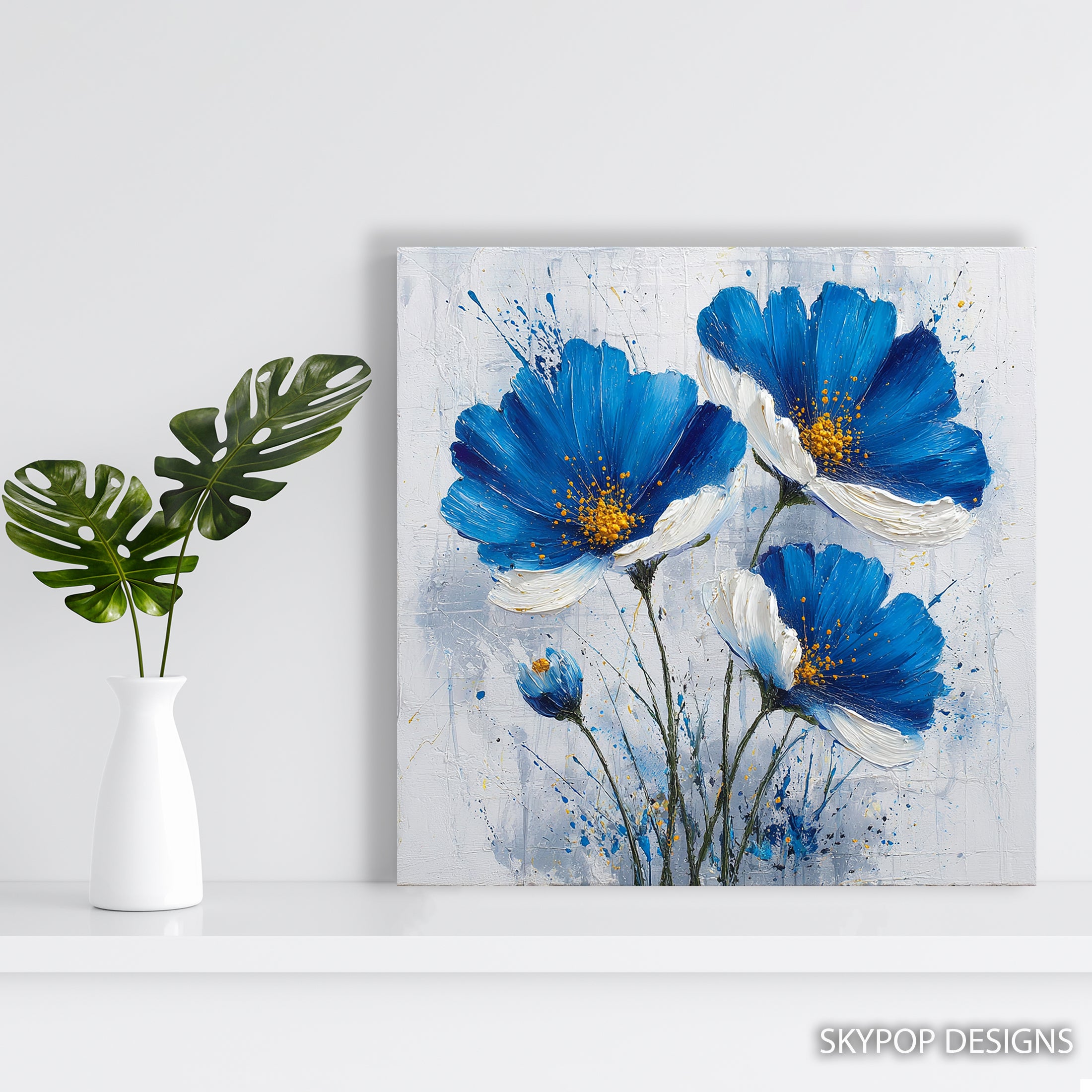 Elevate your space with this stunning blue floral canvas wall art, a captivating piece that brings the beauty of nature indoors. The bold blue and white flowers, accented with vibrant yellow detail, create a striking focal point for any room. This versatile poster or canvas wall art is perfect for contemporary living rooms, serene bedrooms, or elegant dining rooms. The impressionistic style, with its textured brushstrokes and dynamic splatters, adds a touch of modern sophistication to your home decor. The cool blue hues evoke a sense of calm and tranquility, while the pops of gold bring a touch of luxury and warmth. This flower art is ideal for anyone looking to enhance their space with natural beauty and vibrant color. Whether you prefer modern aesthetics or Scandinavian simplicity, this canvas wall art seamlessly blends with various decor styles. It's a perfect gift for housewarmings, birthdays, or any occasion where you want to share a piece of art that inspires joy and beauty. This high-quality poster and canvas printing captures the depth and texture of the original artwork, ensuring a lasting impression. Transform your home into a sanctuary of style and color with this breathtaking floral artwork. Add this eye-catching flower poster to your wall art collection and experience the uplifting power of nature's artistry.