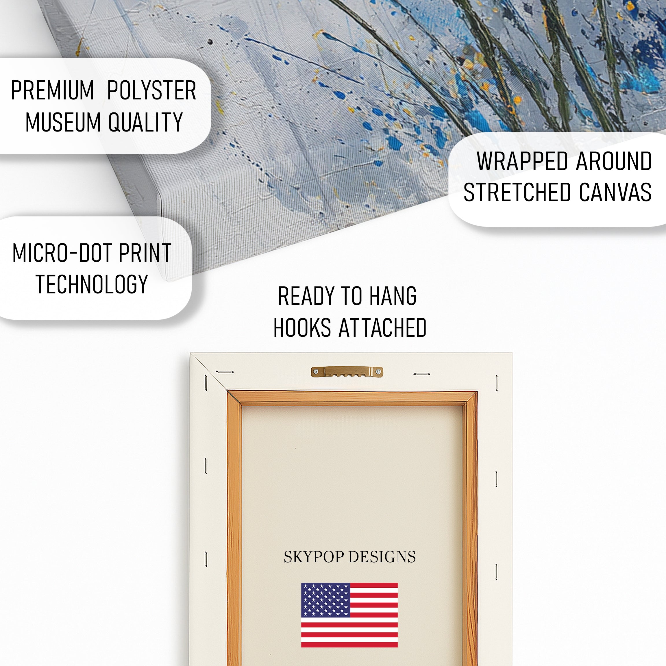 Keywords: Impressionism Art, Nature Art, Floral Art, Contemporary Decor, Modern Decor, Scandinavian Decor, Minimalist Decor, Living Room Art, Bedroom Art, Dining Room Art, Entryway Art, Blue Wall Art, White Wall Art, Gold Accent Art, Grey Color Palette, Vibrant Blue Flowers, Yellow Floral Detail, Canvas Wall Art, Floral Poster, Textured Brushstrokes, Dynamic Splatters, Modern Sophistication, Calm Atmosphere, Tranquil Decor, Luxury Home Decor, Housewarming Gift, Birthday Gift, Wall Art Collection, Nature's Artistry, Home Decor Enhancement