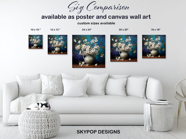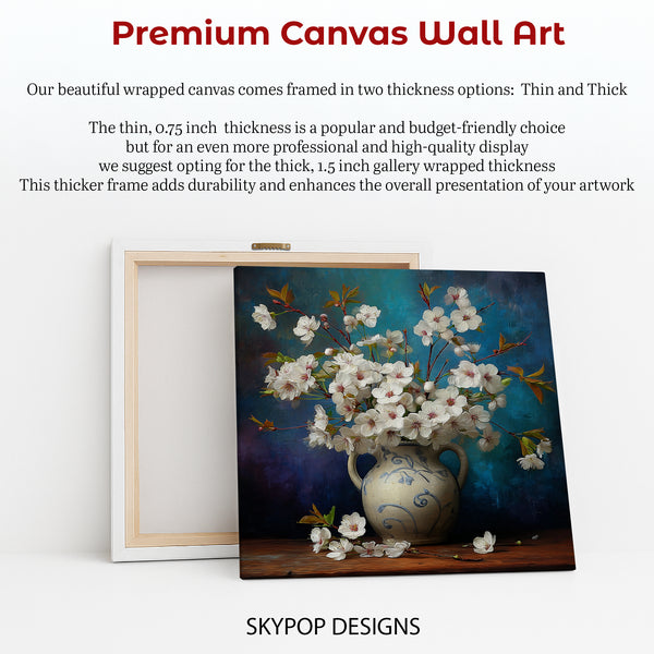 Transform your space with this stunning cherry blossom canvas wall art featuring delicate white flowers artfully arranged in a beautiful vase. This captivating poster art brings the beauty of nature indoors, perfect for creating a serene atmosphere in your living room or bedroom. The vibrant blue background and earthy brown tones of the wooden surface create a striking contrast, enhancing the intricate details of the floral arrangement. This piece is ideal for Scandinavian, modern, or farmhouse decor styles, effortlessly elevating your interior design. Use this versatile wall art to add a touch of natural elegance to your dining room or kitchen, creating a welcoming and refreshing ambiance. The impressionistic style adds a painterly quality, making this canvas wall art a true statement piece. Celebrate the beauty of spring and nature all year round with this inspiring floral artwork. It’s a perfect gift for housewarmings, birthdays, or any occasion. High-quality printing ensures the vibrant colors and delicate textures are captured beautifully. Elevate your home's aesthetic with this timeless cherry blossom poster, destined to be a cherished addition to your wall art collection. Bring a breath of fresh air and sophisticated style into any room of your home today.