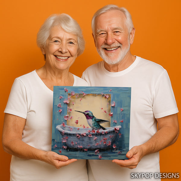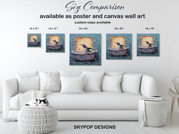 Keywords: Hummingbird Art, Petal Bath Art, Canvas Wall Art, Impressionism Art, Nature Art, Whimsical Art, Bohemian Decor, Modern Decor, Contemporary Decor, Bathroom Art, Living Room Art, Bedroom Art, Nursery Art, Blue Artwork, Pink Artwork, Teal Artwork, Multicolor Art, Hummingbird Painting, Wall Decor, Home Decor, Art Print, Gift for Nature Lover, Housewarming Gift, Birthday Gift, Holiday Gift, Tranquil Artwork, Joyful Decor, Enchanting Art, Wall Poster, Fine Art