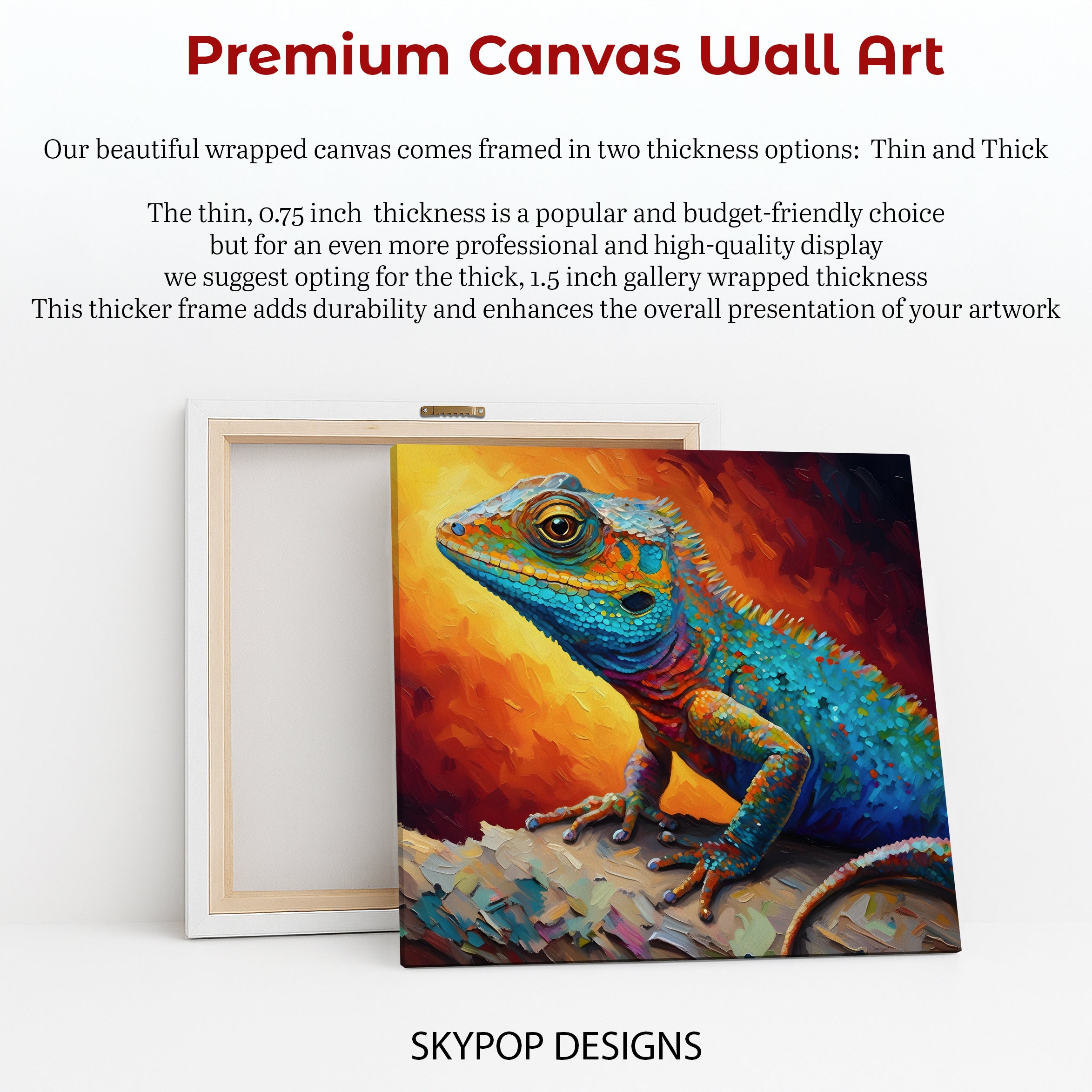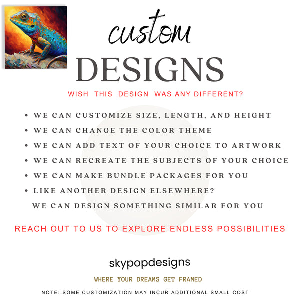 Keywords: Lizard wall art, Animal canvas print, Multicolor art, Orange blue yellow art, Contemporary art, Impressionism canvas, Bohemian decor, Modern wall art, Eclectic home decor, Living room art, Bedroom art, Office wall decor, Entryway art, Vibrant lizard art, Textured canvas, Bold brushstrokes, Colorful animal print, Nature art print, Reptile enthusiast gift, Unique wall decor, Statement art piece, Home decor inspiration, Relaxing art, Energetic decor, Wild beauty art, Nature lover gift, Modern interior design, Eclectic style art, Artistic lizard painting, Eye-catching wall art