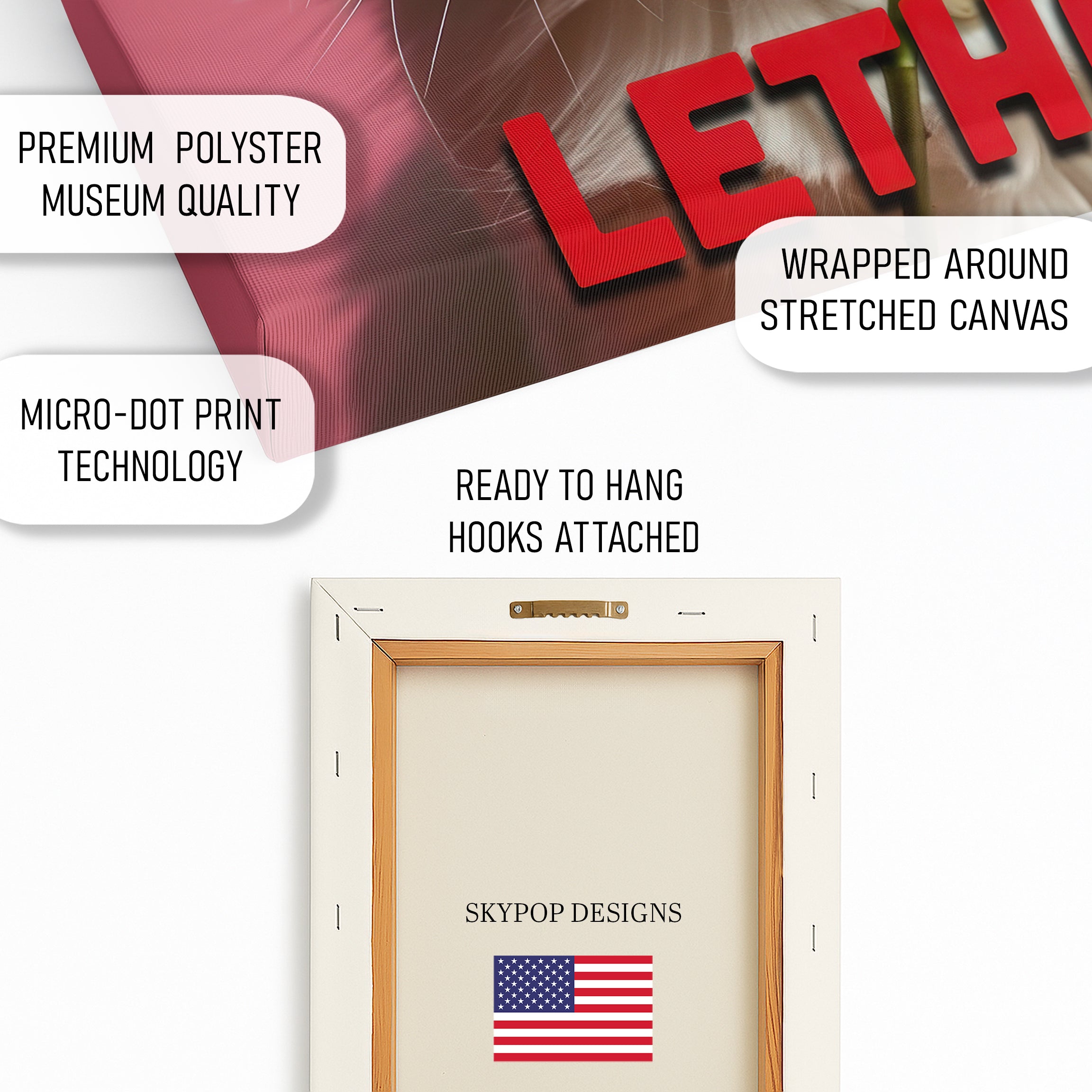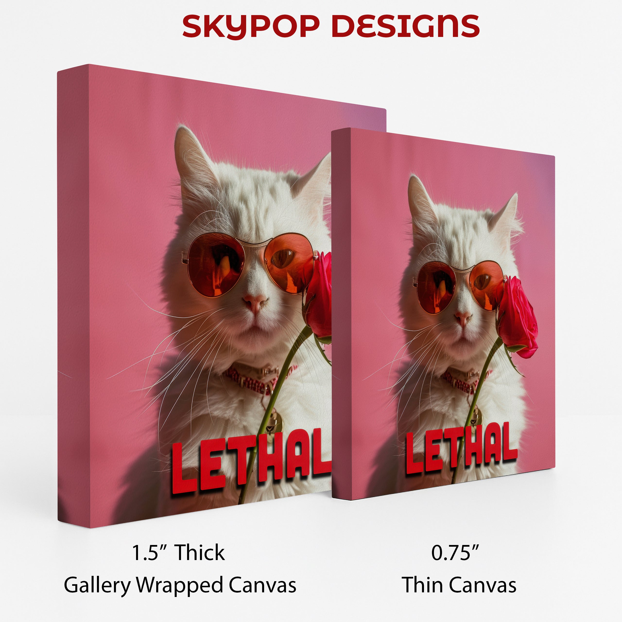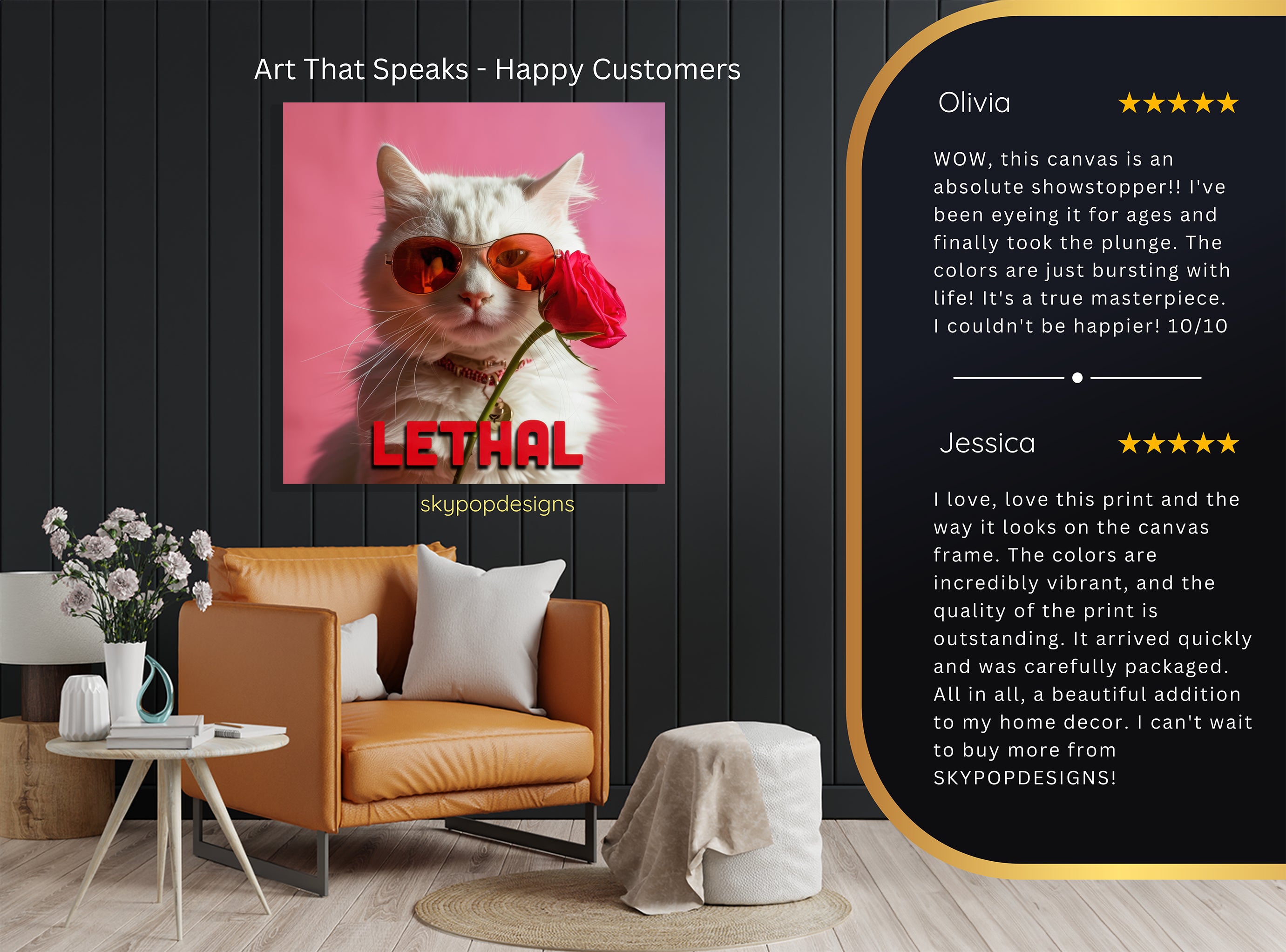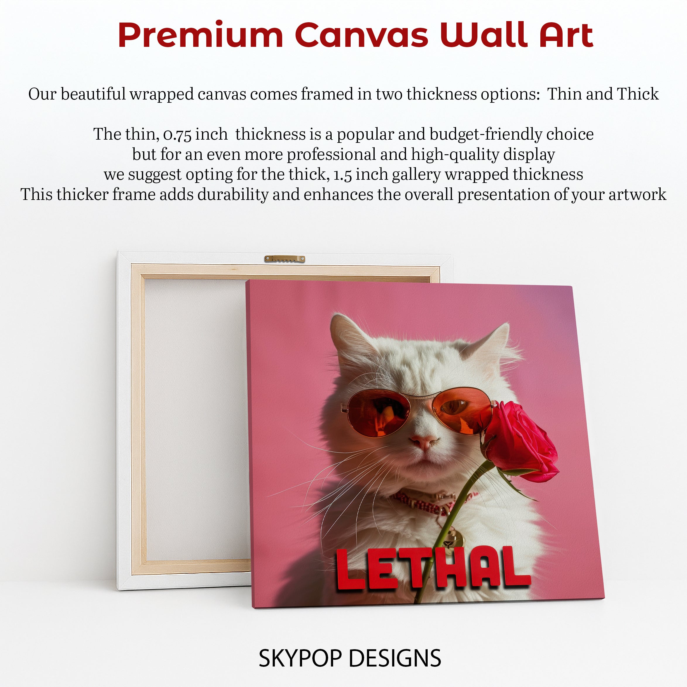 Transform your space with this striking cat canvas wall art featuring a stylish white cat wearing sunglasses and holding a red rose. This captivating piece of pop art instantly elevates any room with its bold colors and playful attitude. The vibrant pink background paired with the red rose and dramatic sunglasses creates a striking visual that’s sure to be a conversation starter. This high-quality poster or canvas wall art is perfect for jazzing up a modern living room, a chic bedroom, or even a fun kitchen. The whimsical nature of this cat artwork brings personality and a touch of glam to your everyday decor. Imagine the chic vibe this print adds to your bohemian-inspired space or how it can be a focal point in a contemporary setting. The bold red lettering stating "LETHAL" adds an edgy, confident feel to this unique cat poster. This versatile wall art is not only a fantastic way to express your love for cats but also makes an ideal gift for birthdays, holidays, or housewarmings for anyone who appreciates unique art and bold statements. It's a stunning way to enhance your home's atmosphere and showcase your individual style. Make a statement with this eye-catching canvas wall art today and inject some serious personality into your home decor. This piece is designed to inspire joy and confidence, making it a must-have addition to your art collection, offering a touch of luxury and undeniable charisma.
