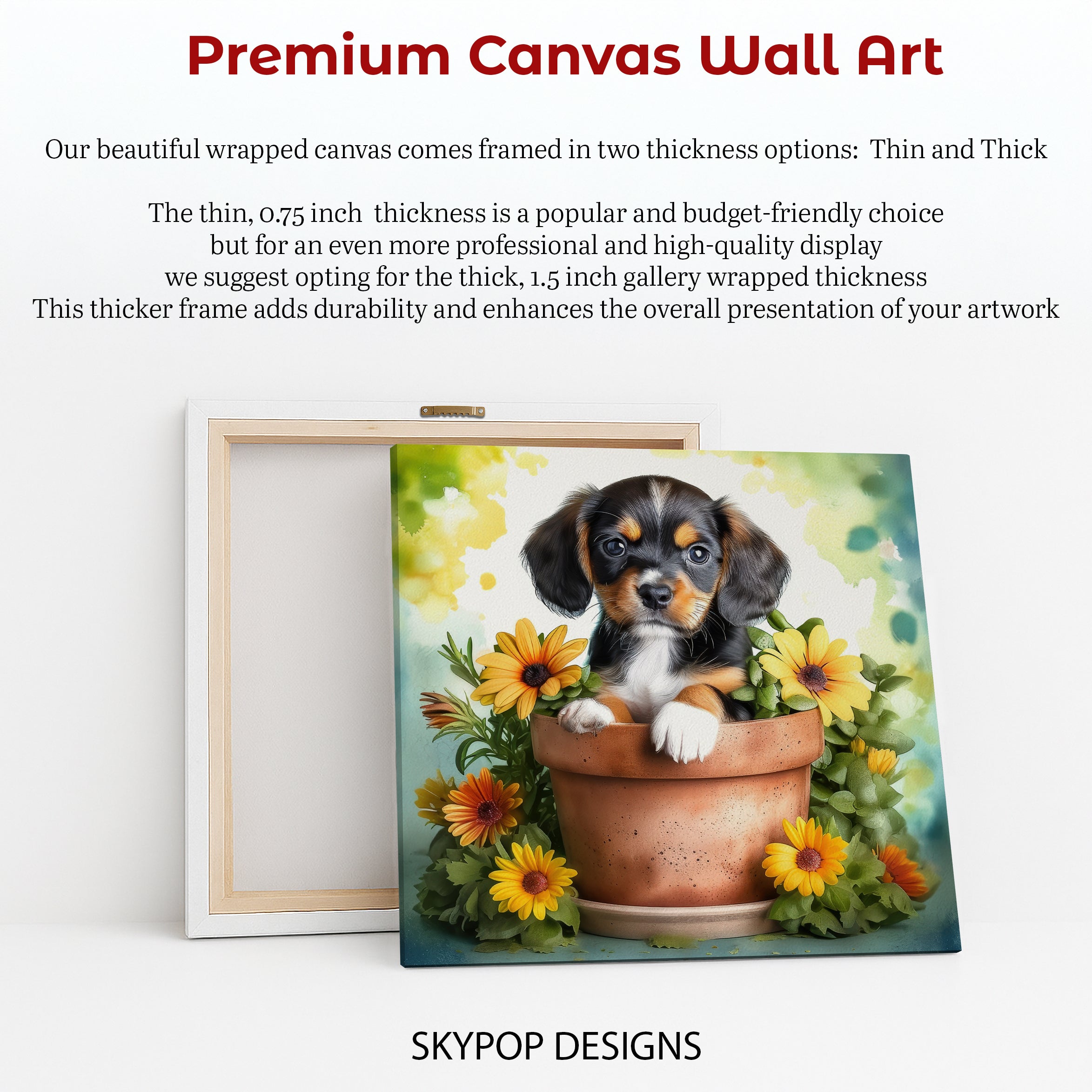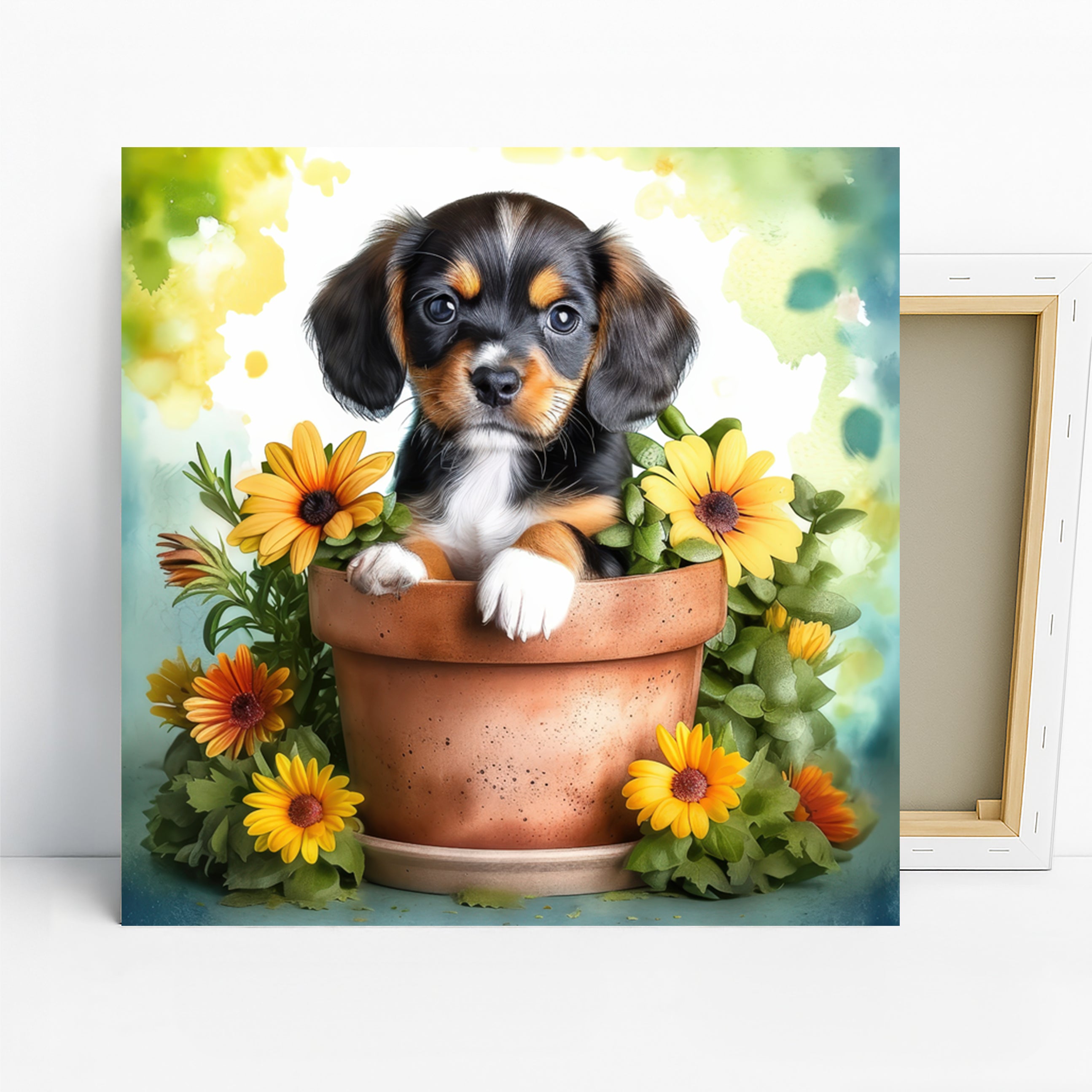 Keywords: Puppy in Flower Pot Art, Cavalier King Charles Spaniel Art, Dog Wall Art, Pet Lover Gift, Animal Canvas Print, Whimsical Art, Nature Art, Bohemian Decor, Farmhouse Decor, Modern Decor, Yellow Daisy Art, Green Plant Art, Brown Terracotta Pot, Multicolor Flowers, Living Room Art, Children's Room Decor, Bedroom Wall Art, Kitchen Decor, Springtime Art, Cute Puppy Poster, Dog Mom Gift, Dog Dad Gift, Housewarming Gift, Birthday Gift for Dog Lover, Playful Wall Art, Cheerful Home Decor, Happy Wall Art, Pet Art Print, Floral Dog Art, Canvas Wall Art Poster